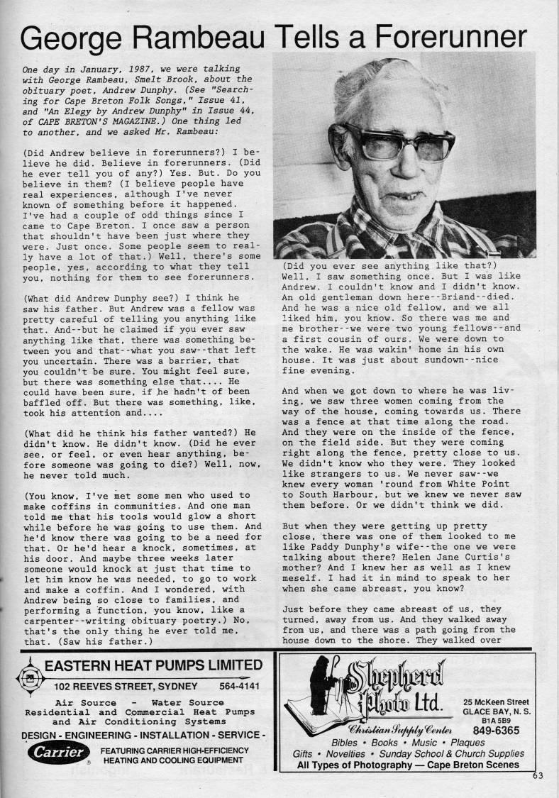 George Rambeau Tells a Forerunner One day in January, 1987, we were talking with George Rambeau, Smelt Brook, about the obituary poet, Andrew Dunphy. (See "Search? ing for Cape Breton Folk Songs," Issue 41, and "An Elegy by Andrew Dunphy" in Issue 44, of CAPE BRETON'S MAGAZINE.) One thing led to another, and we asked Mr. Rambeau: (Did Andrew believe in forerunners?) I be? lieve he did. Believe in forerunners. (Did he ever tell you of any?) Yes. But. Do you believe in them? (I believe people have real experiences, although I've never known of something before it happened. I've had a couple of odd things since I came to Cape Breton. I once saw a person that shouldn't have been just where they were. Just once. Some people seem to real? ly have a lot of that.) Well, there's some people, yes, according to what they tell you, nothing for them to see forerunners. (What did Andrew Dunphy see?) I think he saw his father. But Andrew was a fellow was pretty careful of telling you anything like that. And--but he claimed if you ever saw anything like that, there was something be? tween you and that--what you saw--that left you uncertain. There was a barrier, that you couldn't be sure. You might feel sure, but there was something else that.... He could have been sure, if ,he hadn't of been baffled off. But there was something, like, took his attention and.... (What did he think his father wanted?) He didn't know. He didn't know. (Did he ever see, or feel, or even hear anything, be? fore someone was going to die?) Well, now, he never told much. (You know, I've met some men who used to make coffins in communities. And one man told me that his tools would glow a short while before he was going to use them. And he'd know there was going to be a need for that. Or he'd hear a knock, sometimes, at his door. And maybe three weeks later someone would knock at just that time to let him know he was needed, to go to work and make a coffin. And I wondered, with Andrew being so close to families, and performing a function, you know, like a carpenter--writing obituary poetry.) No, that's the only thing he ever told me, that. (Saw his father.) (Did you ever see anything like that?) Well, I saw something once. But I was like Andrew. I couldn't know and I didn't know. An old gentleman down here--Briand--died. And he was a nice old fellow, and we all liked him, you know. So there was me and me brother--we were two young fellows--and a first cousin of ours. We were down to the wake. He was wakin' home in his own house. It was just about sundown--nice fine evening. And when we got down to where he was liv? ing, we saw three women coming from the way of the house, coming towards us. There was a fence at that time along the road. And they were on the inside of the fence, on the field side. But they were coming right along the fence, pretty close to us. We didn't know who they were. They looked like strangers to us. We never saw--we knew every woman 'round from White Point to South Harbour, but we knew we never saw them before. Or we didn't think we did. But when they were getting up pretty close, there was one of them looked to me like Paddy Dunphy's wife--the one we were talking about there? Helen Jane Curtis's mother? And I knew her as well as I knew meself. I had it in mind to speak to her when she came abreast, you know? Just before they came abreast of us, they turned, away from us. And they walked away from us, and there was a path going from the house down to the shore. They walked over EASTERN HEAT PUMPS LIMITED 102 REEVES STREET, SYDNEY 564-4141 Air Source - Water Source Residential and Commercial Heat Pumps and Air Conditioning Systems DESIGN - ENGINEERING - INSTALLATION - SERVICE - FEATURING CARRIER HIGH-EFFICIENCY HEATING AND COOLING EQUIPMENT 25 McKeen Street GLACE BAY, N. S. B1A5B9 849-6365 Bibles * Books • Music • Plaques Gifts • Novelties • Sunday School & Church Supplies All Types of Photography • Cape Breton Scenes