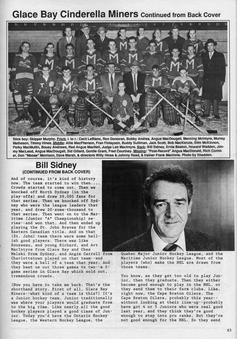 Published by Ronald Caplan on 1989/2/1 (587 reads)Glace Bay Cinderella Miners continued from Back cover Stick boy: Skipper lUlurphy. Front. I. to r.: Cecil LeBlanc, Ron Donovan, Bobby Andrea, Angus IVIacDougall, l/lanning IVIclntyre, l/lurray l/latheson, Timmy Mines. iVIiddle: Alfie iVlacPiierson, Fran FInlayson, Buddy Sulliman, Jack Scott, Bob fUlacKenzie, Slim l/icKinnon, Porky IViaciUlullin, Bouey Andrews, Red Angus i/lacNeil, Judge Leo iVIaclntyre. Back: Bili Sidney, Ernie Beaton, Howard Wadden, Jim? my MacLeod, Angus iWacDougaii, Sid Gillard, Gordie Grant, Fred Courtney. Missing: "Post-Record" Angus i/lacDonald, Ricii Cormi? er, Don "ivioose" iViorrison, Dave iViarsh, & directors Wiily Mines & Johnny Read, & trainer Frank Maclnnis. Photo by Shedden. Bill Sidney (CONTINUED FROM BACK COVER) And of course, it's kind of history now. The team started to win then.... Crowds started to come out. Then we knocked off North Sydney (in the play-offs) and drew 29.000 fans for that series. Then we knocked off Syd? ney who were the league leaders that year, and drew 20-some-thousand to that series. Then went on to the Mar? itime (Junior "A" Championship) se? ries- -and won that. And then ended up playing the St. John Braves for the Eastern Canadian title. And on that (St. John) team there were some hell? ish good players. There was like Rousseau, and young Richard, and Art Maclntyre from Glace Bay and Ches Melski from Sydney, and Angie Carroll from Charlottetown played on that team--and they were a hell of a team that year. And they beat us out three games to two--a 5- game series in Glace Bay which sold out, tremendous crowds. (Now you have to take me back. That's the shorthand story. First of all. Glace Bay Miners--what kind of a team is this?) It's a Junior hockey team. Junior traditionally was where your players would graduate from to the big time. Like nearly all the good hockey players played a good class of Jun? ior. Today you'd have the Ontario Hockey League, the Western Hockey League, the Quebec Major Junior Hockey League, and the Maritime Junior Hockey League. Most of the players (who) make the NHL are drawn from those teams. You know, as they get too old to play Jun? ior, then they graduate. Then they either become good enough to play in the NHL, or they send them to their farm clubs. Like, right now, the Cape Breton Oilers. The Cape Breton Oilers, probably this year-- without looking at their line-up--probably have got 4 or 5 Juniors who were real good last year, and they think they're good enough to step into pro ranks. But they're not good enough for the NHL. So they send