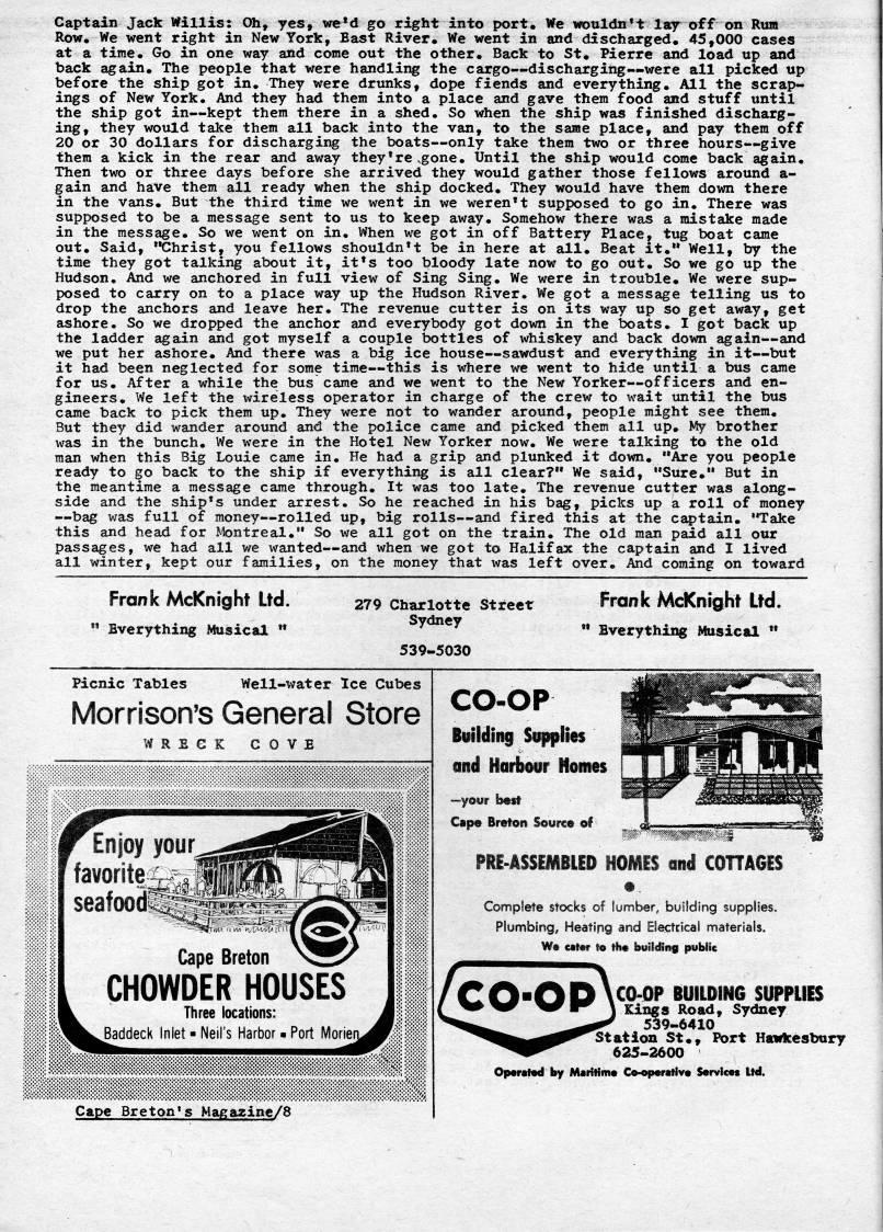 Published by Ronald Caplan on 1975/6/1 (403 reads)Captain Jack Willis: Oh, yes, we'd go right into port. We wouldn't lay off on Rura Row. We went right in New York, East River. We went in and discharged. 45,000 cases at a time. Go in one way and corae out the other. Back to St* Pierre and load up and back again* The people that were handling the cargo • discharging • were all picked up before the ship got in. They were drunks, dope fiends and everything. All the scrap? ings of New York. And they had thera into a place and gave thera food and stuff until the ship got in • kept thera there in a shed. So when the ship was finished discharg? ing, they would take them all back into the van, to the same place, and pay them off 20 or 30 dollars for discharging the boats • only take thera two or three hours • give thera a kick in the rear and away they're .gone. Until the ship would corae back again. Then two or three days before she arrived they would gather those fellows around a- gain and have thera all ready when the ship docked. They would have thera down there in the vans. But the third time we went in we weren't supposed to go in. There was supposed to be a message sent to us to keep away. Somehow there was a mistake raade in the message. So we went on in. When we got in off Battery Place, tug boat carae out. Said, "Christ, you fellows shouldn't be in here at all. Beat it." Well, by the tirae they got talking about it, it's too bloody late now to go out. So we go up the Hudson. And we anchored in full view of Sing Sing. We were in trouble. We were sup? posed to carry on to a place way up the Hudson River. We got a message telling us to drop the anchors and leave her. The revenue cutter is on its way up so get away, get ashore. So we dropped the anchor and everybody got down in the boats. I got back up the ladder again and got myself a couple bottles of whiskey and back down again • and we put her ashore. And there was a big ice house • sawdust and everything in it • but it had been neglected for some tirae • this is where we went to hide until a bus carae for us. After a while the bus came and we went to the New Yorker • officers and en? gineers. We left the wireless operator in charge of the crew to wait until the bus came back to pick thera up. They were not to wander around, people might see them. But they did wander around and the police came and picked them all up. My brother was in the bunch. We were in the Hotel New Yorker now. We were talking to the old raan when this Big Louie came in. He had a grip and plunked it down. "Are you people ready to go back to the ship if everything is all clear?" We said, "Sure." But in the meantime a message came through. It was too late. The revenue cutter was along? side and the ship's under arrest. So he reached in his bag, picks up a roll of money • bag was full of money • rolled up, big rolls • and fired this at the captain. "Take this and head for Montreal." So we all got on the train. The old man paid all our passages, we had all we wanted • and when we got to Halifax the captain and I lived all winter, kept our families, on the money that was left over. And coraing on toward Frank McKnight Ltd. Everything Musical " 279 Charlotte Street Sydney 539-5030 Frank McKnight Ltd. Everything Musical " Picnic Tables Well-water Ice Cubes Morrison's General Store WRECK COVE Enjoy your' ' favorite seafood C Cape Breton CHOWDER HOUSES Three locations: .Baddeck Iniet ?? Neii's Harbor ?? Port Morieri Cape Breton's Magazine/8 CO-OP Btfilding Sufiplies and Harbour Homes • yowr best Cape Breton Source of FUE-ASSEMBLED HOMES iiiiil COHAGES Complete stocks of lumber, building suppiies. Plumbing, Heating and Electcical materials. W? cater to th? building public CO"OD <'0-0P BUILDING SUPPLIES '' '' '' ' 1 Kings Road, Sydney 539-6410 Station St*y Port Hawkesbury 625-2600 Op?rat9d by Maritime C • p?ratlv? Servlcas Ltd.