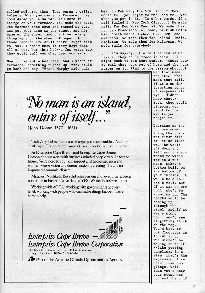Published by Ronald Caplan on 1989/8/1 (241 reads)called melters, then. They weren't called helpers. When you ran your furnace, they considered you a melter. You were in charge of your furnace. You made the heat. The foreman came down and tapped it out, and put your name on the sheet, and his name on the sheet. And the time--every? thing went on the sheet of paper. And those records are still there, right back to 1901. I don't know if they kept them all or not, but they had--a few years ago, they could tell you what heat you made. Now, if we got a bad heat. And 5 years af? terwards, something turned up, they could go back and say, "Frank Murphy made this heat on February the 5th, 1955." They could tell you right to the--and tell you what you put in it. (In other words, if a rail failed in New York City....) We made rails for New York Central. We made them for San Francisco Railroad, British Colum? bia, North Shore Quebec, CNR. CPR. And overseas, we made them for Poland, India, Pakistan. We made them for Malaysia. We made rails for everybody. (But I'm saying, if a rail failed in Ma? laysia, they could trace it back....) Right back to the heat number. 'Cause eve? ry rail that went out of here had the heat number on it. "No man is an island, entire of itself..? (John Donne, 1572-1631) Today's global marketplace enlarges our opportunities. And our challenges. The spirit of teamwork has never been more important. At Enterprise Cape Breton and Enterprise Cape Breton Corporation we work with business-minded people to build for the future. We're here to counsel, support and encourage men and women whose vision and determination is creating jobs and an improved economic climate. Miracles.'' Not likely. But solid achievement and, over time, a better way of life in Eastern Nova Scotia.'' YES. We firmly believe in that. Working with ACOA; working with governments at every level, working with people who can make things happen, we're here to help. Enterprise Cape Breton • ' Enterprise Cape Breton Corporation P.O. Box 2001, Commerce Tower, 15 Dorchester Street, Sydney, NovaScotia B1P6K7 564-3614 MW Part of the Atlantic Canada Opportunities Agency (And to the person who....) I Man that made the steel that I made that rail. (That's an in- Iteresting sense of responsibili? ty; I didn't know that.) Yeah, they could pinpoint you right to the minute you tapped it. Learning on the job was some? thing that, when the first help? er- -if he liked you--he would sit down and tell you the ac? tions, to watch for in a fur? nace. Like, a bottom boil, on the bottom of your furnace, it would be a roll. She'd roll. But if it was an ore boil, she'd be shooting up. The sparks would be coming up through the steel. And.if it was a stone boil, you'd see it getting thick on the top. You'd have to put fluorspar in to cut it up. The stone'd be making it thick --like putting dumplings in a stew. That's the expression I've used: like dum? plings. Well, then you'd know your stone was up. And then, if