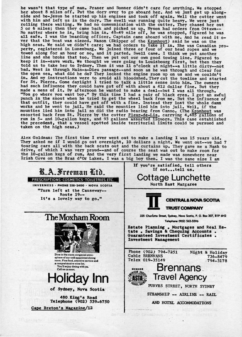 Published by Ronald Caplan on 1975/6/1 (364 reads)he wasn't that type of man. Fraser and Bonner didn't care for anything. We stopped her about 8 railes off. Put the dory over to go aboard her. And vjq just got up along? side and be-Jesus he started up his engines and took off again. Well the cutter went with hira and left us in the dory. The swell was running quite heavy. We were just rolling there waiting. We had no coraraunication with the cutter. They chased her out 5 or 6 railes; then they carae back and picked us up. Hyson had orders from Ottawa- No raatter where he is, bring hira in. 48-49 raile off, he was stopped, figured he was all safe. I was the boarding officer. Captain came aboard with rae. And he read it o- ver that the boat was siezed. Mason (Skipper of the Krorahout) said he was on the high seaso We said we didn't care; we had orders to take it in. She was Canadian pro? perty, registered in Lunenburg. We joined three or four of our head ropes and we towed along for an hour or so, and it parted. Swell came. I think we put another line and she broke that too. Then we put out our own good towing line. Figured to keep it in • save work. We thought we were going to Louisbourg first, but then they told us to take her to Sydney. Then it was 11 o'clock at night • a little dirty • not bad. Went in through Main-a-Dieu passage • and soon as he was through and clear for the open sea, what did he do? They locked the engine roora up on us and we couldn't in. And ray instructions were to avoid all bloodshed. They cut the towline and started for St. Pierre. Corae daylight I tried to talk a little sense into him. The owners had such influence they could have got off with about a 412 dollar fine. But they made a mess of it. By afternoon he wanted to raake a deal • but I was all through. "You go where you want boy." By this tirae I had a pair of black eyes. I got an awful punch in the snout when he tried to get the wheel back frora me. But the influence of that outfit, they could have got off with a fine. Instead they lost the whole damn works and he went to jail. He said the raounties lied hira into jail. Well, if the raounties lied hira into jail so did the radio bearing frora Canso. (The Krorahout was escorted back frora St. Pierre by the cutter Pleur-de-Lis, carrying 4,485 gallons of rura in 5- and 10-gallon kegs, and 93 gallons assorted liquors. This case established the precedent, that a vessel spotted inside territorial liraits could be pursued and taken on the high seas.) Alex Goldraan: The first tirae I ever went out to raake a landing I was 15 years old. They asked rae if I would go out overnight, 10 dollars a night. We went out • we had 7 touring cars all with the back seats out and the curtains up. They gave me a Nash to drive, of which I was very proud • and of course the seat was out to raake roora for the 10-gallon kegs of rum. And the very first landing we raade was soraewhere near Irish Cove on the Bras d'Or Lakes. I was a big boy then. I was the same size I ara KA3rnmm ICtb. PRESCRIPTIONSCOSMETICSTOiLETRIES.ETC. INVERNESS • PHONE 258-24O0 • NOVA SCOTIA "Turn left at the Causeway • Route 19 • It's a lovely way to go." The Moxham Room Din. in tha warm congenial atmo- iphere of our well-appointed dininc room. Fine food, attentive service and • comprehensive wine list. You'll enjoy dining with ut. Call on us soon. Holiday Inn of Sydney, Nova Scotia 480 King's Road Telephone (902) 539-6750 Cape Breton's Magazine/12 If you're satisfied, tell others If not...tell us. Cottage Lunchette North East Margaree CEIMTRAL& NOVA SCOTIA TRUSTCOMm IMY 225 Chorrotta Straet, Sydney. Nova Scotio, P. 0. Box 307, BIP 6H2 Telephone (902) 562-5596 Estate Planning ? Mortgages and Real Es? tate • Savings & Chequing Accounts • Guaranteed Investment Certificates . Investment Management Phone (902) 794-7251 Cable BRENNANS Telex 019-35149 Night & Holiday 736-8479 794-3178 Brennans Travel Agency PURVES STREET, NORTH SYDNEY STEAMSHIP • AIRLINE • RAIL AND HOTEL ACCOMMODATIONS