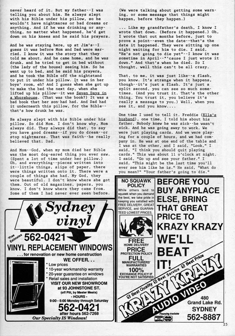 Published by Ronald Caplan on 1989/8/1 (269 reads)never heard of it. But my father--! was telling you about him. He always slept with his Bible under his pillow, so he wouldn't have nightmares or bad dreams or anything. And if he was drinking or any? thing, no matter what happened, he'd get down on his knees and he said his prayers. And he was staying here, up at Jim's--I guess it was before Mom and Dad were mar? ried. I know it was the story that they told me about. And he came home, and he was drunk, and he tried to get in bed without (the lady of the house) seeing him. So he went up to bed, and he said his prayers, and he took the Bible off the nightstand to put it under his pillow. It was in her boys' room, eh? And I guess when she got up to make the bed the next day, when she lifted up his pillow--it was Seven Days in a Whorehouse. (That was the book?) It was a bad book that her son had had. And Dad had it underneath this pillow, for the Bible-- that's how drunk he was. He always slept with his Bible under his pillow. So did Mom. I don't know why. Mom always did. They always did that, to say you have good dreams--if you do dream--or stop nightmares. That was faith--he really believed that. Dad. And Mom--God, when my mom died her Bible was the most dog-eared thing you ever saw. (Spent a lot of time under her pillow.) Oh, and everything--pieces written into it--little things, slips of paper, there were things written onto it. There were a couple of things she had. My God, they were beautiful. I don't know where she got them. Out of old magazines, papers, you know. I don't know where they came from. Some of them I had never ever seen before. Sydney VI -y 562-0421 VINYL REPLACEMENT WINDOWS ... for renovation or new home construction WE OFFER... * Low prices * 10-year workmanship warranty * 20-year guarantee on windows * Retail sales and installation VISIT OUR NEW SHOWROOM at 93 JOHNSTONE ST. (off Pitt, by Master Meats) - HOURS - 9:00 - 5:00 Monday through Saturday 562-0421 after hours 562-7268 Our Specialty IS Windows! ' (We were talking about getting some warn? ing, or some message that things might happen, before they happen.) ... Like my grandfather's death, I know I wrote that down. (Before it happened.) Oh, I wrote that out months before, just to prove a point--even the date--that's the date it happened. They were sitting up one night waiting for him to die. I said, "He's not going to die yet"--I know it was sometime in April--"'cause I just wrote it down." And that's when he died. So I thought, well this can't be all crazy. That, to me, it was just like--a flash, you know. It's strange when it happens, though--it's just a flash. It's just a split second, you can see so much some? times. (And you trust it. That's the other thing. You trust it, you believe it's really a message to you.) Well, when you see it, and you know.... One time I used to tell it. Freddie (Ella's husband), one time, I told him about his father. Nobody knew he was sick--he wasn't sick. And he was going away to work. We were just playing cards. And we were play? ing for a couple of hours, and we had com? pany in. He was at one end of the table and I was at the other, and I said, "Look," I said, "I think you should quit playing cards." This was about 11 o'clock at night. I said, "Go up and see your father." I said, "This might be the last time you'll ever see him like he is." He said, "What do you mean?" "Your father's going to die." NO SQUAWK POLICY While others tend to squawk when you demand the best, we take pride in keeping you satisfied with FREE DELIVERY, GREAT SERVICE, and GUARAN? TEED LOWEST PRICES. FREE HOME DELIVERY PRICE PROTECTION POLICY FULL MANUFACTURERS* WARRANTIES 100% EXCHANGE POLICY IF YOU'RE NOT SATISFIED BEFORE YOU BUY ANYPLACE ELSE, BRING THAT GREAT PRICE TO KRAZY KRAZY WE'LL BEAT ITl > • r'! r?'' 480 Grand Lake Rd. SYDNEY 562-8887 25