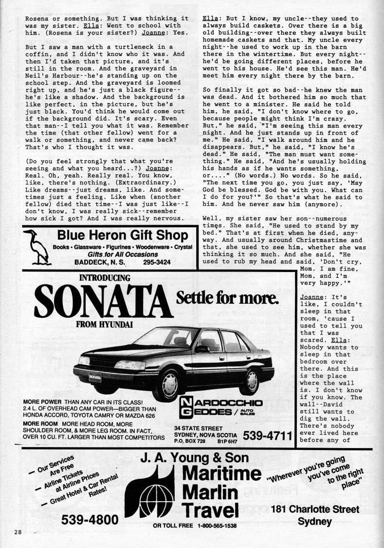 Published by Ronald Caplan on 1989/8/1 (245 reads)Rosena or something. But I was thinking it was my sister. Ella: Went to school with him. (Rosena is your sister?) Joanne: Yes. But I saw a man with a turtleneck in a coffin, and I didn't know who it was. And then I'd taken that picture, and it's still in the room. And the graveyard in Neil's Harbour--he's standing up on the school step. And the graveyard is loomed right up, and he's just a black figure-- he's like a shadow. And the background is like perfect, in the picture, but he's just black. You'd think he would come out if the background did. It's scary. Even that man--I tell you what it was. Remember the time (that other fellow) went for a walk or something, and never came back? That's who I thought it was. (Do you feel strongly that what you're seeing and what you heard...?) Joanne: Real. Oh, yeah. Really real. You know, like, there's nothing. (Extraordinary.) Like dreams--just dreams, like. And some? times just a feeling. Like when (another fellow) died that time--I was just like--I don't know, I was really sick--remember how sick I got? And I was really nervous. "V Blue Heron Gift Shop ' Books • Glassware • Figurines • Woodenware • Crystal Gifts, for All Occasions BADDECK, N. S. 295-3424 INTRODUCING SON'yA FROM HYUNDAI MORE POWER THAN ANY CAR IN ITS CLASS! 2.4 L. OF OVERHEAD CAM POWER • BIGGER THAN HONDA ACCORD, TOYOTA CAMRY OR MAZDA 626 MORE ROOM MORE HEAD ROOM. MORE SHOULDER ROOM, & MORE LEG ROOM. IN FACT. OVER 10 CU. FF. LARGER THAN MOST COMPETITORS Ella; But I know, my uncle--they used to always build caskets. Over there is a big old building--over there they always built homemade caskets and that. My uncle every night--he used to work up in the barn there in the wintertime. But every night-- he'd be going different places, before he went to his house. He'd see this man. He'd meet him every night there by the barn. So finally it got so bad--he knew the man was dead. And it bothered him so much that he went to a minister. He said he told him, he said, "I don't know where to go, because people might think I'm crazy. But," he said, "I'm seeing this man every night. And he just stands up in front of me." He said, "I walk around him and he disappears. But." he said, "I know he's dead." He said, "The man must want some? thing." He said, "And he's usually holding his hands as if he wants something, or...." (No words.) No words. So he said, "The next time you go, you just say, 'May God be blessed. God be with you. What can I do for you?'" So that's what he said to him. And he never saw him (anymore). Well, my sister saw her son--numerous tim's. She said, "He used to stand by my bed." That's at first when he died, any? way. And usually around Christmastime and that, she used to see him, whether she was thinking it so much. And she said, "He used to rub my head and said, 'Don't cry. Mom. I am fine. Mom, and I'm very happy.'" Joanne: It's like, I couldn't sleep in that room, 'cause I used to tell you that I was scared. Ella: Nobody wants to sleep in that bedroom over there. And this is the place where the wall is. I don't know if you know. The wall--David still wants to dig the wall. There's nobody ever lived here before any of Settle for more. 34 STATE STREET SYDNEY, NOVA SCOTIA 539-471 1 .Gt?* 1.' )'*'%*? 539-4800 Mm J. A. Young & Son Maritime 'v''te Marlin fl'gYSl 181 Charlotte street OR TOLL FREE 1.800-56S-153S Sydney