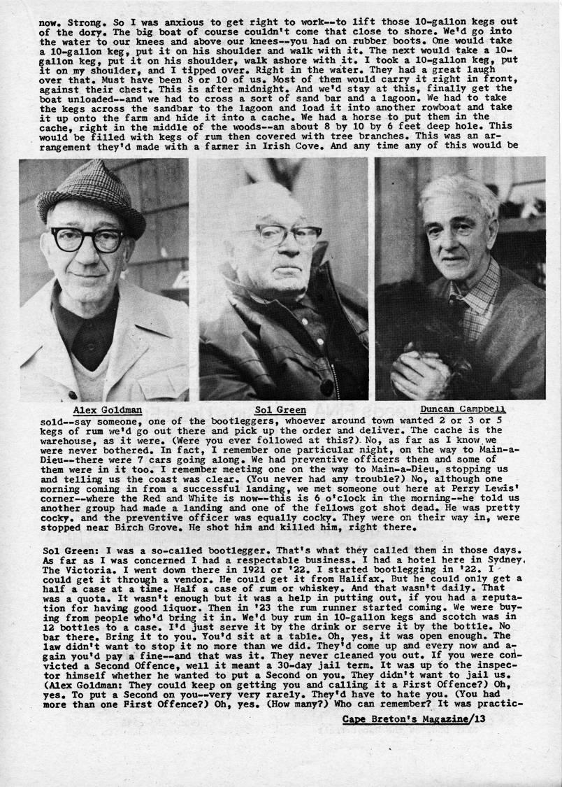 Published by Ronald Caplan on 1975/6/1 (401 reads)now. Strong. So I was anxious to get right to work • to lift those 10-gallon kegs out of the dory. The big boat of course couldn't come that close to shore. We'd go into the water to our knees and above our knees • you had on rubber boots. One would take a 10-gallon keg, put it on his shoulder and walk with it. The next would take a 10- gallon keg, put it on his shoulder, walk ashore with it. I took a 10-gallon keg, put it on my shoulder, and I tipped over. Right in the water. They had a great laugh over that. Must have been 8 or 10 of us. Most of thera would carry it right in front, against their chest. This is after midnight. And we'd stay at this, finally get the boat unloaded • and we had to cross a sort of sand bar and a lagoon. We had to take the kegs across the sandbar to the lagoon and load it into another rowboat and take it up onto the farra and hide it into a cache. We had a horse to put thera in the cache, right in the raiddle of the woods • an about 8 by 10 by 6 feet deep hole. This would be filled with kegs of rum then covered with tree branches. This was an ar? rangement they'd raade with a farraer in Irish Cove. And any tirae any of this would be Alex Goldraan Sol Green Duncan Carapbeil sold • say soraeone, one of the bootleggers, whoever around to m wanted 2 or 3 or 5 kegs of rum we'd go out there and pick up the order and deliver. The cache is the warehouse, as it were. (Were you ever followed at this?). No, as far as I know.we were never bothered. In fact, I reraeraber one particular night, on the way to Main-a- Dieu • there were 7 cars going alon'. We had preventive officers then and sorae of thera were in it too. I reraeraber raeeting one on the way to Main-a-Dieu, stopping us and telling us the coast was clear. (You never had any trouble?) No, although one raorning coraing in frora a successful landing, we met soraeone out here at Perry Lewis' corner • where the Red and White is now • this is 6 o'clock in the raorning • he told us another group had raade a landing and one of the fellows got shot dead. He was pretty cocky, and the preventive officer was equally cocky. They were on their way in, were stopped near Birch Grove. He shot hira and killed him, right there# Sol Green: I was a so-called bootlegger. That's what they called thera in those days. As far as I was concerned I had a respectable business. I had a hotel here in Sydney, The Victoria. I went down there in 1921 or '22. I started bootlegging in '22. I could get it through a vendor. He could get it frora Halifax. But he could only get a half a case at a time. Half a case of rum or whiskey. And that wasn't daily. That was a quota. It wasn't enough but it was a help in putting out, if you had a reputa? tion for having good liquor. Then in '23 the rum runner started coraing. We were buy? ing from people who'd bring it in. We'd buy rura in 10-gallon kegs and scotch was in 12 bottles to a case. I'd just serve it by the drink or serve it by the bottle. No bar there. Bring it to you. You'd sit at a table. Oh, yes, it was open enough. The law didn't want to stop it no raore than we did. They'd come up and every now and a- gain you'd pay a fine • and that was it. They never cleaned you out. If you were coii- victed a Second Offence, well it raeant a 30-day jail terra. It was up to the inspec? tor hiraself whether he wanted to put a Second on you. They didn't want to jail us. (Alex Goldman: They could keep on getting you and calling it a First Offence?) Oh, yes. To put a Second on you • very very rarely. They'd have to hate you. (You had more than one First Offence?) Oh, yes. (How many?) Who can remember? It was practic- Cape Breton's Magazine/l3