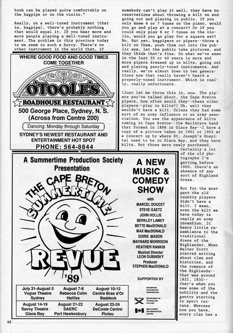 book can be played quite comfortably on the bagpipe or on the violin." Really, on a well-tuned instrument (that is, bagpipe), there's probably nothing that would equal it. If you hear more and more people playing a well-tuned instru? ment. The problem in this province today is we seem in such a hurry. There's no other instrument in the world that, if WHERE GOOD FOOD AND GOOD TIMES COME TOGETHER YY ROADHOUSE RESTAURANT fY 500 George Place, Sydney, N. ''. (Across from Centre 200) if Dancing: Monday through Saturday ]| SYDNEY'S NEWEST RESTAURANT AND ENTERTAINMENT HOT SPOT PHONE: 564-8844 A Summertime Production Society Presentation somebody can't play it well, they have no reservations about throwing a kilt on and going out and playing in public. If you only knew 6 or 7 tunes on the piano, would you go and play at a concert? Or if you could only play 6 or 7 tunes on the vio? lin, would you go play for a square set? No. But yet, bagpipers or pipers--throw a kilt on them, push them out into the pub? lic eye, let the public take pictures, and they think that's fine. So what we've seen in the last 30 or 40 years is more and more pipers dressed up in kilts, going out and playing poorly-tuned instruments. And really, we're almost down to two genera? tions now that really haven't heard a properly-tuned instrument. Which is real? ly, really unfortunate. (Just let me throw this in, now. The pip? ers you've talked about, the Cape Breton pipers, how often would they--these older players--play in kilts?) Oh, well they wouldn't have a kilt. Unless they had some sort of an army influence or an army asso? ciation. You see the appearance of kilts coming in Cape Breton--the Maclntyre band that formed in 1898 in Glace Bay--I have a copy of a picture taken in 1901 or 1902 at a concert up by where St. Joseph's Hospi? tal used to be in Glace Bay, and they have kilts. But those were newly purchased. Certainly a lot of the old pho- A NEW MUSIC & COMEDY SHOW with MARCEL DOUCET STEVE GAETZ JOHN MOLLIS BERKLEY LAMEY BETTE MacDONALD MAX MacDONALD DORIS MASON MAYNARD MORRISON HEATHER RANKIN Musical Director LEON DUBINSKY Producer STEPHEN MacDONALD SUPPORTED BY July 31-August 5 Vogue Theatre Sydney August 7-8 Rebecca Cohn Halifax August 10-12 Centre Bras d'Or Baddeck August 14-19 Savoy Theatre Glace Bay August 21-22 SAERC Port Hawl