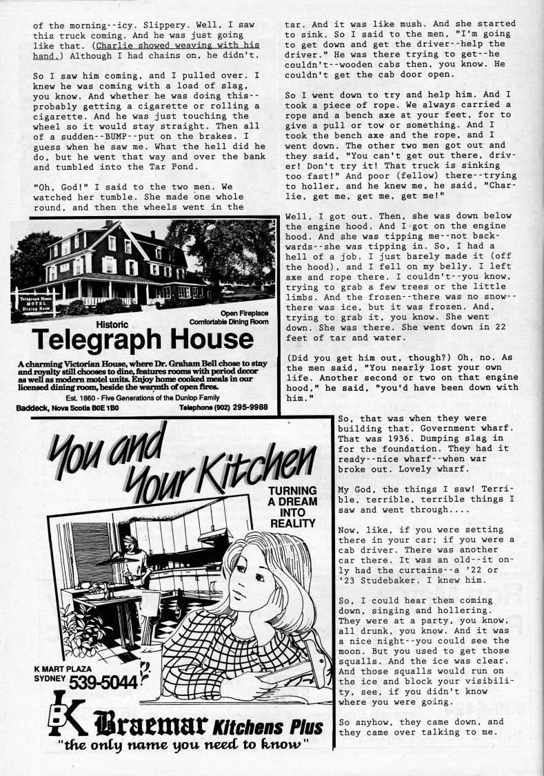 Published by Ronald Caplan on 1989/8/1 (153 reads)of the morning--icy. Slippery. Well, I saw this truck coming. And he was just going like that. (Charlie showed weaving with his hand.) Although I had chains on, he didn't. So I saw him coming, and I pulled over. I knew he was coming with a load of slag, you know. And whether he was doing this-- probably getting a cigarette or rolling a cigarette. And he was just touching the wheel so it would stay straight. Then all of a sudden--BUMP--put on the brakes. I guess when he saw me. What the hell did he do, but he went that way and over the bank and tumbled into the Tar Pond. "Oh, God!" I said to the two men. We watched her tumble. She made one whole round, and then the wheels went in the HistoHc Open Fireplace Conrsfortable Dining Room Telegrapli House A diarmmg Victorian House, where Dr. Graham Bell chose to stx' and royalty stall chooses to dine, features rooms with period decor as well as modem motel units. Eqjoy home cooked meals in our licensed dining room, beside the warmth of open fires. Est. 1860 - Five Generations of the Duntop Family Baddeck, Nova Scotia BOE 1 BO Telephone (902) 295-9988 tar. And it was like mush. And she started to sink. So I said to the men, "I'm going to get down and get the driver--help the driver." He was there trying to get--he couldn't--wooden cabs then, you know. He couldn't get the cab door open. So I went down to try and help him. And I took a piece of rope. We always carried a rope and a bench axe at your feet, for to give a pull or tow or something. And I took the bench axe and the rope, and I went down. The other two men got out and they said, "You can't get out there, driv? er! Don't try it! That truck is sinking too fast!" And poor (fellow) there--trying to holler, and he knew me, he said, "Char? lie, get me, get me, get me!" Well, I got out. Then, she was down below the engine hood. And I got on the engine hood. And she was tipping me--not back? wards --she was tipping in. So, I had a hell of a job. I just barely made it (off the hood), and I fell on my belly. I left axe and rope there. I couldn't--you know, trying to grab a few trees or the little limbs. And the frozen--there was no snow-- there was ice, but it was frozen. And, trying to grab it, you know. She went down. She was there. She went down in 22 feet of tar and water. (Did you get him out, though?) Oh, no. As the men said, "You nearly lost your own life. Another second or two on that engine hood," he said, "you'd have been down with him." '''trNm A DREAM INTO REALITY K MART PLAZA MxUtmUt Kitchens Plus "tfie onCty name ifouneedi to know* So, that was when they were building that. Government wharf. That was 1936. Dumping slag in for the foundation. They had it ready--nice wharf--when war broke out. Lovely wharf. My God, the things I saw! Terri? ble, terrible, terrible things I saw and went through.... Now, like, if you were setting there in your car; if you were a cab driver. There was another car there. It was an old--it on? ly had the curtains--a '22 or '23 Studebaker. I knew him. So, I could hear them coming down, singing and hollering. They were at a party, you know, all drunk, you know. And it was a nice night--you could see the moon. But you used to get those squalls. And the ice was clear. And those squalls would run on the ice and block your visibili? ty, see, if you didn't know where you were going. So anyhow, they came down, and they came over talking to me.