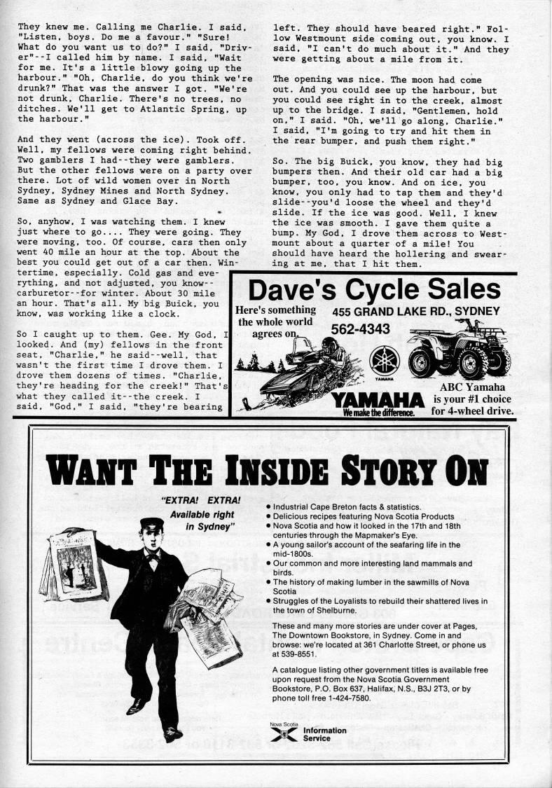 Published by Ronald Caplan on 1989/8/1 (143 reads)They knew me. Calling me Charlie. I said, "Listen, boys. Do me a favour." "Sure! What do you want us to do?" I said, "Driv? er"- -I called him by name. I said, "Wait for me. It's a little blowy going up the harbour." "Oh, Charlie, do you think we're drunk?" That was the answer I got. "We're not drunk, Charlie. There's no trees, no ditches. We'll get to Atlantic Spring, up the harbour." And they went (across the ice). Took off. Well, my fellows were coming right behind. Two gamblers I had--they were gamblers. But the other fellows were on a party over there. Lot of wild women over in North Sydney, Sydney Mines and North Sydney. Same as Sydney and Glace Bay. So, anyhow, I was watching them. I knew just where to go.... They were going. They were moving, too. Of course, cars then only went 40 mile an hour at the top. About the best you could get out of a car then. Win? tertime, especially. Cold gas and eve? rything, and not adjusted, you know-- carburetor--for winter. About 30 mile an hour. That's all. My big Buick, you know, was working like a clock. So I caught up to them. Gee. My God, I looked. And (my) fellows in the front seat, "Charlie," he said--well, that wasn't the first time I drove them. I drove them dozens of times. "Charlie, they're heading for the creek!" That', what they called it--the creek. I said, "God," I said, "they're bearing left. They should have beared right." Fol? low Westmount side coming out, you know. I said, "I can't do much about it." And they were getting about a mile from it. The opening was nice. The moon had come out. And you could see up the harbour, but you could see right in to the creek, almost up to the bridge. I said, "Gentlemen, hold on," I said. "Oh, we'll go along, Charlie." I said, "I'm going to try and hit them in the rear bumper, and push them right." So. The big Buick, you know, they had big bumpers then. And their old car had a big bumper, too, you know. And on ice, you know, you only had to tap them and they'd slide--you'd loose the wheel and they'd slide. If the ice was good. Well, I knew the ice was smooth. I gave them quite a bump. My God, I drove them across to West- mount about a quarter of a mile! You should have heard the hollering and swear? ing at me, that I hit them. Dave's Cycle Sales Here's something the whole world agrees on 455 GRAND LAKE RD., SIDNEY 562-4343 ABC Yamaha YAMAHA is your #1 choice Wemalietiiedifferetice. for 4-wheel drive. Want The Inside Stort oh "EXTRA' EXTRA! Available right in Sydney" • Industrial Cape Breton facts & statistics. • Delicious recipes featuring Nova Scotia Products • Nova Scotia and how it looked in the 17th and 18th centuries through the Mapmaker's Eye. • A young sailor's account of the seafaring life in the mid-1800s. • Our common and more interesting land mammals and birds. • The history of making lumber in the sawmills of Nova Scotia • Struggles of the Loyalists to rebuild their shattered lives in the town of Shelburne. These and many more stories are under cover at Pages, The Downtown Bookstore, in Sydney. Come in and browse: we're located at 361 Charlotte Street, or phone us at 539-8551. A catalogue listing other government titles is available free upon request from the Nova Scotia Government Bookstore, P.O. Box 637, Halifax, N.S., B3J 2T3, or by phone toll free 1-424-7580. ''[wil' Information 'K' Service