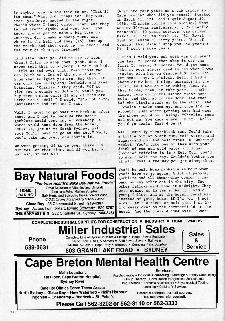 Published by Ronald Caplan on 1989/8/1 (163 reads)So anyhow, one fellow said to me, "That'll fix them." What did (they) do? They went over--you know, hauled to the right. That's where I (had) wanted them. And they turned around again. And went down--you know, you've got to make a big turn on ice--you don't make a sharp turn. And where in the hell did they (go)--but up' the creek. And they went up the creek, and the four of them got drowned! (And after what you did to try to stop them.) Tried to stop them, yeah. Now, I never told that to anybody. I felt so bad. I felt so bad over that. Even those two men (with me). One of the men--I don't know what religion you are. But then, it was only two religions: Catholic and Pres? byterian. "Charlie," they said, "if we give you a couple of dollars, would you buy them a mass card? If any of them are Catholics." "Well," I said, "I'm not sure, gentlemen." And neither I was. Well, I hated to go over the harbour after that. And I had to because the men-- gamblers would come in, or somebody. A woman would come down from the hotel, "Charlie, get me to North Sydney, will you? You'll have to go on the ice." Well, you'd take her over, and that's it. We were getting $6 to go over there--10 minutes--at that time. And if you had a carload, it was $10. Bay Natural Foods HOIVIE l' BAKING "For Your Health's Sake Buy Natural Foods' Great Selection of Vitamins and Minerals Beer- and Wine-Making Supplies Bulk Herbs and Spices by the Ounce or Pound C. O. D. Orders Accepted by Mail or Phone Glace Bay 35 Commercial Street 849-4387 Sydney Across from K-Mart, toward Schwartz 539-6767 THE HARVEST BIN 222 Charlotte St., Sydney 564-8461 (What are your years as a cab driver in Cape Breton? When did you start?) Started in March 11, '31. And I quit August 30, 1988. (Charlie points to a plaque.) That was my 50-year anniversary. ("To Charlie MacDonald, 50 years service, cab driver. March 11, '31, to March 11, '81. Royal Bank of Canada.") Fifty years. (But of course, that didn't stop you, 50 years.) No. I went 8 more years. But as I told you, cab work was different the last 20 years than what it was the first 30 years, 35 years. You'd get home. Like my poor sister used to say when I was staying with her on Campbell Street. I'd get home, say, 2 o'clock. Well, I had a phone at my bed. I slept upstairs in the attic, so I wouldn't be waking them. At that house, then, in that year, I could almost come up to the second floor out? side, and then go in the door, and then I had the little stair up to the attic, and I wouldn't wake them up. And then I'd be probably just after getting, into bed when the phone would be ringing, "Charlie, come and get me. You know where I'm at." Well, you'd go again. That'd be it. Well, usually then--black rum. You'd take a little bit of black rum, cold water, and sugar--and go. And most times, a "Wake-up" tablet. You'd take one of them with your drink of rum and cold water and sugar. (Lots'of caffeine in it.) Holy God, you'd go again half the day. Wouldn't bother you at all. That's the way you got along then. You'd be only home probably an hour when you'd have to go again. A lot of people, gamblers and all them--they couldn't de? pend on any other cab in the city. The other fellows went home at midnight. They were coming up in years. Well, I was a young fellow, and at the hotel. Sometimes instead of going home, if I'd--oh, I got a call at 3 o'clock or half past Tor 2-- I'd sneak over on the chesterfield at the hotel. And the clerk'd come over, "Char- COMPLETE INDUSTRIAL SUPPLIES FOR CONSTRUCTION ?? INDUSTRY ?? HOMEOWNERS Phone 539-0631 Miller industrial Sales Complete Line of Hydraulic Hoses & Fittings • Honda Power Equipment Hand Tools, Saws, & Shovels ?? Stihl Power Saws • Rainwear Industrial V-Belts • Rope-Poly & Wirerope • Complete Paint Supplies 803 GRAND LAKE ROAD ?? SYDNEY Sales & Service Cape Breton Mental Health Centre Main Location: 1st Floor, Cape Breton Hospital, Sydney River Satellite Clinics Serve These Areas: Services: Psychotherapy ~ Individual Counselling ~ Marriage & Family Counselling Group Therapy ~ Consultation to Agencies, Schools, etc. Drug Therapy - Forensic Assessment - Psychological Testing Parenting ~ Children's Services North Sydney ~ Glace Bay ~ New Waterford ~ Neil's Harbour Ingonish ~ Cheticamp ~ Baddeck ~ St. Peter's Referrals accepted from all sources. You can even refer yourself. Please Call 562-3202 or 562-3110 or 562-3333