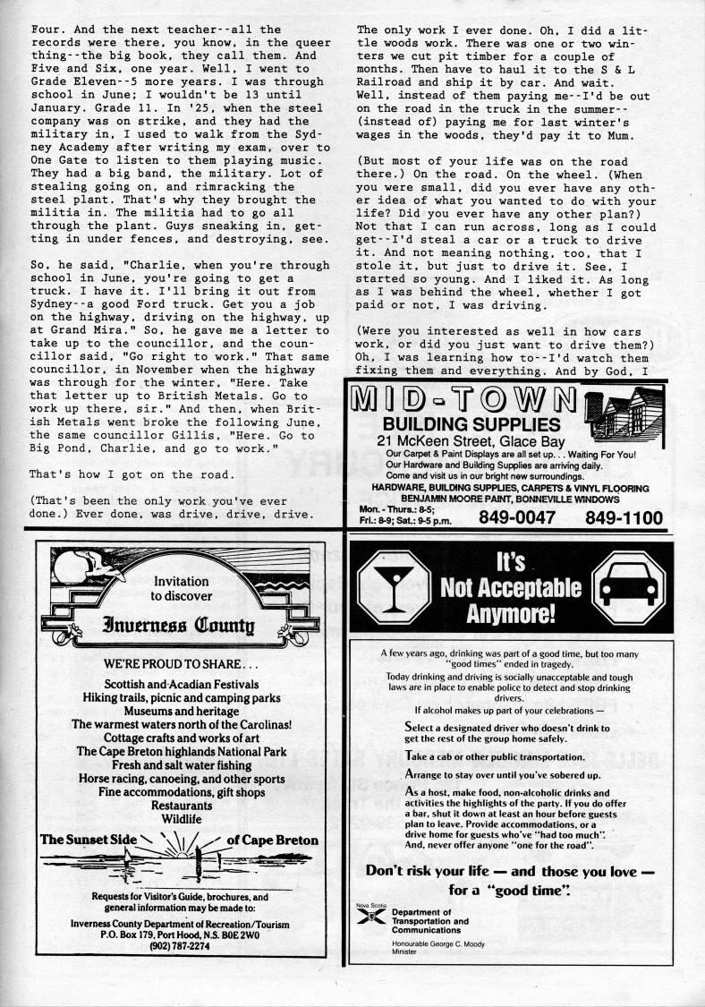 Published by Ronald Caplan on 1989/8/1 (143 reads)Four. And the next teacher--all the records were there, you know, in the queer thing--the big book, they call them. And Five and Six, one year. Well, I went to Grade Eleven--5 more years. I was through school in June; I wouldn't be 13 until January. Grade 11. In '25, when the steel company was on strike, and they had the military in, I used to walk from the Syd? ney Academy after writing my exam, over to One Gate to listen to them playing music. They had a big band, the military. Lot of stealing going on, and rimracking the steel plant. That's why they brought the militia in. The militia had to go all through the plant. Guys sneaking in, get? ting in under fences, and destroying, see. So, he said, "Charlie, when you're through school in June, you're going to get a truck. I have it. I'll bring it out from Sydney--a good Ford truck. Get you a job on the highway, driving on the highway, up at Grand Mira." So, he gave me a letter to take up to the councillor, and the coun? cillor said, "Go right to work." That same councillor, in November when the highway was through for the winter, "Here. Take that letter up to British Metals. Go to work up there, sir." And then, when Brit? ish Metals went broke the following June, the same councillor Gillis, "Here. Go to Big Pond, Charlie, and go to work." That's how I got on the road. (That's been the only work you've ever done.) Ever done, was drive, drive, drive. The only work I ever done. Oh, I did a lit? tle woods work. There was one or two win? ters we cut pit timber for a couple of months. Then have to haul it to the S & L Railroad and ship it by car. And wait. Well, instead of them paying me--I'd be out on the road in the truck in the summer-- (instead of) paying me for last winter's wages in the woods, they'd pay it to Mum. (But most of your life was on the road there.) On the road. On the wheel. (When you were small, did you ever have any oth? er idea of what you wanted to do with your life? Did you ever have any other plan?) Not that I can run across, long as I could get--I'd steal a car or a truck to drive it. And not meaning nothing, too, that I stole it, but just to drive it. See, T started so young. And I liked it. As long as I was behind the wheel, whether I got paid or not, I was driving. (Were you interested as well in how cars work, or did you just want to drive them?) Oh, I was learning how to--I'd watch them fixing them and everything. And by God, I BUILDING SUPPLIES 21 McKeen Street, Glace Bay Our Carpet & Paint Displays are all set up... Waiting For You! Our Hardware and Building Supplies are arriving daily. Come and visit us in our bright new surroundings. HARDWARE, BUILDING SUPPUES, CARPETS & VINYL FLOORING BENJAMIN MOORE PAI.NT, BONNEVILLE V,1NDOWS '"'9?s''lp.m. 849-0047 849-1100 WE'RE PROUD TO SHARE... Scottish and Acadian Festivals Hiking trails, picnic and camping parks Museums and heritage The warmest waters north of the Carolinas! Cottage crafts and works of art The Cape Breton highlands National Park Fresh and salt water fishing Horse racing, canoeing, and other sports Fine accommodations, gift shops Restaurants Wildlife The Sunset Side of Cape Breton Requests for Visitor's Guide, brochures, and general information may be made to: Inverness County Department of Recreation/Tourism P.O. Box 179. Port Hood, N.S. BOE 2W0 (902)787-2274 A few years ago, drinking was part of a good time, but too many "good times" ended in tragedy. Today drinking and driving is socially unacceptable and tough laws are in place to enable police to detect and stop drinking drivers. If alcohol makes up part ofyour celebrations • Select a designated driver who doesn't drink to get the rest of the group home safely. Take a cab or other public transportation. Arrange to stay over until you've sobered up. As a host, make food, non-alcoholic drinks and activities the highlights of the party, if you do offer a bar, shut it down at least an hour before guests plan to leave. Provide accommodations, or a drive home for guests who've "had too much". And, never offer anyone "one for the road". Don't risk your life • and those you love - for a **good time*! Department of Transportation and Communications