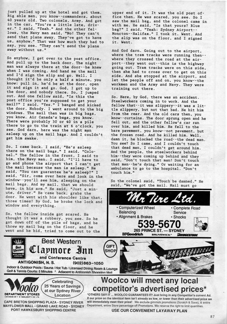 Published by Ronald Caplan on 1989/8/1 (140 reads)just pulled up at the hotel and got them. Big able men, you know--commanders, about 40 years old. Two colonels. Army. And got in the car, "You're a little late, driv? er." I said, "Yeah." And the other fel? lows, the Navy man said, "No! They can't send that plane away. They've got to have us, anyhow." That was how much they had to say, you see. "They can't send the plane away without us." So anyhow, I get over to the post office. And pull up to the back door. The night man was always there at the door--he knew when I was coming. And hand me the mail and I'd sign the slip and go. Well, I thought it'd be only a half a minute, you know: pull in, he'd be at the door, open it and sign it and go. God, I got up to the door, and nobody there. So, I jumped out. And one fellow said, "Is this the post office you're supposed to get your mail?" I said, "Yes." I banged and kicked the door. Nobody. I went around to the big windows. The mail then was in big bags, you know. Air Canada's bags, you know. There were probably 30 or 40 in a pile there to go to the train at 6 o'clock, you see. God darn, here was the night man asleep up on the mail bags. And I couldn't get him awake. So, I came back. I said, "He's asleep there on the mail bags," I said, "Colo? nel." The fellow in the front, I said to him, the Navy man, I said. "I'll have to go and phone the airport that I can't get the mail because the man is asleep." He said, "You can guarantee he's asleep?" I said, "Sir. come over here and look in the window--you'll see him. sleeping on the mail bags. And my mail, that we should have, in his arm." He said, "Just a min? ute, driver." He came back, grabs the door. He went with his shoulder like that, three times! By God, he broke the lock and window and everything. So, the fellow inside got scared. He thought it was a robbery, you see. So he got down off of the pile of bags, and he threw my mail bag on the floor, and he went and he hid. tried to come out to the upper end of it. It was the old post of? fice then. He was scared, you see. So I saw the mail bag. and the colonel came in with me. He said, "Is that yours? Blue bag?" I said, "Yeah: Sydney Airport-- Moncton--Halifax." I took it. Went. And the slip was on the floor, and I signed it. Went. And God darn. Going out to the airport, where the tram tracks were running then-- where they crossed the road at the air? port- -they went out--this is the highway going out. Tram tracks were on this side, then she had to cross over to get on this side. And she stopped at the airport, and let the people off and on, you know--the workmen and the Army and Navy. They were training out there. So. Here, by God, there was an accident. Steelworkers coming in to work. And the fellow that--it was slippery--it was a lit? tle slippery, but not that bad. He hit him from the rear. And the old cars then, you know--curtains. The door sprung open and he fell out, and the other fellow's car ran over him, and killed him. He fell to the bare pavement, you know--not pavement, but the frozen road. And he killed him. Well, damn it, he blocked the road--the dead man. You see? So I came, and I couldn't touch that dead man, I couldn't get around him. And the people, the steelworkers behind him--they were coming up behind and they said. "Don't touch that man! Don't touch that man--he's dying." Or waiting for an ambulance to go to the hospital. "Don't touch him," So the colonel said, "Touch be damned." He said, "We've got the mail. Mail must go "THrlitcJlUi. • Computerized Wheel Balancing • Alignment & Brakes • Complete Road Service • Shocks 539-5670 265 PRINCE ST. • SYDNEY ilKiiooclrieh brunswick- Best Western Clapmore Jnn and Conference Centre ANirGONiSH, N. S. (902)863-1050 Indoor & Outdoor Pools / Sauna / Hot Tub / Licensed Dining Room & Lounge Golf & Tennis Courts: 5 Minutes * Adiacent to Antiaonish Shonninn Mail -''A '''??'' y' Celebrating 'S'nnlrn f'' '??a''s ol savings ' r jUUILU V at our Sydney River> DEPARTMENT STORES ' LOCatlOn CAPE BRETON SHOPPING PLAZA - SYDNEY RIVER MAYFLOWER MALL - GRAND LAKE ROAD - SYDNEY PORT HAWKESBURY SHOPPING CENTRE WooIco will meet any local competitor's advertised prices* 'OTHERS SAY IT... WOOLCO GUARANTEES IT! Just bring in any Competitor's current Ad. If our price on the identical item isn't already as low, or lower than their advertised price we will immediately meet their price! We exclude gimmick promotions (Scratch & Save), & entire Department, entire Store percentage off Promotions. We reserve the right to limit quantities. USE OUR CONVENIENT LAYAWAY PLAN