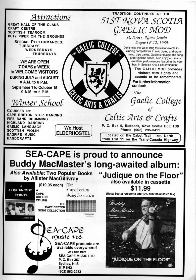 Published by Ronald Caplan on 1989/8/1 (139 reads)Attractions GREAT HALL OF THE CLANS CRAFT CENTRE SCOTTISH TEAROOM DUTY PIPER ON THE GROUNDS SPECIAL PERFORMANCES: TUESDAYS WEDNESDAYS THURSDAYS WE ARE OPEN 7 DAYS a WEEK to WELCOME VISITORS DURING JULY and AUGUST 8 A.M. to 8 P.M. September 1 to October 15 9 A.M. to 5 P.M. l/'inttr School COURSES IN: CAPE BRETON STEP DANCING PIPE BAND DRUMMING HIGHLAND DANCING GAELIC LANGUAGE SCOTTISH VIOLIN BAGPIPE MUSIC HANDCRAFTS We Host ELDERHOSTEL TRADITION CONTINUES AT THE St. 'nn's, 9{gva Scotia Siu??ust 6-12,1989 Don't miss this week long festival of events in? cluding competitions in solo piping and drum? ming, pipe bands, Gaelic language and song, and Higtiland dance. Also enjoy our many excellent performances featuring tlie very best in Scottish Arts & Entertainment. The GAELIC MOD provides visitors with sights and sounds to be remembered. For further information contact: The Qadic Coiiegc of cdtic Arts & Crafts P. O. Box 9, Baddeck, Nova Scotia BOE 1B0 Phone (902) 295-3411 Located on the Cabot Trail 1 km. North from Exit 11 on the Trans-Canada Highway' SEA-CAPE Is proud to announce Buddy MacMaster's long-awaited album: "Judique on the Floor' also available in cassette $11.99 Also Available: Two Popular Books by Allister MacGillivray ($19.95 each) The cape BFietor? ceiLir>b A CAPE BRETON CEILIDH THE CAPE BRETON SONG COLLECTION Cape Breton (??ong Collection (Nova Scotia residents add 10% provincial sales tax) CA-CAPe SEA-CAPE products are available everywhere! Or direct from SEA-CAPE MUSIC LTD. P. O. Box 357 Sydney, N. S. B1P6H2 (902) 562-2233