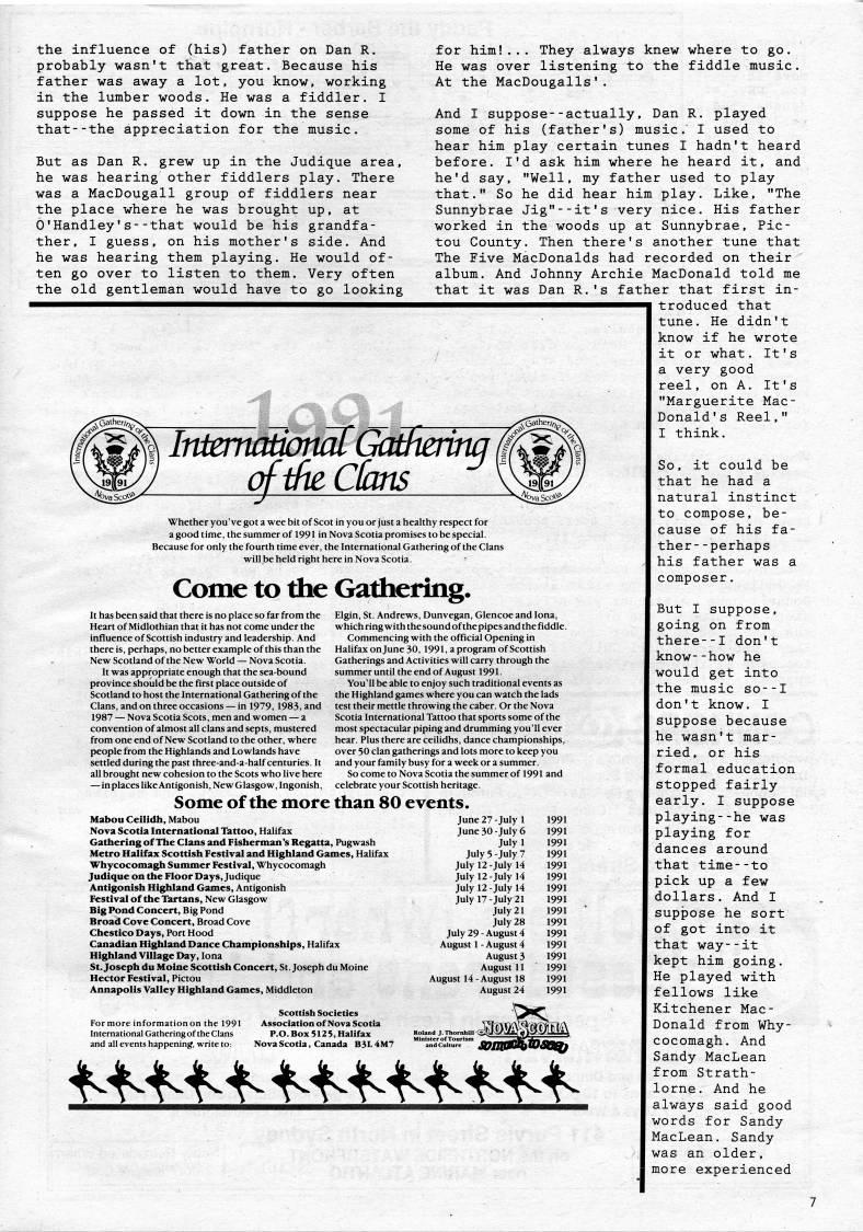 the influence of (his) father on Dan R. probably wasn't that great. Because his father was away a lot, you know, working in the lumber woods. He was a fiddler. I suppose he passed it down in the sense that--the appreciation for the music. But as Dan R. grew up in the Judique area, he was hearing other fiddlers play. There was a MacDougall group of fiddlers near the place where he was brought up, at O'Handley's--that would be his grandfa? ther, I guess, on his mother's side. And he was hearing them playing. He would of? ten go over to listen to them. Very often the old gentleman would have to go looking Intemationat Gathering ofiheCkms Whether you've got a wee bit of Scot in you or just a healthy respect for a good time, the summer of 1991 in Nova Scotia promises to be special. Because for only the fourth time ever, the International Gathering of the Clans will be held right here in Nova Scotia. Come to the Gathering, It has been said that there is no place so far from the Heart of Midlothian that it has not come under the influence of Scottish industry and leadership. And there is, perhaps, no better example of this than the New Scotland of the New World • Nova Scotia. It was appropriate enough that the sea-bound province should be the first place outside of Scotland to host the International Gathering of the Clans, and on three occasions • in 1979, 1983, and 1987 • Nova Scotia Scots, men and women • a convention of almost all clans and septs, mustered from one end of New Scotland to the other, where people from the Highlands and Lowlands have settled during the past three-and-a-half centuries. It all brought new cohesion to the Scots who live here • in places like Antigonish, New Glasgow, Ingonish, Some of the more Mabou Ceilidh, Mabou Nova Scotia International Tattoo, Halifax Gatliering ofTlie Clans and Fisherman's Regatta, Pugwash Metro Halifax Scottish Festival and Highland Games, Halifax Whycocomagh Summer Festival, Whycocomagh Judique on the Floor Days, Judique Antigonish Highland Games, Antigonish Festival of the Tartans, New Glasgow Big Pond Concert, Big Pond Broad Cove Concert, Broad Cove Chestico Days, Port Hood Canadian Highland Dance Championships, Halifax Highland Village Day, lona St. Joseph du Moine Scottish Concert, St. Joseph du Moine Hector Festival, Pictou Annapolis Valley Highland Games, Middleton Scottish Societies Formorc information on the 1991 Association of Nova Scotia International Gathering of the Clans P.O. Box 512 5, Halifax and all events happening, write to: Nova Scotia, Canada B3L 4M7 '''4.'-''4'''''4' for him!... They always knew where to go. He was over listening to the fiddle music. At the MacDougalls'. And I suppose--actually, Dan R. played some of his (father's) music. I used to hear him play certain tunes I hadn't heard before. I'd ask him where he heard it, and he'd say, "Well, my father used to play that." So he did hear him play. Like, "The Sunnybrae Jig"--it's very nice. His father worked in the woods up at Sunnybrae, Pic? tou County. Then there's another tune that The Five MacDonalds had recorded on their album. And Johnny Archie MacDonald told me that it was Dan R.'s father that first in? troduced that tune. He didn't know if he wrote it or what. It's a very good reel, on A. It's "Marguerite Mac- Donald's Reel," I think. So, it could be that he had a natural instinct to compose, be? cause of his fa? ther- -perhaps his father was a composer. But I suppose, going on from there--I don't know--how he would get into the music so--I don't know. I suppose because he wasn't mar? ried, or his formal education stopped fairly early. I suppose playing--he was playing for dances around that time--to pick up a few dollars. And I suppose he sort of got into it that way--it kept him going. He played with fellows like Kitchener Mac? Donald from Why? cocomagh. And Sandy MacLean from Strath- lorne. And he always said good words for Sandy MacLean. Sandy was an older, more experienced Elgin, St. Andrews, Dunvegan, Glencoe and lona, which ring with the sound of the pipes and the fiddle. Commencing with the official Opening in Halifax on June 30, 1991, a program of Scottish Gatherings and Activities will carry through the summer until the end of August 1991. You'll be able to enjoy such traditional events as the Highland games where you can watch the lads test their mettle throwing the caber. Or the Nova Scotia International Tattoo that sports some of the most spectacular piping and drumming you'll ever hear. Plus there are ceilidhs, dance championships, over 50 clan gatherings and lots more to keep you and your family busy for a week or a summer. So come to Nova Scotia the summer of 1991 and celebrate your Scottish heritage. than 80 events. June 27 -July 1 June 30 -July 6 Julyl July 5 -July 7 July 12-July 14 July 12 -July 14 July 12 -July 14 July 17-July 21 July 21 July 28 July 29 - August 4 August 1 - August 4 August 3 August 11 August 14 - August 18 August 24 1991 1991 1991 1991 1991 1991 1991 1991 1991 1991 1991 1991 1991 1991 1991 1991