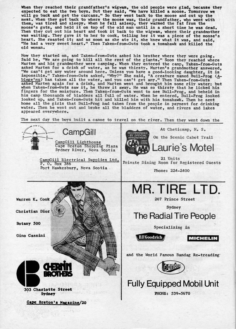 Published by Ronald Caplan on 1975/6/1 (362 reads)When they reached their grandfather's wigwam, the old people were glad, because they expected to eat the two boys. But they said, "We have killed a moose. Tomorrow we will go back and get the carcass." So they went back to the moose and cut up the meat. When they got back to where the moose was, their grandfather, who went with them, was tired and sleepy. When he fell asleep, they warmed the fat from the moose's guts, and held it on top of the old raan until in a short tirae he was dead. Then they cut out his heart and took it back to the wigwam, where their grandraother was waiting. They gave it to her to cook, telling her it was a piece of the raoose's heart. She roasted it; and as soon as she ate it, she knew what it was, and said, "He had a very sweet heart." Tlien Taken-frora-Guts took a toraahawk and killed the old woraan. Now they started on, and Taken-frora-Guts asked his brother where they were going. Said he, ''We are going to kill all the rest of the giants." Soon they reached where Marten and his grandraother were camping. When they entered the camp, Taken-from-Guts asked Marten for a drink of water, as he was thirsty. Marten's grandraother answered, "We can't get any water around here. Unless you have a good-looking daughter, it is irapossible." Taken-from-Guts asked, "Why?" She said, "A creature named Bull-Frog (A- blege'rau) has taken all the water, and you can't get any." Then Taken-frora-Guts asked Marten again for a drink, and Marten went and brought hira sorae rily water; but when Taken-frora-Guts saw it, he threw it away. He was so thirsty that he licked his fingers for the moisture. Then Taken-from-Guts went to see Bull-Frog, and beheld in his camp thousands of bladders all full of water. When he entered, Bull-Frog looked looked up, and Taken-from-Guts hit and killed hira with his toraahawk. Then he sent horae all the girls that Bull-Frog had taken frora the people in payraent for drinking water. Then he went out and broke all the bladders of water, and rivers and lakes appeared everywhere. The next day the boys built a canoe to travel on the river. Then they went down the CampGill CarapGill Lighthouse Cape Breton Shopping Plaza Sydney River, Nova Scotia CarapGill Electrical Supplies Ltd? P. 0. Box 386 Port Hawkesbury, Nova Scotia 303 Charlotte Street Sydney Cape Breton's Maga2ihe/20 At Cheticarap, N. S. On the Scenic Cabot Trail Laurie's Motel 21 Units Private Dining Roora for Registered Guests Phone: 224-2400 MR. TIRE LTD. 267 Prince Street Sydney The Radial Tire People specializing.in and the World Faraous Bandag Re-treading- Fully Equipped Mobil Unit PHONE: 539-5670