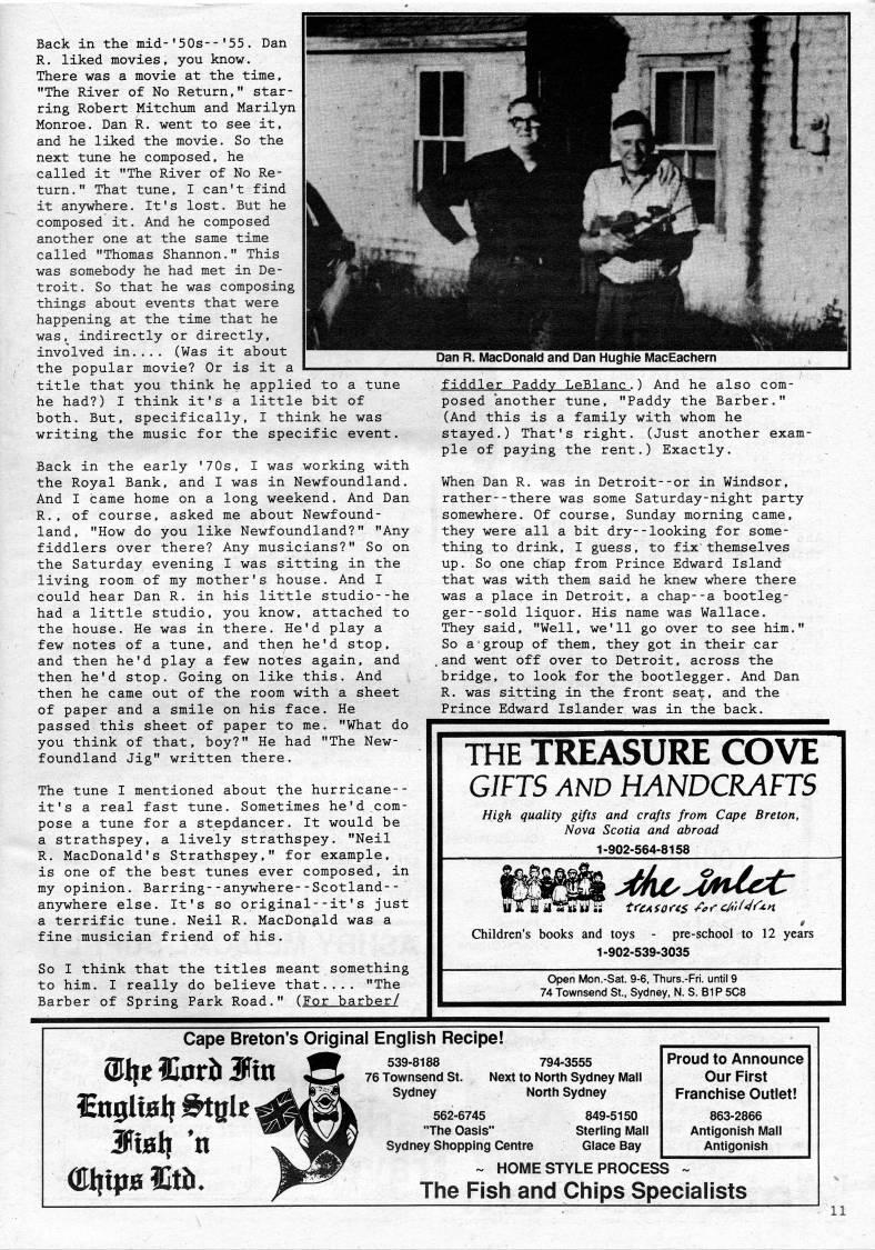 Back in the mid-'50s--'55. Dan R. liked movies, you know. There was a movie at the time, "The River of No Return," star? ring Robert Mitchum and Marilyn Monroe. Dan R. went to see it, and he liked the movie. So the next tune he composed, he called it "The River of No Re? turn ." That tune, I can't find it anywhere. It's lost. But he composed it. And he composed another one at the same time called "Thomas Shannon." This was somebody he had met in De? troit. So that he was composing things about events that were happening at the time that he was ,' indirectly or directly, involved in.... (Was it about the popular movie? Or is it a title that you think he applied to a tune he had?) I think it's a little bit of both. But, specifically, I think he was writing the music for the specific event. Back in the early '70s, I was working with the Royal Bank, and I was in Newfoundland. And I came home on a long weekend. And Dan R.. of course, asked me about Newfound? land, "How do you like Newfoundland?" "Any fiddlers over there? Any musicians?" So on the Saturday evening I was sitting in the living room of my mother's house. And I could hear Dan R. in his little studio--he had a little studio, you know, attached to the house. He was in there. He'd play a few notes of a tune, and then he'd stop, and then he'd play a few notes again, and then he'd stop. Going on like this. And then he came out of the room with a sheet of paper and a smile on his face. He passed this sheet of paper to me. "What do you think of that, boy?" He had "The New? foundland Jig" written there. The tune I mentioned about the hurricane-- it's a real fast tune. Sometimes he'd com? pose a tune for a stepdancer. It would be a strathspey, a lively strathspey. "Neil R. MacDonald's Strathspey," for example, is one of the best tunes ever composed, in my opinion. Barring--anywhere--Scotland-- anywhere else. It's so original--it's just a terrific tune. Neil R. MacDonald was a fine musician friend of his. So I think that the titles meant.something to him. I really do believe that.... "The Barber of Spring Park Road." (For barber/ fiddler Paddy LeBlanc.) And he also com? posed another tune, "Paddy the Barber." (And this is a family with whom he stayed.) That's right. (Just another exam? ple of paying the rent.) Exactly. When Dan R. was in Detroit--or in Windsor, rather--there was some Saturday-night party somewhere. Of course, Sunday morning came, they were all a bit dry--looking for some? thing to drink, I guess, to fix themselves up. So one chap from Prince Edward Island- that was with them said he knew where there was a place in Detroit, a chap--a bootleg? ger- -sold liquor. His name was Wallace. They said, "Well, we'll go over to see him." So a group of them, they got in their car .and went off over to Detroit, across the bridge, to look for the bootlegger. And Dan R. was sitting in the front seat, and the Prince Edward Islander was in the back. THE TREASURE COVE GIFTS AND HANDCRAFTS High quality gifts and crafts from Cape Breton, Nova Scotia and abroad 1-902-564-8158 Children's books and toys - pre-school to 12 years 1-902-539-3035 Open Mon.-Sat. 9-6, Thurs.-Fri. until 9 74 Townsend St., Sydney, N. S. BIP 5C8 539-8188 76 Townsend St. Sydney Cape Breton's Original English Recipe! "- ' ' HOME STYLE PROCESS oufttiBintd. 794-3555 Next to North Sydney Mali North Sydney 562-6745 "The Oasis" Sydney Shopping Centre 849-5150 Sterling IVIall Glace Bay Proud to Announce Our First Franchise Outlet! 863-2866 Antigonish Mali Antigonish The Fish and Chips Specialists