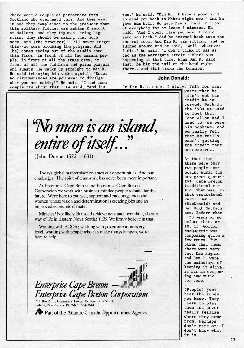 There were a couple of performers from Scotland who overheard this. And they went in and they complained to the producer that this solitary fiddler was making X amount of dollars, and they figured, being big stars, they should be making that much more. And (the producer)--I'11 never forget this--we were blocking the program. And (he) comes racing out of the studio onto this floor, in front of all the camera peo? ple, in front of all the stage crew, in front of all the fiddlers and piano players and guests. He walks up straight to Dan R. He said (changing his voice again), "Under no circumstances are you ever to divulge what you are making!" He said, "I had some complaints about that." He said, "And lis- "N) man is an island, entire of itself..? (John Donne, 1572-1631) Today's global marketplace enlarges our opportunities. And our challenges. The spirit of teamwork has never been more important. At Enterprise Cape Breton and Enterprise Cape Breton Corporation we work with business-minded people to build for the future. We're here to counsel, support and encourage men and women whose vision and determination is creating jobs and an improved economic climate. Miracles.? Not likely. But solid achievement and, over time, a better way of life in Eastern Nova Scotia.'' YES. We firmly believe in that. Working with ACOA; working with governments at every level, working with people who can make things happen, we're here to help. Enterprise Cape Breton • ' Enterprise Cape Breton Corporation P.O. Box 2001, Commerce Tower, 15 Dorchester Street, Sydney, Nova Scotia BIP 6K7 564-3614 #1' Part of the Atlantic Canada Opportunities Agency ten," he said, "Dan R., I have a good mind to send you back to Mabou right now." And he gave him hell. He gave Dan R. hell in front of everybody for at least 5 minutes. He said, "And I could fire you now. I could send you back." And he stormed back into the control room. And Dan R. was sitting, and he turned around and he said, "Well, whatever I did," he said, "I don't think it was as bad as the Watergate affair!" Which was happening at that time. When Dan R. said that, he hit the nail on the head right there...and that broke the tension. John Donald: In Dan R.'s case, I always felt for many years that he didn't get the credit he de? served. Back in the '50s we used to feel that. John Allan and I used to--we were his nephews, and we really felt that he really wasn't getting the credit that he deserved. At that time there were only two people com? posing music (in any great quanti? ty) --Cape Breton traditional mu? sic . That was, in that traditional vein. Dan R. (MacDonald) and Dan Hugh MacEach? ern. Before that --20 years or so before that, or 10, 15--Gordon MacQuarrie was composing quite a few tunes. But other than them, there were very few. Dan Hughie and Dan R. were the mainstays of keeping it alive, as far as compos? ing new music, for sure. (People) just hear the tunes, you know. They learn to play them and never really realize where they came from. Perhaps don't care or--I don't know what it is. 13