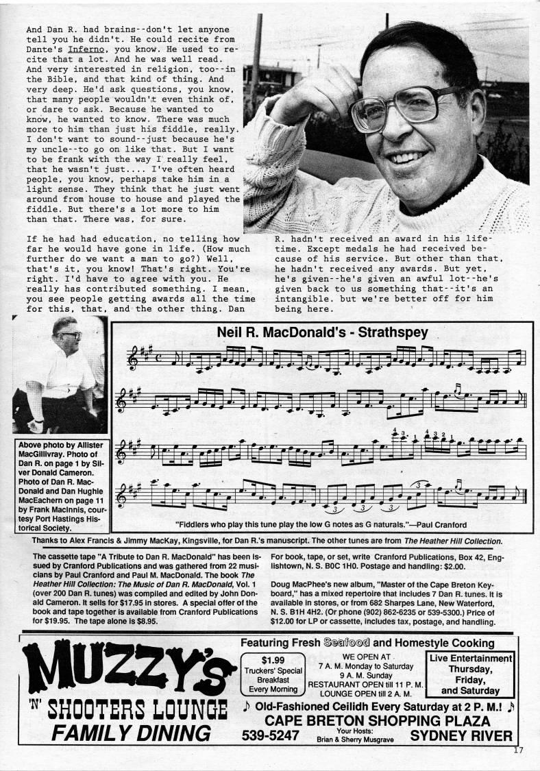 And Dan R. had brains--don't let anyone tell you he didn't. He could recite from Dante's Inferno, you know. He used to re? cite that a lot. And he was well read. And very interested in religion, too--in the Bible, and that kind of thing. And very deep. He'd ask questions, you know, that many people wouldn't even think of, or dare to ask. Because he wanted to know, he wanted to know. There was much more to him than just his fiddle, really. I don't want to sound--just because he's my uncle--to go on like that. But I want to be frank with the way I really feel, that he wasn't just.... I've often heard people, you know, perhaps take him in a light sense. They think that he just went around from house to house and played the fiddle. But there's a lot more to him than that. There was, for sure. If he had had education, no telling how far he would have gone in life. (How much further do we want a man to go?) Well, that's it, you know! That's right. You're right. I'd have to agree with you. He really has contributed something. I mean, you see people getting awards all the time for this, that, and the other thing. Dan R. hadn't received an award in his life? time. Except medals he had received be? cause of his service. But other than that, he hadn't received any awards. But yet, he's given--he's given an awful lot--he's given back to us something that--it's an intangible, but we're better off for him being here. Above photo by Ailister MacGillivray. Photo of Dan R. on page 1 by Sil? ver Donald Cameron. Photo of Dan R. Mac? Donald and Dan Hughie MacEachern on page 11 by Frank Maclnnis, cour? tesy Port Hastings His- torical Society. Neil R. MacDonald*s - Strathspey "Fiddlers who play this tune play the low G notes as G naturals." • Paul Cranford Thanks to Alex Francis & Jimmy MacKay, Kingsviile, for Dan R.'s manuscript. The other tunes are from Ttie Heather Hill Collection. The cassette tape "A Tribute to Dan R. MacDonald" has been is? sued by Cranford Publications and was gathered from 22 musi? cians by Paul Cranford and Paul M. MacDonald. The book Ttie Heather Hill Collection: The Music of Dan R. MacDonald, Vol. 1 (over 200 Dan R. tunes) was complied and edited by John Don? ald Cameron. It sells for $17.95 in stores. A special offer of the book and tape together is available from Cranford Publications for $19.95. The tape alone is $8.95. For book, tape, or set, write Cranford Publications, Box 42, Eng- llshtown, N. S. BOC 1H0. Postage and handling: $2.00. Doug MacPhee's new album, "Master of the Cape Breton Key? board," has a mixed repertoire that includes 7 Dan R. tunes. It is available in stores, or from 682 Sharpes Lane, New Waterford, N. S. B1H 4H2. (Or phone (902) 862-6235 or 539-5300.) Price Of $12.00 for LP or cassette, includes tax, postage, and handling. "?? SHOOTERS LOUNGE FAMILY DINING Featuring Fresh l • ?iU?(o)(2l and Homestyle Cooking WE OPEN AT 7 A. M. Monday to Saturday 9 A. M. Sunday RESTAURANT OPEN till 11 P. M. LOUNGE OPEN till 2 A. M. $1.99 Truckers' Special Breakfast ' Every Morning ' Live Entertainment Thursday, Friday, and Saturday J) Old-Fasliioned Ceilidh Every Saturday at 2 P. M.! j' CAPE BRETON SHOPPING PLAZA 539-5247 'lZ::X''. SYDNEY RIVER