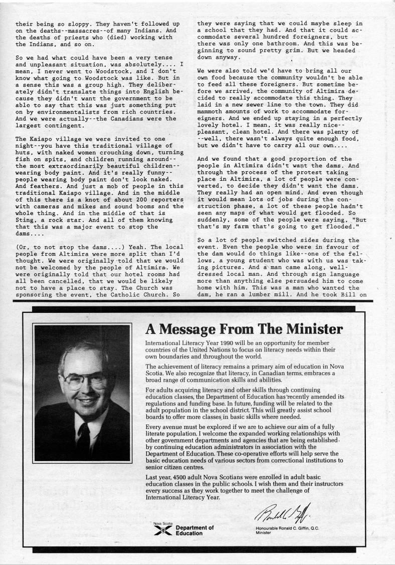 Published by Ronald Caplan on 1990/1/1 (241 reads)their being so sloppy. They haven't followed up on the deaths--massacres--of many Indians. And the deaths of priests who (died) working with the Indians, and so on. So we had what could have been a very tense and unpleasant situation, was absolutely.... I mean, I never went to Woodstock, and I don't know what going to,Woodstock was like. But in a sense this was a group high. They deliber? ately didn't translate things into English be? cause they didn't want the government to be able to say that this was just something put on by environmentalists from rich countries. And we were actually--the Canadians were the largest contingent. The Kaiapo village we were invited to one night--you have this traditional village of huts, with naked women crouching down, turning fish on spits, and children running around-- the most extraordinarily beautiful children-- wearing body paint. Arid it's really funny-- people wearing body paint don't look naked. And feathers. And just a mob of people in this traditional Kaiapo village. And in the middle of this there is a knot of about 200 reporters with cameras and mikes and sound booms and the whole thing. And in the middle of that is Sting, a rock star. And all of them knowing that this was a major event to stop the dams.... (Or, to not stop the dams....) Yeah. The local people from Altimira were more split than I'd thought. We were originally told that we would not be welcomed by the people of Altimira-. We were originally told that our hotel rooms had all been cancelled, that we would be likely not to have a place to stay. The Church was sponsoring the event, the Catholic Church. So they were saying that we could maybe sleep in a school that they had. And that it could ac? commodate several hundred foreigners, but there was only one bathroom. And this was be? ginning to sound pretty grim. But we headed down anyway. We were also told we'd have to bring all our own food because the community wouldn't be able to feed all these foreigners. But sometime be? fore we arrived, the community of Altimira de? cided to really accommodate this thing. They laid in a new sewer line to the town. They did mammoth amounts of work to accommodate for? eigners . And we ended up staying in a perfectly lovely hotel. I mean, it was really nice-- pleasant, clean hotel. And there was plenty of --well, there wasn't always quite enough food, but we didn't have to carry all our own.... And we found that a good proportion of the people in Altimira didn't want the dams. And through the process of the protest taking place in Altimira. a lot of people were con? verted, to decide they didn't want the dams. They really had an open mind. And even though it would mean lots of jobs during the con? struction phase, a lot of these people hadn't seen any maps of what would get flooded. So suddenly, some of the people were saying. "But that's my farm that's going to get flooded." So a lot of people switched sides during the event. Even the people who were in favour of the dam would do things like--one of the fel? lows, a young student who was with us was tak? ing pictures. And a man came along, well- dressed local man. And through sign language more than anything else persuaded him to come home with him. This was a man who wanted the dam, he ran a lumber mill. And he took Bill on A Message From The Minister International Literacy Year 1990 will be an opportunity for member countries of the United Nations to focus on literacy needs within their own boundaries and throughout the world. The achievement of literacy remains a primary aim of education in Nova Scotia. We also recognize that literacy, in Canadian terms, embraces a broad range of communication skills and abilities. For adults acquiring literacy and other skills through continuing education classes, the Department of Education hasl-ecently amended its requlations and funding base. In future, funding will be related to the adult population in the school district This will greatly assist school boards to offer more classes in basic skills where needed. Every avenue must be explored if we are to achieve our aim of a fully literate population. I welcome the expanded working relationships with other government departments and agencies that are being established by continuing education administrators in association with the Department of Education. These co-operative efforts will help serve the basic education needs of various sectors from correctional institutions to senior citizen centres. Last year, 4500 adult Nova Scotians were enrolled in adult basic education classes in the public schools. I wish them and their instructors every success as they work together to meet the challenge of International Literacy Year. Nova Scotia ??' Department of Education Honourable Ronald C. GIffIn, Q.C.