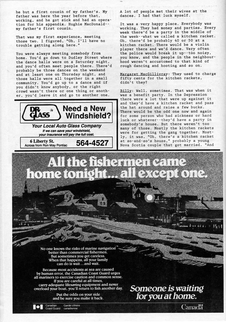 • A Visit with Capt. Michael A. Tobin, Ferry Captain—with Photos of Vessels in the Gulf and Newfoundland Run • Alma MacDonald—a War Bride in West Mabou • "Lauchie and Liza and Rory"—a Sheldon Currie Story • With Piper Alex Currie of Frenchvale • How Clarence Barrett Trapped the Fox • Love Letters from St. Paul's Island • A Poem by Leroy Peach • From "Father Jimmy"—"The Library in Reserve Mines" • Celebrating the Remarkable Isabella Gordon Mackay • "Baboushka and the 3 Kings," a Children's Story Told in Gaelic • A Rare Acadian Song from Chéticamp • Donnie MacDermid, Margaree Valley: "It could always be worse!"