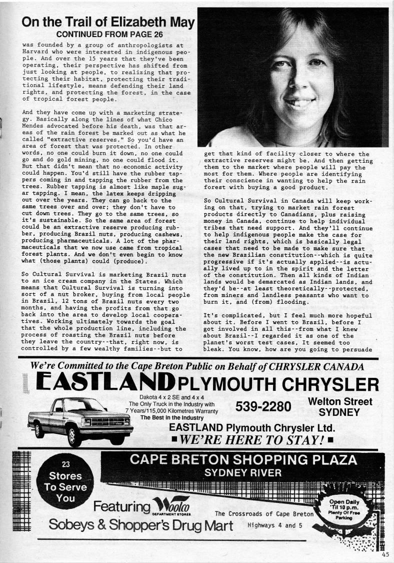 On the Trail of Elizabeth May CONTINUED FROM PAGE 26 was founded by a group of anthropologists at Harvard who were interested in indigenous peo? ple. And over the 15 years that they've been operating, their perspective has shifted from just looking at people, to realizing that pro? tecting their habitat, protecting their tradi? tional lifestyle, means defending their land rights, and protecting the forest, in the case of tropical forest people. And they have come up with a marketing strate? gy. Basically along the lines of what Chico Mendes advocated before his death, was that ar? eas of the rain forest be marked out as what he called "extractive reserves." So you'd have an area of forest that was protected. In other words, no one could burn it down, no one could go and do gold mining, no one could flood it. But that didn't mean that no economic activity could happen. You'd still have the rubber tap? pers coming in and tapping the rubber from the trees. Rubber tapping is almost like maple sug? ar tapping. I mean, the latex keeps dripping out over the years. They can go back to the same trees over and over; they don't have to cut down trees. They go to the same trees, so it • s sustainable. So the same area of forest could be an extractive reserve producing rub? ber, producing Brazil nuts, producing cashews, producing pharmaceuticals. A lot of the phar? maceuticals that we now use came from tropical forest plants. And we don't even begin to know what (those plants) could (produce). So Cultural Survival is marketing Brazil nuts to an ice cream company in the States. Which means that Cultural Survival is turning into sort of a nut broker, buying from local people in Brazil, 12 tons of Brazil nuts every two months, and having the profits from that go back into the area to develop local coopera? tives. Working ultimately towards the goal that the whole production line, including the process of roasting the Brazil nuts before they leave the country--that, right now, is controlled by a few wealthy families--but to get that kind of facility closer to where the extractive reserves might be. And then getting them to the market where people will pay the most for them. Where people are identifying their conscience in wanting to help the rain forest with buying a good product. So Cultural Survival in Canada will keep work? ing on that, trying to market rain forest products directly to Canadians, plus raising money in Canada, continue to help individual tribes that need support. And they'll continue to help indigenous people make the case for their land rights, which is basically legal cases that need to be miade to make sure that the new Brazilian constitution--which is quite progressive if it's actually applied--is actu? ally lived up to in the spirit and the letter of the constitution. Then all kinds of Indian lands would be demarcated as Indian lands, and they'd be--at least theoretically--protected, from miners and landless peasants who want to burn it. and (from) flooding. It's complicated, but I feel much more hopeful about it. Before I went to Brazil, before I got involved in all this--from what I knew about Brazil--I regarded it as one of the planet's worst test cases. It seemed too bleak. You know, how are you going to persuade We're Committed to the Cape Breton Public on Behalf of CHRYSLER CANADA EASTLAND PLYMOUTH Chrysler 539-2280 Dakota 4 X 2 SE and 4 X 4 The Only Truck in the Industry with 7 Years/115,000 Kilometres Warranty ' The Best in the Industry ' EASTLAND Plymouth Chrysler Ltd ?? WE'RE HERE TO STAY! ?? Welton Street SYDNEY Stores To Serve You US' Featuring 'Wfl7 '' Off ARTMINT trONEt The Crossroads of Cape Breton' SolDeys & Shopper's Drug Mart "'''"''' * "' =