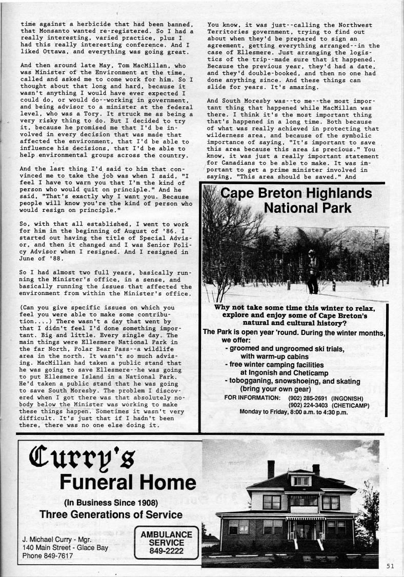 Published by Ronald Caplan on 1990/1/1 (173 reads)time against a herbicide that had been banned, that Monsanto wanted re-registered. So I had a really interesting, varied practice, plus I had this really interesting conference. And I liked Ottawa, and everything was going great. And then around late May, Tom MacMillan, who was Minister of the Environment at the time, called and asked me to come work for him. So I thought about that long and hard, because it wasn't anything I would have ever expected I could do, or would do--working in government, and being advisor to a minister at the federal level, who was a Tory. It struck me as being a very risky thing to do. But I decided to try it, because he promised me that I'd be in? volved in every decision that was made that affected the environment, that I'd be able to influence his decisions, that I'd be able to help environmental groups across the country. And the last thing I'd said to him that con? vinced me to take the job was when I said, "I feel I have to warn you that I'm the kind of person who would quit on principle." And he said, "That's exactly why I want you. Because people will know you're the kind of person who would resign on principle." So, with that all established, I went to work for him in the beginning of August of '86. I started out having the title of Special Advis? or, and then it changed and I was Senior Poli? cy Advisor when I resigned. And I resigned in June of '88. So I had almost two full years, basically run? ning the Minister's office, in a sense, and basically running the issues that affected the environment from within the Minister's office. (Can you give specific issues on which you feel you were able to make some contribu? tion..;.) There wasn't a day that went by that I didn't feel I'd done something impor? tant. Big and little. Every single day. The main things were Ellesmere National Park in the far North, Polar Bear Pass--a wildlife area in the north. It wasn't so much advis? ing. MacMillan had taken a public stand that he was going to save Ellesmere--he was going to put Ellesmere Island in a National Park. He'd taken a public stand that he was going to save South Moresby. The problem I discov? ered when I got there was that absolutely no? body below the Minister was working to make these things happen. Sometimes it wasn't very difficult. It's just that if I hadn't been there, there was no one else doing it. You know, it was just--calling the Northwest Territories government, trying to find out about when they'd be prepared to sign an agreement, getting everything arranged--in the case of Ellesmere. Just arranging the logis? tics of the trip--made sure that it happened. Because the previous year, they'd had a date, and they'd double-booked, and then no one had done anything since. And these things can slide for years. It's amazing. And South Moresby was--to me--the most impor? tant thing that happened while MacMillan was there. I think it's the most important thing that's happened in a long time. Both because of what was really achieved in protecting that wilderness area, and because of the symbolic importance of saying, "It's important to save this area because this area is precious." You know, it was just a really important statement for Canadians to be able to make. It was im? portant to get a prime minister involved in saying, "This area should be saved." And Breton Highlands National Park Why nat take some time this winter to relax, explore and enjoy some of Cape Breton's natural and cultural history? The Park Is open year 'round. During the winter months, we offer: - groomed and ungroomed ski trials, with warm-up cabins - free winter camping facilities at Ingonish and Chetlcamp - tobogganing, snowshoeing, and skating (bring your own gear) FOR INFORMATION: (902)285-2691 (INGONISH) (902) 224-3403 (CHETICAMP) Monday to Friday, 8:00 a.m. to 4:30 p.m. Funeral Home (In Business Since 1908) Three Generations of Service J. Michael Curry - Mgr. 140 Main Street - Glace Bay Phone 849-7617 AMBULANCE SERVICE 849-2222