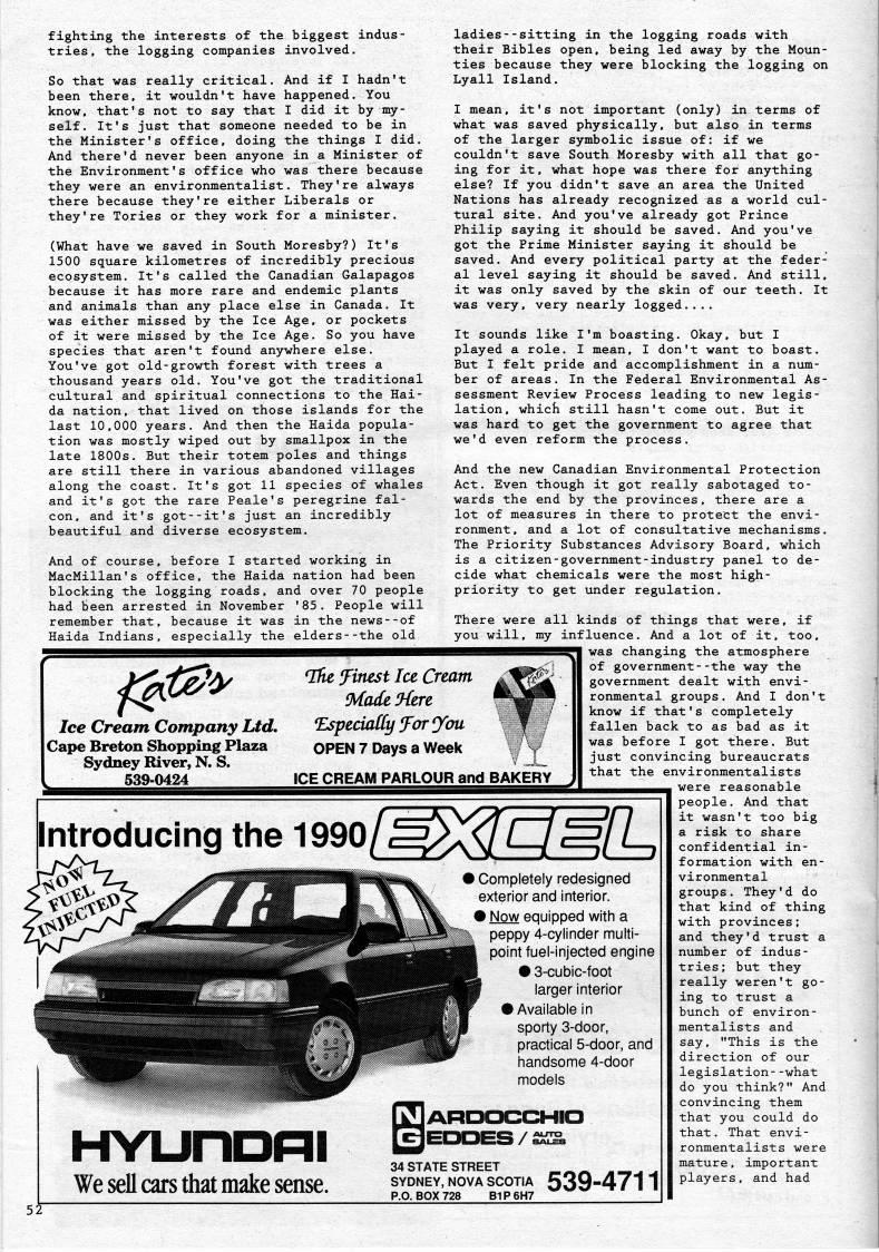 Published by Ronald Caplan on 1990/1/1 (139 reads)fighting the interests of the biggest indus? tries, the logging companies involved. So that was really critical. And if I hadn't been there, it wouldn't have happened. You know, that's not to say that I did it by my? self. It's just that someone needed to be in the Minister's office, doing the things I did. And there'd never been anyone in a Minister of the Environment's office who was there because they were an environmentalist. They're always there because they're either Liberals or they're Tories or they work for a minister, (What have we saved in South Moresby?) It's 1500 square kilometres of incredibly precious ecosystem. It's called the Canadian Galapagos because it has more rare and endemic plants and animals than any place else in Canada. It was either missed by the Ice Age, or pockets of it were missed by the Ice Age. So you have species that aren't found anywhere else. You've got old-growth forest with trees a thousand years old. You've got the traditional cultural and spiritual connections to the Hai? da nation, that lived on those islands for the last 10.000 years. And then the Haida popula? tion was mostly wiped out by smallpox in the late 1800s. But their totem poles and things are still there in various abandoned villages along the coast. It's got 11 species of whales and it's got the rare Peale's peregrine fal? con, and it's got--it's just an incredibly beautiful and diverse ecosystem. And of course, before I started working in MacMillan's office, the Haida nation had been blocking the logging roads, and over 70 people had been arrested in November '85. People will remember that, because it was in the news--of Haida Indians, especially the elders--the old ''' Ice Cream Company Ltd, Cape Breton Shopping Plaza Sydney River, N. S. , 539-0424 'Ihe finest Ice Cream Made 'Here *EspeciaC(y for 'ou OPEN 7 Days a Week ICE CREAM PARLOUR and BAKERY ladies--sitting in the logging roads with their Bibles open, being led away by the Moun- ties because they were blocking the logging on Lyall Island. I mean, it's not important (only) in terms of what was saved physically, but also in terms of the larger symbolic issue of: if we couldn't save South Moresby with all that go? ing for it, what hope was there for anything else? If you didn't save an area the United Nations has already recognized as a world cul? tural site. And you've already got Prince Philip saying it should be saved. And you've got the Prime Minister saying it should be saved. And every political party at the feder? al level saying it should be saved. And still, it was only saved by the skin of our teeth. It was very, very nearly logged..,. It sounds like I'm boasting. Okay, but I played a role. I mean, I don't want to boast. But I felt pride and accomplishment in a num? ber of areas. In the Federal Environmental As? sessment Review Process leading to new legis? lation, which still hasn't come out. But it was hard to get the government to agree that we'd even reform the process. And the new Canadian Environmental Protection Act. Even though it got really sabotaged to? wards the end by the provinces, there are a lot of measures in there to protect the envi? ronment, and a lot of consultative mechanisms. The Priority Substances Advisory Board, which is a citizen-government-industry panel to de? cide what chemicals were the most high- priority to get under regulation. There were all kinds of things that were, if you will, my influence. And a lot of it, too, was changing the atmosphere of government--the way the government dealt with envi? ronmental groups. And I don't know if that's completely fallen back to as bad as it was before I got there. But just convincing bureaucrats that the environmentalists were reasonable Introducing the 199o/''/Z/'/7-, HYunoni We sell cars that make sense. > Completely redesigned exterior and interior. • Now equipped with a peppy 4-cylinder multi? point fuel-injected engine • 3-cubic-foot larger interior • Available in sporty 3-door, practical 5-door, and handsome 4-door models 34 STATE STREET ' --'' SYDNEY, NOVA SCOTIA 539-471 1 P.O. BOX 728 B1P6H7 people. And that it wasn't too big a risk to share confidential in? formation with en? vironmental groups. They'd do that kind of thing with provinces; and they'd trust a number of indus? tries; but they really weren't go? ing to trust a bunch of environ? mentalists and say, "This is the direction of our legislation--what do you think?" And convincing them that you could do that. That envi? ronmentalists were mature, important players, and had