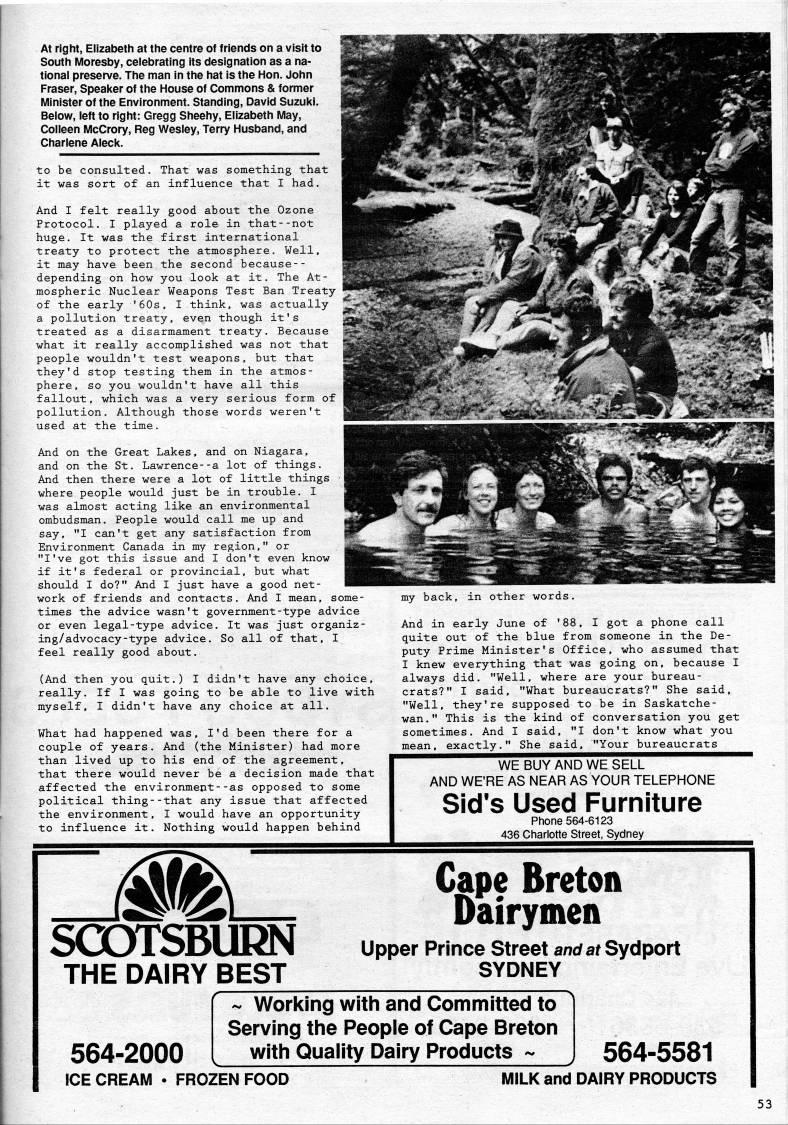 Published by Ronald Caplan on 1990/1/1 (143 reads)At right, Elizabeth at the centre of friends on a visit to South Moresby, celebrating its designation as a na? tional preserve. The man in the hat is the Hon. John Fraser, Speaker of the House of Commons & former Minister of the Environment. Standing, David Suzuiti. Below, left to right: Gregg Sheehy, Elizabeth May, Colleen McCrory, Reg Wesley, Terry Husband, and Charlene Aleck. to be consulted. That was something that it was sort of an influence that I had. And I felt really good about the Ozone Protocol. I played a role in that--not huge. It was the first international treaty to protect the atmosphere. Well, it may have been the second because-- depending on how you look at it. The At? mospheric Nuclear Weapons Test Ban Treaty of the early '60s, I think, was actually a pollution treaty, even though it's treated as a disarmament treaty. Because what it really accomplished was not that people wouldn't test weapons, but that they'd stop testing them in the atmos? phere, so you wouldn't have all this fallout, which was a very serious form of pollution. Although those words weren't used at the time. And on the Great Lakes, and on Niagara, and on the St. Lawrence--a lot of things. And then there were a lot of little things where people would just be in trouble. I was almost acting like an environmental ombudsman. People would call me up and say. "I can't get any satisfaction from Environment Canada in my region," or "I've got this issue and I don't even know if it's federal or provincial, but what should I do?" And I just have a good net? work of friends and contacts. And I mean, some? times the advice wasn't government-type advice or even legal-type advice. It was just organiz? ing/advocacy-type advice. So all of that, I feel really good about. (And then you quit.) I didn't have any choice, really. If I was going to be able to live with myself, I didn't have any choice at all. What had happened was, I'd been there for a couple of years. And (the Minister) had more than lived up to his end of the agreement, that there would never be a decision made that affected the environment--as opposed to some political thing--that any issue that affected the environment, I would have an opportunity to influence it. Nothing would happen behind my back, in other words. And in early June of '88, I got a phone call quite out of the blue from someone in the De? puty Prime Minister's Office, who assumed that I knew everything that was going on, because I always did. "Well, where are your bureau? crats?" I said, "What bureaucrats?" She said, "Well, they're supposed to be in Saskatche? wan." This is the kind of conversation you get sometimes. And I said, "I don't know what you mean, exactly." She said, "Your bureaucrats WE BUY AND WE SELL AND WERE AS NEAR AS YOUR TELEPHONE Sid's Used Furniture Phone 564-6123 436 Charlotte Street, Sydney mm SCOTSBURN THE DAIRY BEST Cape Breton Dairymen Upper Prince Street andarSydport SYDNEY 564-2000 ICE CREAM . FROZEN FOOD ~ Working with and Committed to Serving the People of Cape Breton with Quality Dairy Products - 564-5581 MILK and DAIRY PRODUCTS