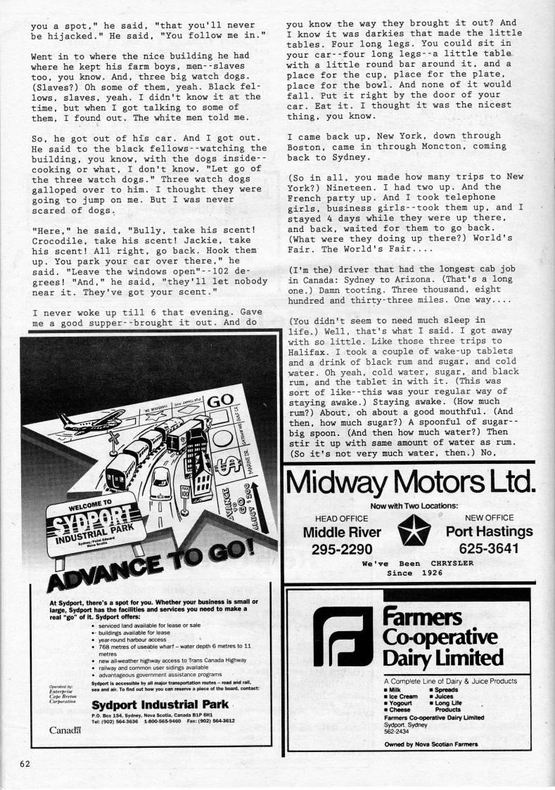 you a spot," he said, "that you'll never be hijacked." He said. "You follow me in." Went in to where the nice building he had where he kept his farm boys, men--slaves too, you know. And, three big watch dogs. (Slaves?) Oh some of them, yeah. Black fel? lows, slaves, yeah. I didn't know it at the time, but when I got talking to some of them, I found out. The white men told me. you know the way they brought it out? And I know it was darkies that made the little tables. Four long legs. You could sit in your car--four long legs--a little table with a little round bar around it, and a place for the cup. place for the plate, place for the bowl. And none of it would fall. Put it right by the door of your car. Eat it. I thought it was the nicest thing, you know. So, he got out of his car. And I got out. He said to the black fellows--watching the building, you know, with the dogs inside-- cooking or what, I don't know. "Let go of the three watch dogs." Three watch dogs galloped over to him. I thought they were going to jump on me. But I was never scared of dogs. "Here," he said, "Bully, take his scent! Crocodile, take his scent! Jackie, take his scent! All right, go back. Hook them up. You park your car over there," he said. "Leave the windows open"--102 de? grees! "And," he said, "they'll let nobody near it. They've got your scent." I never woke up till 6 that evening. Gave me a good supper--brought it out. And do '00' At Sydport, there's a spot for you. Whether your business is small or large, Sydport has the facilities and services you need to make a real "go" of it. Sydport offers: • serviced land available for lease or sale • ?? buildings available for lease • year-round harbour access • 768 metres of useable wharf - w'ater depth 6 metres to 11 • new all-weather highway access to Trans Canada Highway • railway and common user sidings available • advantageous government assistance programs -'f., Sydport is accessible by all major transportation routes - road and rail, Enterprise **3 3"'' 3''- '? ''"*' ""* • ""* >?" "' reserve a piece of the board, contact: Cape Breton Corporation '''' Industridl Pdrlc Canada I came back up. New York, down through Boston, came in through Moncton, coming back to Sydney. (So in all. you made how many trips to New York?) Nineteen. I had two up. And the French party up. And I took telephone girls, business girls--took them up, and I stayed 4 days while they were up there, and back, waited for them to go back. (What were they doing up there?) World's Fair. The World's Fair.... (I'm the) driver that had the longest cab job in Canada: Sydney to Arizona. (That's a long one.) Damn tooting. Three thousand, eight hundred and thirty-three miles. One way.... (You didn't seem to need much sleep in life.) Well, that's what I said. I got away with so little. Like those three trips to Halifax. I took a couple of wake-up tablets and a drink of black rum and sugar. and cold water. Oh yeah, cold water, sugar, and black rum. and the tablet in with it. (This was sort of like--this was your regular way of staying awake.) Staying awake. (How much rum?) About, oh about a good mouthful. (And then, how much sugar?) A spoonful of sugar-- big spoon. (And then how much water?) Then stir it up with same amount of water as rum. (So it's not very much water, then.) No, Midway Motors Ltd. Now with Two Locations: HEAD OFFICE '' NEW OFFICE Middle River '' Port Hastings 295-2290 "'' 625-3641 We've Been CHRYSLER Since 1926 e Rimners Co-operative Dairy Limited A Complete Line of Dairy & Juice Products ?? Milk ?? Spreads ?? Ice Cream ?? Juices ?? Yogourt ?? Long Life ?? Cheese Products Farmers Co-operative Dairy Limited Sydport. Sydney 562-2434 Owned by Nova Scotian Fanners