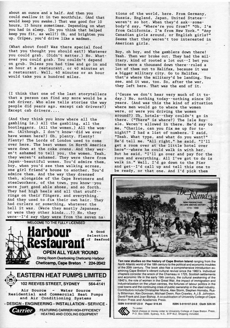 about an ounce and a half. And then you could swallow it in two mouthfuls. (And that would keep you awake.) That was good for 10 hours, 15 hours sometimes. Depending on what you had in sleep. (Do you think that helped keep you fit, as well?) Oh. and brighten you up. Cripes. you'd drive like a madman. (What about food? Was there special food that you thought you should eat?) Whatever you could grab. (Didn't matter.) No. What? ever you could grab. You couldn't depend on grub. Unless you had time and go in and an hour at a restaurant, or 40 minutes at a restaurant. Well, 40 minutes or an hour would take you a hundred miles. (I think that one of the last storytellers that a person can find any more would be a cab driver. Who else tells stories the way people did years ago, except cab drivers?) Except cab drivers.... (And they think you know where all the gambling is.) All the gambling, all the bootleggers. (All the women.) All the wom? en. (Although, I don't know--did we ever have women here?) Oh, plenty. Plenty! Plenty! The Lords of London'used to come over here. The best women in North America were down at the coke ovens. And they wer? en't ashamed to tell you, the women. Yeah, they weren't ashamed. They were there from Japan--beautiful women. You'd admire them, boy. when you'd see them walking across, one girl friend's house to another. You'd admire them. And the way they dressed then, alongside of the Cape Bretoners and steelworkers, of the town, you know--you wore just good able shoes, and so forth. They had high heels and all that stuff-- rings on their fingers, and everything. And they used to fix their own hair. They had curlers or something, whatever the hell it was. (Were they mostly Japanese, or were they other kinds...?) No, they were--I'd say they were from the seven na- WELCOME TO THE FULLY LICENSED Harbour Restaurant A Good Selection of Seafood tions of the world, here. From Germany, Russia, England, Japan, United States • weren't so hot. When they'd ask--some? body 'd say, "Where're you from?" "Oh, I'm from California. I'm from New York." "Any Canadian girls around, or English girls?" Seems that they weren't too interested in American girls. Boy, oh boy, and the gamblers down there! Yeah. Then war broke out. They had the mil? itary, kind of rooted a lot out--I bet you there were a thousand down there--ruled a lot of them out to Halifax, because it was a bigger military city. Go to Halifax, that's where the military'd be landing. You see. and it was, too. So, after the war, they left here. That was the end of it. ('Cause we don't hear very much of it to? day.) No. nothing today--nothing since 20 years. (And was this the kind of situation where men would go to where the women were, or were you driving the women around?) Uh. hotels--they couldn't go in there. ("There" is where?) The Isle Roy- ale. Weren't allowed in there. He'd say to me. "Charlie, can you fix me up for to? night?" I had a list of numbers. I said. "Yeah. What type, and what do you want?" He'd tell me. "All right," he said, "I'll get a room over at the little hotel over here"--where he could walk in with her. But he said, "I'll go over and pay for the room and everything. All I've got to do is walk in." Well, I'd go down to the Pier and get--I'd call up and tell this one to be ready, or that one. And I'd pick them OPEN ALL YEAR 'ROUND Dining Room Overlooking Chetlcamp Harbour Cheticamp, Cape Breton * 224-2042 EASTERN HEAT PUMPS LIMITED 102 REEVES STREET, SYDNEY 564-4141 Air Source - Water Source Residential and Commercial Heat Pumps and Air Conditioning Systems - DESIGNj'NGINEERING - INSTALLATION - SERVICE - FEATURING CARRIER HIGH-EFFICIENCY HEATING AND COOLING EQUIPMENT Kennetti'jonovan Ten new studies on the history of Cape Breton Island ranging from the North Atlantic world of the 18th century to the political and economic troubles of the 20th century. The book also has a comprehensive introduction ex? amining Cape Breton's vibrant cultural revival since the 1960's. Individual chapters consider the wreck of the Chameau in 1725, Scottish settlements and economic life in the early 19th century, the cultural awakening of the 1840's, the role of women in the Great War, the impact of immigration and industrialization on the urban centres, the fortunes of labour politics in the coal towns and the continuing crisis of public ownership in the steel industry. Contributors include Christopher Moore, Alex Storm, Stephen Hornsby, Rus? ty Bitterman, Ken Donovan, Michael Owen, Ron Crawley, A.J.B. Johnston, David Frank and Joan Bishop. A co-publication of University College of Cape Breton Press and Acadiensis Press. ISBN 0-919107-23-0 Paper SI 6.95 ISBN 0-919107-24-9 Cloth $29.95 To order: Send cheque or money order to University College of Cape Breton Press, P.O. Box 5300, Sydney, N.S., BIP 6L2, Shipping included.