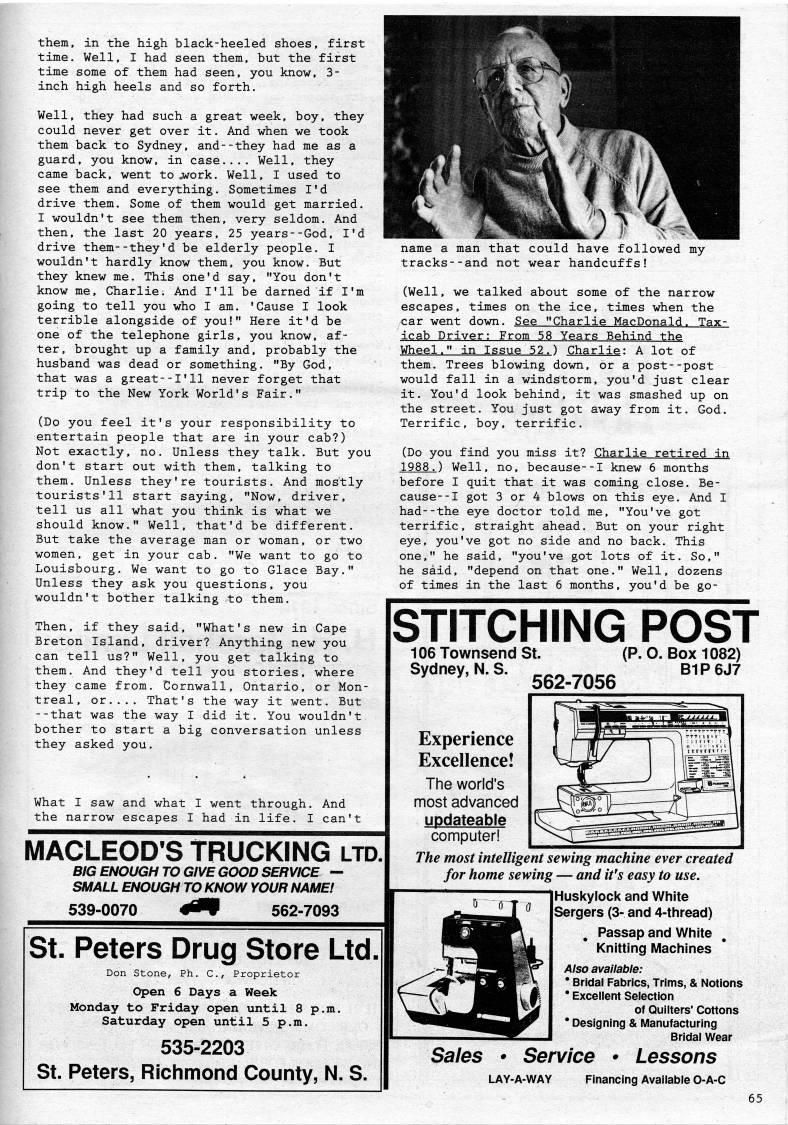 them, in the high black-heeled shoes, first time. Well, I had seen them, but the first time some of them had seen, you know, 3- inch high heels and so forth. Well, they had such a great week, boy, they could never get over it. And when we took them back to Sydney, and--they had me as a guard, you know, in case.... Well, they came back, went to ,work. Well, I used to see them and everything. Sometimes I'd drive them. Some of them would get married. I wouldn't see them then, very seldom. And then, the last 20 years, 25 years--God, I'd drive them--they'd be elderly people. I wouldn't hardly know them, you know. But they knew me. This one'd say, "You don't know me, Charlie; And I'll be darned if I'm going to tell you who I am. 'Cause I look terrible alongside of you!" Here it'd be one of the telephone girls, you know, af? ter, brought up a family and, probably the husband was dead or something. "By God, that was a great--I'11 never forget that trip to the New York World's Fair." (Do you feel it's your responsibility to entertain people that are in your cab?) Not exactly, no. Unless they talk. But you don't start out with them, talking to them. Unless they're tourists. And mostly tourists'11 start saying. "Now, driver, tell us all what you think is what we should know." Well, that'd be different. But take the average man or woman, or two women, get in your cab. "We want to go to Louisbourg. We want to go to Glace Bay." Unless they ask you questions, you wouldn't bother talking to them. Then, if they said, "What's new in Cape Breton Island, driver? Anything new you can tell us?" Well, you get talking to them. And they'd tell you stories, where they came from. Cornwall, Ontario, or Mon? treal, or.... That's the way it went. But --that was the way I did it. You wouldn't bother to start a big conversation unless they asked you. What I saw and what I went through. And the narrow escapes I had in life. I can't MACLEOD'S TRUCKING ltd. BIG ENOUGH TO GIVE GOOD SERVICE • SMALL ENOUGH TO KNOW YOUR NAME! 539-0070 562-7093 St. Peters Drug Store Ltd. Don Stone, Ph. C, Proprietor Open 6 Days a Week Monday to Friday open until 8 p.m. Saturday open until 5 p.m. 535-2203 St. Peters, Richmond County, N. S. name a man that could have followed my tracks--and not wear handcuffs! (Well, we talked about some of the narrow escapes, times on the ice, times when the car went down. See "Charlie MacDonald. Tax- icab Driver: From 58 Years Behind the Wheel." in Issue 52.) Charlie: A lot of them. Trees blowing down, or a post--post would fall in a windstorm, you'd just clear it. You'd look behind, it was smashed up on the street. You just got away from it. God. Terrific, boy, terrific. (Do you find you miss it? Charlie retired in 1988.) Well, no, because--I knew 6 months before I quit that it was coming close. Be? cause- -I got 3 or 4 blows on this eye. And I had--the eye doctor told me, "You've got terrific, straight ahead. But on your right eye, you've got no side and no back. This one," he said, "you've got lots of it. So," he said, "depend on that one." Well, dozens of times in the last 6 months, you'd be go- stitching post 106 Townsend St. Sydney, N. S 562-7056 (P.O. Box 1082) B1P6J7 Experience Excellence! The world's most advanced updateable computer! The most intelligent sewing machine ever created for home sewing • and it's easy to use. Huskylock and White Sergers (3- and 4-thread) Passap and White Knitting Machines Also available: • Bridal Fabrics, Trims, & Notions • Excellent Selection of Qui Iters' Cottons 'Designing & Manufacturing Bridal Wear • Service • Lessons 'Y-A-WAY Financing Available O-A-C