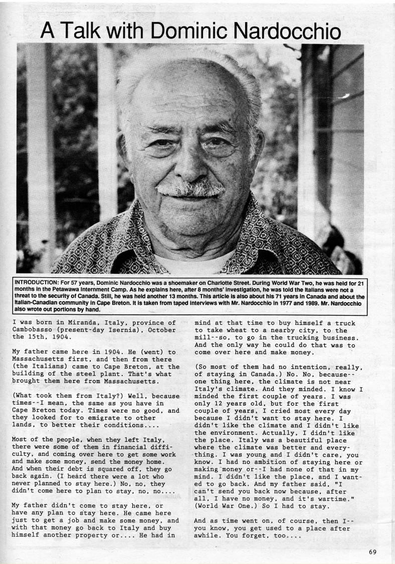 A Talk with Dominic Nardocchio INTRODUCTION: For 57 years, Dominic Nardocchio was a shoemaker on Charlotte Street. During World War Two, he was held for 21 months in the Petawawa Internment Camp. As he explains here, after 8 months' Investigation, he was told the Italians were not a threat to the security of Canada. Still, he was held another 13 months. This article is also about his 71 years in Canada and about the Italian-Canadian community in Cape Breton. It is taken from taped interviews with Mr. Nardocchio In 1977 and 1989. Mr. Nardocchio also wrote out portions by hand. I was born in Miranda, Italy, province of Cambobasso (present-day Isernia), October the 15th, 1904. My father came here in 1904. He (went) to Massachusetts first, and then from there (the Italians) came to Cape Breton, at the building of the steel plant. That's what brought them here from Massachusetts. (What took them from Italy?) Well, because times--I mean, the same as you have in Cape Breton today. Times were no good, and they looked for to emigrate to other lands, to better their conditions.... Most of the people, when they left Italy, there were some of them in financial diffi? culty, and coming over here to get some work and make some money, send the money home. And when their debt is squared off, they go back again. (I heard there were a lot who never planned to stay here.) No, no, they didn't come here to plan to stay, no, no.... My father didn't come to stay here, or have any plan to stay here. He came here just to get a job and make some money, and with that money go back to Italy and buy himself another property or.... He had in mind at that time to buy himself a truck to take wheat to a nearby city, to the mill--so, to go in the trucking business. And the only way he could do that was to come over here and make money. (So most of them had no intention, really, of staying in Canada.) No. No, because-- one thing here, the climate is not near Italy's climate. And they minded. I know I minded the first couple of years. I was only 12 years old, but for the first couple of years, I cried most every day because I didn't want to stay here. I didn't like the climate and I didn't like the environment. Actually, I didn't like the place. Italy was a beautiful place where the climate was better and every? thing. I was young and I didn't care, you know. I had no ambition of staying here or making money or--I had none of that in my mind. I didn't like the place, and I want? ed to go back. And my father said, "I can't send you back now because, after all, I have no money, and it's wartime." (World War One.) So I had to stay. And as time went on, of course, then I-- you know, you get used to a place after awhile. You forget, too....