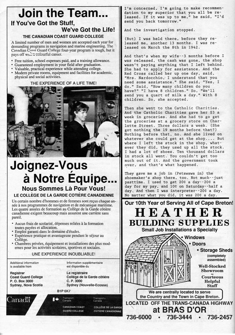 Published by Ronald Caplan on 1990/1/1 (198 reads)Join the Team... If YouVe Got the Stuff, We've Got the Life! THE CANADIAN COAST GUARD COLLEGE "A Umited number of men and women are accepted each year for demanding programs in navigation and marine engineering. The Canadian Con<;t Guard College four-year program is tough, but it pays off wiuiacolourful career. • Free tuition, school expenses paid, and a training allowance. • Guaranteed employment in your field after graduation. • Valuable, practical experience while attending college. • Modem private rooms, equipment and facilities for academic, physical and social activities. THE EXPERIENCE OF A LIFE TIME! Joignez-Vous a Notre Equipe... Nous Sommes La Pour Vous! LE COLLEGE DE LA GARDE COTIERE CANADIENNE Un certain nombre d'hommes et de femmes sont re'us chaque an- nee a nos programmes de navigation et de mecanique maritime. Les quatre annees de formation au College de la Garde cotiere canadienne exigent beaucoup mais assurent une carriere sans pareil. • Aucun frais de scolarite, depenses reliees a la formation toutes payees et allocation. • Emploi garanti dans le domaine d'etudes. • Experience pratique et avantageuse pendant le sejour au College. • Chambres privees, equipement et installations des plus mod- emes pour les activites scolaires, sportives et sociales. UNE EXPERIENCE INOUBLIABLE! Additional information is available from Registrar Coast Guard College P. O. Box 3000 Sydney, Nova Scotia Information suppiementaire est disponible du Le reglstraire College de la Garde cdti're C. P.3000 Sydney (Nouveiie-Ecosse) I'm concerned, I'm going to make recommen? dation to my superior that you all be re? leased. If it was up to me," he said, "I'd send you back tomorrow." And the investigation stopped. (But) I was held there, before they re? leased me, another 13 months. I was re? leased on March the 8th in 1942. And that's when my wife--3 months before I was released, the cash was gone, the shop wasn't paying anything that I left behind. She had to apply for assistance. And the Red Cross called her up one day, said, "Mrs. Nardocchio,' I understand that you need some assistance." She said, "Yes, I do." Said, "How many children do you have?" "I have 8 children." So, "We'll send you a quart of milk a day." With 8 children. So. she accepted. Then she went to the Catholic Charities. And the Catholic Charities gave her $3 a week in groceries. And she had to go get the groceries at a grocery store on Char? lotte Street. Three dollars a week. (She got nothing the 19 months before that?) Nothing before that, no. And she lived on whatever she could get at the shop.... But where I left the stock in the shop, what? ever they did, they used up all the stock. I had a lot of shoes. Ten thousand dollars in stock all went. You couldn't get too much out of it. And the government took over, and that's what happened. They gave me a job in (Petawawa in) the shoemaker's shop there, too. Not much--just pasttime. I used to get 200 a day--200 a day for my pay, and 100 on Saturday--half a day. And then I was interpreter--200 a day. No matter what you did, it was 200 a day. Our 10th Year of Serving All of Cape Breton! HEATHER BUILDING SUPPLIES Small Job Installations a Specialty sr Windows > Doors • Storage Sheds (completely assembled) WeU-Stocked Showroom Courteous Helpful Staff We are centrally located to serve I the Country and the Town in Cape Breton. LOCATED OFF THE TRANS-CANADA HIGHWAY at BRAS D'OR 736-6000 • 736-3444 • 736-2457