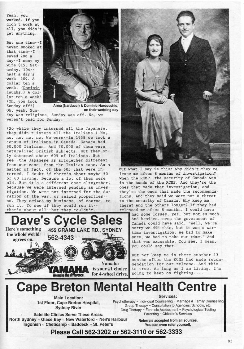 Published by Ronald Caplan on 1990/1/1 (201 reads)Yeah, you worked. If you didn't work at all, you didn't get anything. But one time--I never smoked at that time--I saved 200 a day--I sent my wife $15. Sat? urday, 100-- half a day's work, 100. A dollar ten a week. (Dominic laughs.) A dol? lar ten a week! (Oh, you took Sunday off!) Oh, yeah, Sun- Anna (Narducci) & Dominic Nardocchio, on their wedding day No, we day was religious, Sunday was off weren't paid for Sunday. (So while they interned all the Japanese, they didn't intern all the Italians.) No, no, no, no, no. We were--in 1938 we took a census of Italians in Canada. Canada had 90,000 Italians. And 70,000 of them were naturalized British subjects. But they on? ly interned about 605 of Italians. But see--the Japanese is altogether different from our case, from the Italian case. As a matter of fact, of the 605 that were in? terned, I doubt if there's about maybe 50 or 60 living. Because a lot of them were old. But it's a different case altogether, because we were interned pending an inves? tigation. We were not interned for the du? ration of the war, or seized properties-- no. They seized my business, of course, to run it. To see if they could run it-- that's about all--but they couldn't. Dave's Cycle Sales Here's something the whole world agrees on 455 GRAND LAKE RD., SYDNEY 562-4343 XA We make the diffefEfice. Yamaha is your #1 choice for 4-wheel drive. But what I say is this: why didn't they re? lease me after 8 months of investigation? When the RCMP--the security of Canada was in the hands of the RCMP. And they're the ones that made that investigation, and they're the ones that made the recommenda? tions. And they said we were not a threat to the security of Canada. Why keep me there? And the others longer? If they had released me after 8 months, I would have had some losses, yes, but not as much. And besides, even the government of Canada could have said, "Well, we're sorry we did this, but it was a war? time investigation. We had to make sure, we had to take our time." And that was excusable. You see, I mean, you could say that. But not keep me in there another 13 months after the RCMP had made recom? mendation for our release. And this is true. As long as I am living, I'm going to keep on fighting.... Cape Breton Mental Health Centre Main Location: 1st Floor, Cape Breton Hospital, Sydney River Satellite Clinics Serve These Areas: Services Psychotherapy ~ Individual Counselling ~ Marriage & Family Counselling Group Therapy ~ Consultation to Agencies, Schools, etc. Drug Therapy - Forensic Assessment ~ Psychological Testing Parenting ~ Children's Services North Sydney ~ Glace Bay ~ New Waterford ~ Neil's Harbour Ingonish ~ Cheticamp ~ Baddeck ~ St. Peter's Please Call 562-3202 or 562-3110 or 562-3333 Referrals accepted from all sources. You can even refer yourself.