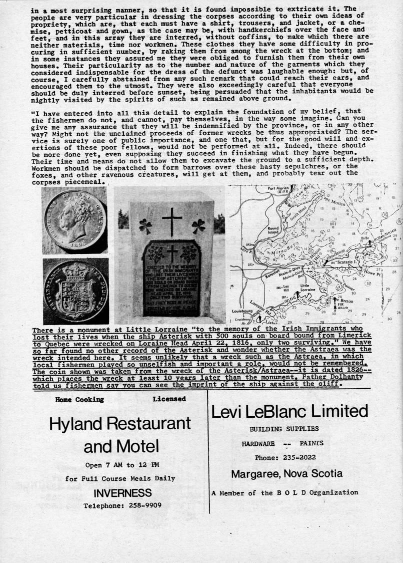 in a most surprising manner, so that it is found impossible to extricate it. The people are very particular in dressing the corpses according to their own ideas of propriety, which are, that each must have a shirt, trousers, and jacket, or a che? mise, petticoat and gown, as the case may be, with handkerchiefs over the face and feet, and in this array they are interred, without coffins, to raake *hich there are neither raaterials, time nor workraen. These clothes they have sorae difficulty in pro? curing in sufficient number, by raking thera frora araong the wreck at the bottom; and in some instances they assured me they were obliged to furnish thera frora their own houses. Their particularity as to the nuraber and nature of the garraents which they considered indispensable for the dress of the defunct was lat'hable enough: but, of course, I carefully abstained from any such remark that could reach their ears, and encouraged them to the utmost. They were also exceedingly careful that everyone should be duly interred before sunset, being persuaded that the inhabitants would be nightly visited by the spirits of such as remained above ground. "I have entered into all this detail to explain the foundation of my belief, that the fisherraen do not, and cannot, pay theraselves, in the way sorae iraagine. Can you give me any assurance that they will be indemnified by the province, or in any other way? Might not the unclaimed proceeds of former wrecks be thus appropriated? The ser? vice is surely one of public importance, and one that, but for the good will and ex? ertions of these poor fellows, would not be performed at all. Indeed, there should be raore done yet, even supposing they succeed in finishing what they have begun. Their time and means do not allow them to excavate the ground to a sufficient depth. Workmen should be dispatched to form barrows over these hasty sepulchres, or the foxes, and other ravenous creatures, will get at them, and probably tear out the corpses piecemeal. rt Morien J'-''j / 'i' '' * ' T 5t i There is a raonuraent at Little Lorraine "to the raeraory of the Irish Iraraigrants who lost their lives when the ship Asterisk with 500 souls on board bound frora Liraerick • '' Quebec were wrecked on Loraine Head April 22, 1816. only two surviving." We have tiar found no other record of the Asterisk and wonder whether the Astraea was the wreck intended here. It seeras unlikely that a wreck such as the Astraea. in which local fisherraen played so imselfish and important a role, would not be reraerabered. The coin shown was taken from the wreck of the Asterisk/Astraea • it is dated 1826-'- which Places the wreck at least 10 years later than the monument. Father Dolhantv told us fisherraen say you can see the iraprint of the ship against the clifFI Home Cooking Licensed Hyland Restaurant and Motel Open 7 AM to 12 m for Full Course Meals Daily INVERNESS Telephone: 2S8-9909 Levi LeBlanc Limited BUILDIN3 SUPPLIES HARDWARE • PAINIS Phone: 235-2022 Margaree, Nova Scotia A Meraber of the BOLD Organization