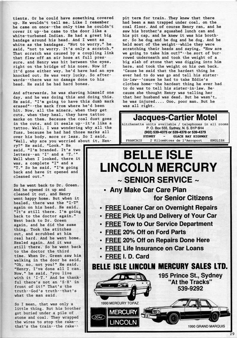 Published by Ronald Caplan on 1990/6/1 (247 reads)tients. Or he could have something covered up. He wouldn't tell me. Like I remember he came on once--the only time he couldn't cover it up--he came to the door like a white-turbaned Indian. He had a great big bandage around his head. And I went as white as the bandages. "Not to worry," he said, "not to worry. It's only a scratch." That scratch was caused by a coupling link that flew off an air hose at full pres? sure, and Henry was hit between the eyes, right on the bridge of his nose. Now if it'd gone either way, he'd have had an eye knocked out. He was very lucky. So after? wards- -there was no damage done to his head. He said he had hard bones. And afterwards, he was shaving himself one day, and he was doing this and doing this. He said, "I'm going to have this dumb mark erased"--the mark from where he'd been hit. Now, all the miners, when they get cuts, when they heal, they have tattoo marks on them. Because the coal dust goes in the cuts, and it seals up--it's like a tattoo. Well, I was wondering why all the fuss, because he had had those marks all over his body, more or less. So I said, "Well, why are you worried about it, Hen? ry?" He said, "Look." He said, "I'm branded. It's two letters--an 'I' and a 'T.'" Well when I looked, there it was, a complete "I" and a "T." So he said, "I'm going back and have it opened and cleaned out." pit term for train. They knew that there had been a man trapped under coal, on the coal floor. And of course Henry ran, and he saw his brother's squashed lunch can and his pit cap, and he knew it was his broth? er. So he dug and he dug and he dug. And he held most of the weight--while they were scratching their heads and saying, "How are we going to take him out?"--he sort of bur? rowed underneath and took the weight of a big slab of stone that was digging into him here, and took the weight on his own back. 'Cause he said that the hardest thing he ever had to do was go and tell his sister- in-law-- 'cause he had to take Eddie's clothes home--the hardest thing he ever had to do was to tell his sister-in-law. Be? cause she thought Henry was telling her that her husband was dead. But he wasn't, he was injured.... Ooo, poor man. But he was all right. So he went back to Dr. Green. And he opened it up and cleaned it out, and Henry went happy home. But when it healed, there was the "l-T" again on his head. He said, "It's still there. I'm going back to the doctor again." Went back to Dr. Green again, and he did the same thing. Took the stitches out, and scrubbed at him real hard. And he went home. Healed again. And it was still there. So he went back to the doctor the third time. When Dr. Green saw him walking in the door he said, "Oh, no, not you!" He said, "Henry, I've done all I can. Now," he said, "you live with it 'I-T.' And be thank? ful there's not an 'S-H' in front of it!" That's the truth--God's truth--that's what the man said. So I mean, that was only a little thing. But his brother got buried under a pile of stone and coal. They wrapped the wires to stop the rake-- that's the train--the rake-- Jacques-Cartier Motel kitchenette units available / telephones in all rooms P. O. Box 555, Sydney, N. S. 81P 6H4 (902) 539-4375 or 539-4378 or 539-4379 SYDNEY - GLACE BAY HIGHWAY FRANCAIS 2 Kilometres de I'Aeroport ENGLISH BELLE ISLE LINCOLN MERCURY ~ SENIOR SERVICE ~ • Any Make Car Care Plan for Senior Citizens FREE Leaner Gar on Overnight Repairs FREE Pick Up and Delivery of Your Car FREE Tow to Our Service Department FREE 20% Off on Ford Parts FREE 20% Off on Repairs Done Here FREE Life Insurance on Car Loans FREE I. D. Card BELLE ISLE LINCOLN MERCURY SALES LTD. 195 Prince St., Sydney "At the Tracks" 539-9292 1990 MERCURY TOPAZ MERCURY 1990 GRAND MARQUIS