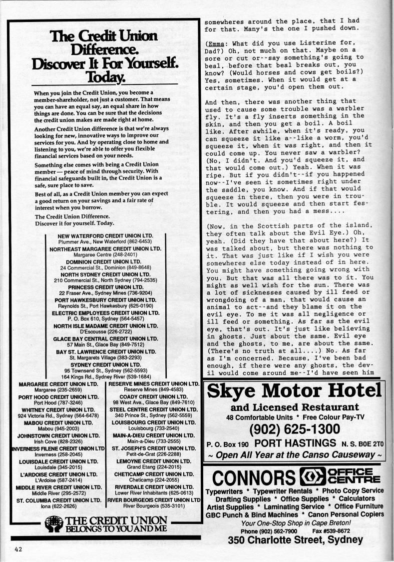 Published by Ronald Caplan on 1990/6/1 (220 reads)Hie Credit Unkm DifiEerence. Discover It Rirbi]tself. Today. When you join the Credit Union, you become a member-shareholder, not just a customer. That means you can have an equal say, an equal share in how things are done. You can be sure that the decisions the credit union makes are made right at home. Another Credit Union difference is that we're always looking for new, irmovative ways to improve our services for you. And by operating close to home and listening to you, we're able to offer you flexible financial services based on your needs. Something else comes with being a Credit Union member • peace of mind through security. With financial safeguards built in, the Credit Union is a safe, sure place to save. Best of all, as a Credit Union member you can expect a good return on your savings and a fair rate of interest when you borrow. The Credit Union Difference. Discover it for yourself. Today. NEW WATERFORD CREDIT UNION LTD. Piummer Ave., New Waterford (862-6453) NORTHEAST MARGAREE CREDIT UNION LTD. Margaree Centre (248-2401) DOMINION CREDIT UNION LTD. 24 Commercial St., Dominion (849-8648) NORTH SYDNEY CREDIT UNION LTD. 210 Commercial St., North Sydney (794-2535) PRINCESS CREDIT UNION LTD. 22 Fraser Ave., Sydney Mines (736-9204) PORT HAWKESBURY CREDIT UNION LTD. Reynolds St., Port Hawkesbury (625-0190) ELECTRIC EMPLOYEES CREDIT UNION LTD. P. O. Box 610, Sydney (564-5457) NORTH ISLE MADAME CREDIT UNION LTD. D'Escousse (226-2722) GLACE BAY CENTRAL CREDIT UNION LTD. 57 Main St.. Glace Bay (849-7512) BAY ST. LAWRENCE CREDIT UNION LTD. St. Margarets Village (383-2293) SYDNEY CREDIT UNION LTD. 95 Townsend St.. Sydney (562-5593) 164 Kings Rd., Sydney River (539-1684) MARGAREE CREDIT UNION LTD. Margaree (235-2659) PORT HOOD CREDIT UNION LTD. Port Hood (787-3246) WHITNEY CREDIT UNION LTD. 924 Victoria Rd., Sydney (564-6478) MABOU CREDIT UNION LTD. Mabou (945-2003) JOHNSTOWN CREDIT UNION LTD. Irish Cove (828-2326) Inverness rlene credit union ltd| Inverness (258-2045) LOUISDALE credit UNION LTD. Louisdale (345-2015) L'ARDOISE CREDIT UNION LTD. L'Ardoise (587-2414) MIDDLE RIVER CREDIT UNION LTD. Middle River (295-2572) ST. COLUMBA CREDIT UNION LTD. lona (622-2626) RESERVE MINES CREDIT UNION LTD. Reserve Mines (849-4583) COADY CREDIT UNION LTD. 98 West Ave., Glace Bay (849-7610) STEEL CENTRE CREDIT UNION LTD. 340 Prince St., Sydney (562-5559) LOUISBOURG CREDIT UNION LTD. Louisbourg (733-2540) MAIN-A-DIEU CREDIT UNION LTD. Main-a-Dieu (733-2555) ST. JOSEPH'S CREDIT UNION LTD. Petit-de-Grat (226-2288) LEMOYNE CREDIT UNION LTD. Grand Etang (224-2015) CHETICAMP CREDIT UNION LTD. Cheticamp (224-2055) RIVERDALE CREDIT UNION LTD. Lower River Inhabitants (625-0613) RIVER BOURGEOIS CREDIT UNION LTD River Bourgeois (535-3101) THE CREDIT UNION, ffiUOSlGS'IOYCXJANDME somewheres around the place, that I had for that. Many's the one I pushed down. (Emma: What did you use Listerine for. Dad?) Oh, not much on that. Maybe on a sore or cut or--say something's going to beal, before that beal breaks out, you know? (Would horses and cows get boils?) Yes, sometimes. When it would get at a certain stage, you'd open them out. And then, there was another thing that used to cause some trouble was a warbler fly. It's a fly inserts something in the skin, and then you get a boil. A boil like. After awhile, when it's ready, you can squeeze it like a--like a worm, you'd squeeze it, when it was right, and then it could come up. You never saw a warbler? (No, I didn't. And you'd squeeze it, and that would come out.) Yeah. When it was ripe. But if you didn't--if you happened now--I've seen it sometimes right under the saddle, you know. And if that would squeeze in there, then you were in trou? ble. It would squeeze and then start fes? tering, and then you had a mess.... (Now, in the Scottish parts of the island, they often talk about the Evil Eye.) Oh. yeah. (Did they have that about here?) It was talked about, but there was nothing to it. That was just like if I wish you were somewheres else today instead of in here. You might have something going wrong with you. But that was all there was to it. You might as well wish for the sun. There was a lot of sicknesses caused by ill feed or wrongdoing of a man, that would cause an animal to act--and they blame it on the evil eye. To me it was all negligence or ill feed or something. As far as the evil eye, that's out. It's just like believing in ghosts. Just about the same. Evil eye and the ghosts, to me, are about the same. (There's no truth at all....) No. As far as I'm concerned. Because, I've been bad enough, if there were any ghosts, the dev? il would come around me--I'd have seen him Skye Motor Hotel and Licensed Restaurant 48 Comfortable Units * Free Colour Pay-TV (902)625-1300 P.O.BOX 190 PORT HASTINGS n.s.boe2to - Open All Year at the Canso Causeway - CONNORS @i'!% Typewriters * Typewriter Rentals * Photo Copy Service Drafting Supplies * Office Supplies * Calculators Artist Supplies * Laminating Service * Office Furniture GBC Punch & Bind Machines * Canon Personal Copiers Your One-Stop Shop In Cape Breton 1 Phone (902) 562-7900 Fax #539-8672 350 Charlotte Street, Sydney