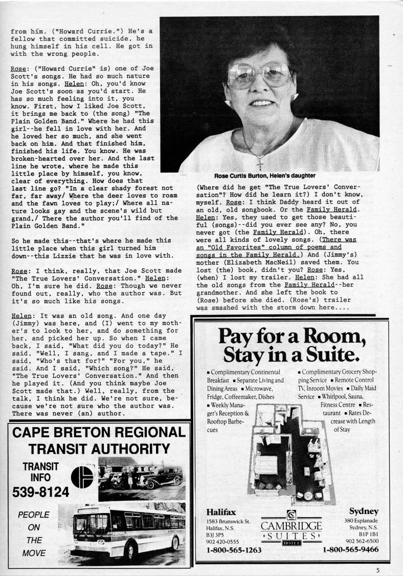 from him. ("Howard Currie.") He's a fellow that committed suicide, he hung himself in his cell. He got in with the wrong people. Rose: ("Howard Currie" is) one of Joe Scott's songs. He had so much nature in his songs. Helen: Oh, you'd know Joe Scott's soon as you'd start. He has so much feeling into it, you know. First, how I liked Joe Scott, it brings me back to (the song) "The Plain Golden Band." Where he had this girl--he fell in love with her. And he loved her so much, and she went back on him. And that finished him, finished his life. You know. He was broken-hearted over her. And the last line he wrote, where he made this little place by himself, you know, clear of everything. How does that last line go? "In a clear shady forest not far, far away/ Where the deer loves to roam and the fawn loves to play;/ Where all na? ture looks gay and the scene's wild but grand,/ There the author you'll find of the Plain Golden Band." So he made this--that's where he made this little place when this girl turned him down--this Lizzie that he was in love with. Rose; I think, really, that Joe Scott made "The True Lovers' Conversation." Helen: Oh, I'm sure he did. Rose: Though we never found out, really, who the author was. But it's so much like his songs. Helen: It was an old song. And one day (Jimmy) was here, and (I) went to my moth? er's to look to her, and do something for her, and picked her up. So when I came back, I said, "What did you do today?" He said. "Well, I sang, and I made a tape." I said, "Who's that for?" "For you," he said. And I said, "Which song?" He said, "The True Lovers' Conversation." And then he played it. (And you think maybe Joe Scott made that.) Well, really, from the talk. I think he did. We're not sure, be? cause we're not sure who the author was. There was never (an) author. CAPE BRETON REGIONAL TRANSIT AUTHORITY TRANSIT M' ft INFO iftfc 539-8124 PEOPLE ON THE MOVE Rose Curtis Burton, Heien's daughter (Where did he get "The True Lovers' Conver? sation"? How did he learn it?) I don't know, myself. Rose; I think Daddy heard it out of an old, old songbook. Or the Family Herald. Helen; Yes, they used to get those beauti? ful (songs)--did you ever see any? No, you never got (the Family Herald). Oh, there were all kinds of lovely songs. (There was an "Old Favorites" column of poems and songs in the Family Herald.) And (Jimmy's) mother (Elizabeth MacNeil) saved them. You lost (the) book, didn't you? Rose: Yes. (when) I lost my trailer. Helen: She had all the old songs from the Family Herald--her grandmother. And she left the book to (Rose) before she died. (Rose's) trailer was smashed with the storm down here.... Pay for a Room, StayinaSuite. ?? Complimentary Continental Breakfast ?? Separate Living and DiningAreas "Microwave, Fridge, Coffeemaker, Dishes ?? Weekly Mana? ger's Reception & Rooftop Barbe? cues Halifax 1583 Brunswick St. Halifax, N.S. B3J 3P5 902 420-0555 1-800-565-1263 ?? Complimentary Grocery Shop? ping Service ?? Remote Control T', Inroom Movies ?? Daily Maid Service ?? 'Tiirlpool, Sauna, Fitnesi Centre ?? Res? taurant ?? Rates De- - < crease with Length ' ' of Stay CAMBRIDGE S U IT E S Sydney 380 Esplanade Sydney, N.S. BIPIBI 902 562-6500 1-800-565-9466