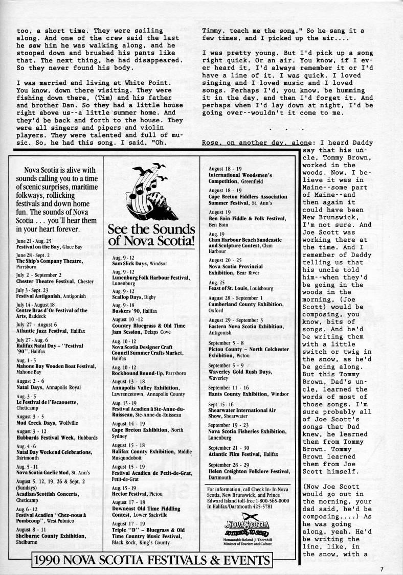 too, a short time. They were sailing along. And one of the crew said the last he saw him he was walking along, and he stooped down and brushed his pants like that. The next thing, he had disappeared. So they never found his body. I was married and living at White Point. You know, down there visiting. They were fishing down there, (Tim) and his father and brother Dan. So they had a little house right above us--a little summer home. And they'd be back and forth to the house. They were all singers and pipers and violin players. They were talented and full of mu? sic. So, he had this song. I said. "Oh, Timmy, teach me the song." So he sang it a few times, and I picked up the air.... I was pretty young. But I'd pick up a song right quick. Or an air. You know, if I ev? er heard it, I'd always remember it or I'd have a line of it. I was quick. I loved singing and I loved music and I loved songs. Perhaps I'd, you know, be humming it in the day, and then I'd forget it. And perhaps when I'd lay down at night, I'd be going over--wouldn't it come to me. Rose, on another dav. a Nova Scotia is alive with sounds calling you to a time of scenic surprises, maritime folkways, rollicking festivals and down home fun. The sounds of Nova Scotia ... you'll hear them in your heart forever. June21-Aug. 25 Festival on the Bay, Glace Bay June28-Sept. 2 The Ship's Company Theatre, Parrsboro July 2 - September 2 Chester Theatre Festival, Chester July 3-Sept. 23 Festival Antigonish, Antigonish July 14 - August 18 Centre Bras d'Or Festival of the Arts, Baddeck July 27 - August 6 Atlantic Jazz Festival, Halifax July27-Aug. 6 Halifax Natal Day - "Festival '90", Halifax Aug. 1 - 5 Mahone Bay Wooden Boat Festival, Mahone Bay August 2 - 6 Natal Days, Annapolis Royal Aug. 3-5 Le Festival de I'Escaouette, Cheticamp August 3 - 5 Mud Creek Days, Wolfs'ille August 3-12 Hubbards Festival Week, Hubbards Aug. 4 - 6 Natal Day Weekend Celebrations, Dartmouth Aug. 5-11 Nova Scotia Gaelic Mod, St. Ann's August 5, 12, 19, 26 & Sept. 2 (Sundays) Acadian/Scottish Concerts, Cheticamp Aug. 6-12 Festival Acadien "Chez-nous a Pombcoup", West Pubnico August 8-11 Shelburne County Exhibition, Shelburne See the Sounds of Nova Scotia! Aug. 9 -12 Sam Slick Days, Windsor Aug. 9-12 Lunenburg Folk Harbour Festival, Lunenburg Aug. 9-12 Scallop Days, Digby Aug. 9-18 Buskers '90, Halifax August 10 -12 Country Bluegrass & Old Time Jam Session, Delaps Cove Aug. 10 -12 Nova Scotia Designer Craft Council Summer Crafts Market, Halifax Aug. 10-12 Rockhound Round-Up, Parrsboro August 13-18 Annapolis Valley Exhibition, Lawrencetown, Annapolis County Aug. 13 -19 Festival Acadien a Ste-Anne-du- Ruisseau, Ste-Anne-du-Ruisseau August 14 - 19 Cape Breton Exhibition, North Sydney August 15-18 Halifax County Exhibition, Middle Musquodoboit August 15-19 Festival Acadien de Petit-de-Grat, Petit-de-Grat Aug. 15 -19 Hector Festival, Pictou August 17-18 Downcast Old Time FiddUng Contest, Lower Sackville August 17 - 19 Triple "D" - Bluegrass & Old Time Country Music Festival, Black Rock, King's County August 18-19 International Woodsmen's Competition, Greenfield August 18 - 19 Cape Breton Fiddlers Association Summer Festival, St. Ann's August 19 Ben Eoin Fiddle & Folk Festival, Ben Eoin Aug. 19 Clam Harbour Beach Sandcastle and Sculpture Contest, Clam Harbour August 20-25 Nova Scotia Provincial Exhibition, Bear River Aug. 25 Feast of St. Louis, Louisbourg August 28 - September 1 Cumberland County Exhibition, Oxford August 29 - September 3 Eastern Nova Scotia Exhibition, Antigonish September 5 - 8 Pictou County - North Colchester Exhibition, Pictou September 5-9 Waverley Gold Rush Days, Waverley September 11-16 Hants County Exhibition, Windsor Sept. 15-16 Shearwater International Air Show, Shearwater September 19 - 23 Nova Scotia Fisheries Exhibition, Lunenburg September 21-30 Atlantic Film Festival, Halifax September 28 - 29 Helen Creighton Folklore Festival, Dartmouth For information, call Check In: In Nova Scotia, New Brunswick, and Prince Edward Island toll-free 1-800-565-0000 In Halifax/Dartmouth 425-5781 1990 NOm SCOTIA FESTimLS & EVENTS lone; I heard Daddy say that his un? cle. Tommy Brown, worked in the woods. Now, I be? lieve it was in Maine--some part of Maine--and then again it could have been New Brunswick, I'm not sure. And Joe Scott was working there at the time. And I remember of Daddy telling us that his uncle told him--when they'd be going in the woods in the morning, (Joe Scott) would be composing, you know, bits of songs. And he'd be writing them with a little switch or twig in the snow, as he'd be going along. But this Tommy Brown, Dad's un? cle, learned the words of most of those songs. I'm sure probably all of Joe Scott's songs that Dad knew, he learned them from Tommy Brown. Tommy Brown learned them from Joe Scott himself. (Now Joe Scott would go out in the morning, your dad said, he'd be composing....) As he was going along, yeah. He'd be writing the line, like, in the snow, with a