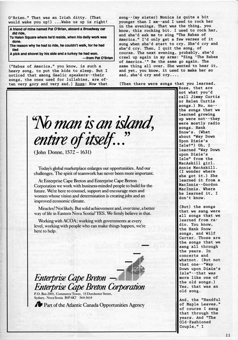 O'Brien." That was an Irish ditty. (That would wake you up!) ...Wake us up is right! A friend of mine named Pat O'Brlan, aboard a Broadway car did ride, To Halen Square where he'd reside, when his daily work was done. The reason why he had to ride, he couldn't walk, for he had tied A pick and shovel by his side and a turkey he had won. • from Pat O'Brlan ("Babes of America," you know, is such a heavy song, to put the kids to sleep. But I noticed that among Gaelic speakers--their songs, the ones used for lullabies, are of? ten very gory and very sad.) Rose: Now that "No man is an island, entire of itself..? (John Donne, 1572 - 1631) Today's global marketplace enlarges our opportunities. And our challenges. The spirit of teamwork has never been more important. At Enterprise Cape Breton and Enterprise Cape Breton Corporation we work with business-minded people to build for the future. We're here to counsel, support and encourage men and women whose vision and determination is creating jobs and an improved economic climate. Miracles.'' Not likely. But solid achievement and, over time, a better way of life in Eastern Nova Scotia.-* YES. We firmly believe in that. Working with ACOA; working with governments at every level, working with people who can make things happen, we're here to help. ;r ?? r p lit' tnterpfise Cape Breton • MMw Enterprise Cape Breton Corporation P.O. Box 2001, Commerce Tower, 15 Dorchester Street, Sydney, Nova Scotia B1P6K7 564-3614 iw Part of the Atlantic Canada Opportunities Agency song--(my sister) Monica is quite a bit younger than I am--and I used to rock her in the evenings. That was the thing, you know, this rocking bit. I used to rock her, and she'd ask me to sing "The Babes of America." I'd only get a few verses of it sung when she'd start to cry. She'd cry and she'd cry. Then, I quit the song, of course. The next evening, probably, she'd crawl up again in my arms: "Sing 'The Babes of America.'" Be the same go again. The same thing all over. She wanted to hear it, and yet, you know, it used to make her so sad, she'd cry and cry.... (Then there were songs that you learned, I Rose, that are not what you'd call Jimmy Curtis or Helen Curtis songs.) No, no-- the songs that we learned growing up were not--they were mostly radio songs. Hank Snow's. (What about "Way Down Upon Dixie's Isle?") Oh, I learned "Way Down upon Dixie's Isle" from the MacAskill girl. Annie MacAskill. (I wonder where she got it.) She learned it from a MacInnis- -Gordon Maclnnis. Where he learned it, I don't know. (But) the songs that we sang were all songs that we learned from ra? dio. You know, the Hank Snow songs, and Wilf Carter. Those are the songs that we sang all through the years. In concerts and whatnot. (But not that one--"Way Down upon Dixie's Isle"--that was more like one of the old songs.) Yes, that was an old song. And, the "Handful of Maple Leaves," of course I sang that through the years. And "The Old-Fashioned Couple," I