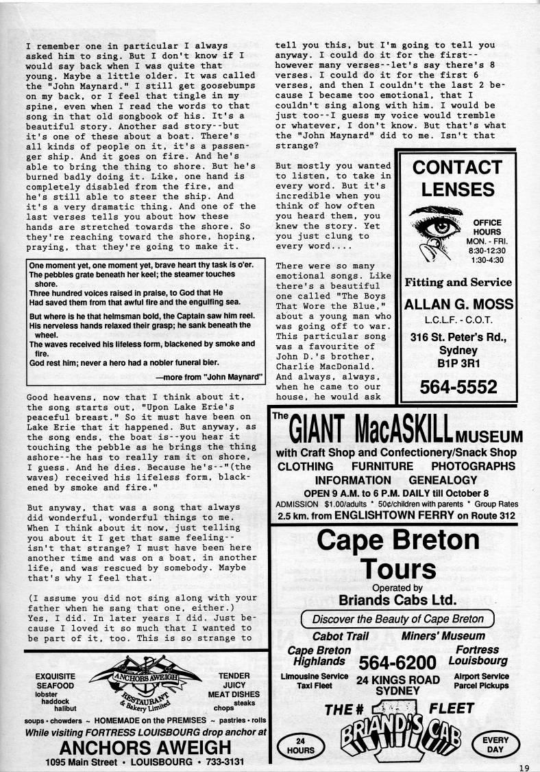 I remember one in particular I always asked him to sing. But I don't know if I would say back when I was quite that young. Maybe a little older. It was called the "John Maynard." I still get goosebumps on my back, or I feel that tingle in my spine, even when I read the words to that song in that old songbook of his. It's a beautiful story. Another sad story--but it's one of these about a boat. There's all kinds of people on it, it's a passen? ger ship. And it goes on fire. And he's able to bring the thing to shore. But he's burned badly doing it. Like, one hand is completely disabled from the fire, and he's still able to steer the ship. And it's a very dramatic thing. And one of the last verses tells you about how these hands are stretched towards the shore. So they're reaching toward the shore, hoping, praying, that they're going to make it. One moment yet, one moment yet, brave heart thy task is o'er. The pebbles grate beneath her keel; the steamer touches shore. Three hundred voices raised in praise, to God that He Had saved them from that awful fire and the engulfing sea. But where is he that helmsman bold, the Captain saw him reel. His nerveless hands relaxed their grasp; he sank beneath the wheel. The waves received his lifeless form, blackened by smoke and fire. God rest him; never a hero had a nobler funeral bier. • more from "John Maynard" Good heavens, now that I think about it, the song starts out, "Upon Lake Erie's peaceful breast." So it must have been on Lake Erie that it happened. But anyway, as the song ends, the boat is--you hear it touching the pebble as he brings the thing ashore--he has to really ram it on shore, I guess. And he dies. Because he's--"(the waves) received his lifeless form, black? ened by smoke and fire." But anyway, that was a song that always did wonderful, wonderful things to me. When I think about it now, just telling you about it I get that same feeling-- isn't that strange? I must have been here another time and was on a boat, in another life, and was rescued by somebody. Maybe that's why I feel that. (I assume you did not sing along with your father when he sang that one, either.) Yes, I did. In later years I did. Just be? cause I loved it so much that I wanted to be part of it, too. This is so strange to TENDER JUICY MEAT DISHES "'Sce'uS*' chops"*"""'" soups • chowders ~ HOMEMADE on the PREMISES ~ pastries • rolls While visiting FORTRESS LOUISBOURG drop anchor at ANCHORS AWEIGH 1095 Main Street • LOUISBOURG • 733-3131 tell you this, but I'm going to tell you anjrway. I could do it for the first-- however many verses--let's say there's 8 verses. I could do it for the first 6 verses, and then I couldn't the last 2 be? cause I became too emotional, that I couldn't sing along with him. I would be just too--I guess my voice would tremble or whatever, I don't know. But that's what the "John Maynard" did to me. Isn't that strange? But mostly you wanted to listen, to take in every word. But it's incredible when you think of how often you heard them, you knew the story. Yet you just clung to every word.... There were so many emotional songs. Like there's a beautiful one called "The Boys That Wore the Blue," about a young man who was going off to war. This particular song was a favourite of John D.'s brother, Charlie MacDonald. And always, always, when he came to our house, he would ask CONTACT LENSES OFFICE HOURS , MON. - FRI. 4 8:30-12:30 1:30-4:30 Fitting and Service ALLAN G. MOSS LC.LF. - C.O.T. 316 St. Peter's Rd., Sydney B1P3R1 564-5552 'GIANT MacASKILL MUSEUM with Craft Shop and Confectionery/Snack Shop CLOTHING FURNITURE PHOTOGRAPHS INFORMATION GENEALOGY OPEN 9 A.M. to 6 P.M. DAILY till October 8 ADMISSION $1.00/adults * 500/children with parents * Group Rates 2.5 km. from ENGLISHTOWN FERRY on Route 312 Cape Breton Tours operated by Briands Cabs Ltd. ( Discover the Beauty of Cape Breton ) Cabot Trail Miners' Museum Cape Breton Fortress Highlands 564-6200 louisbourg Limousine Service Taxi Fieet 24 KINGS ROAD SYDNEY Airport Service Parcei Picltups THE* d" .' • Y'fMk ' • ' (iiiiit 24N Ifimriri HOURSy X'''V M FLEET '/df?i' Viaf'ffc ' • ' tfJMy) fivERY y*' v??'