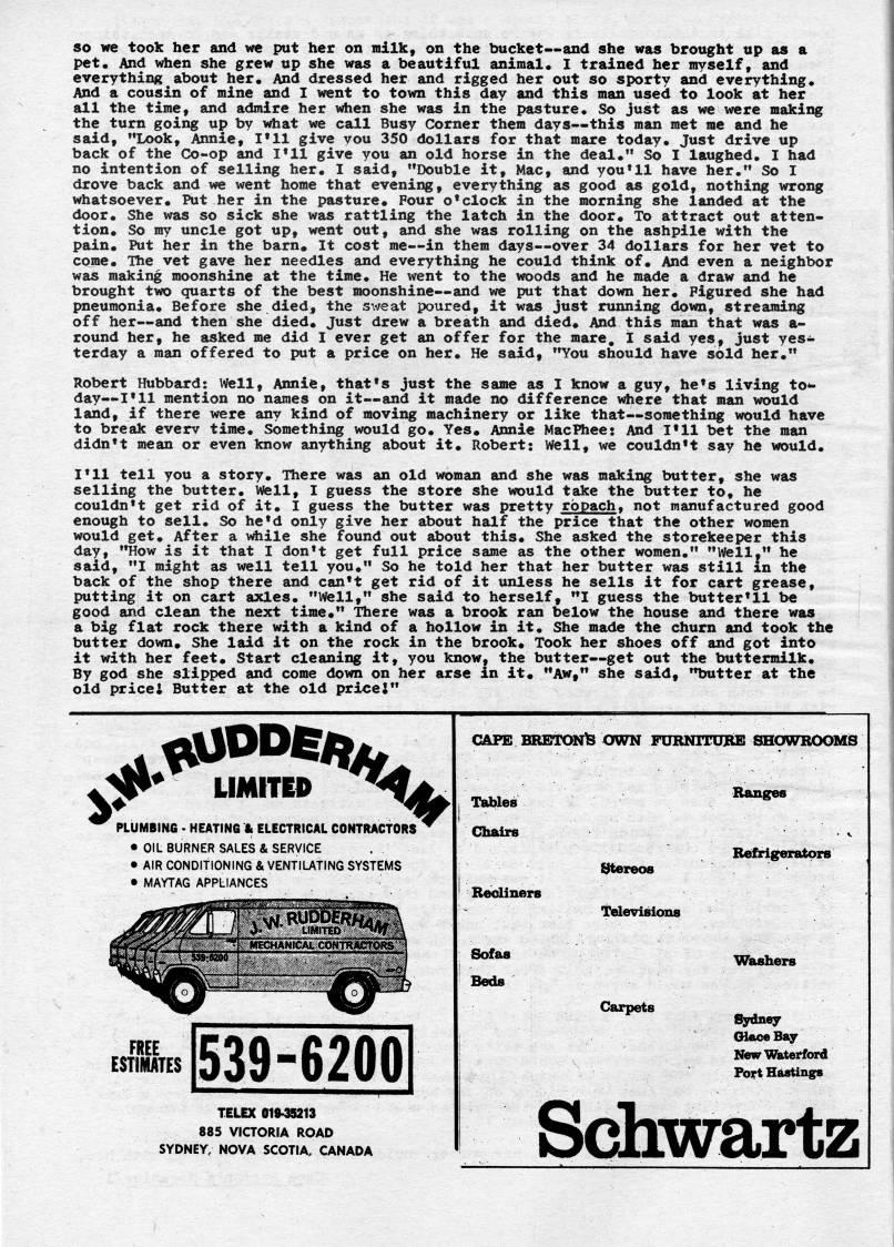 so we took her and we put her on milk, on the bucket • and she was brought up as a pet* And v'en she grew up she was a beautiful animal* I trained her myself, and everything about her* And dressed her and rigged her out so sporty and everything* And a cousin of raine and I went to town this day and this man used to look at her all the time, and admire her when she was in the pasture. So just as we were making the turn going up by vdiat we call Busy Corner thera days • this raan raet rae and he said, "Look, Annie, I'll give you 350 dollars for that raare today. Just drive up back of the Co-op and I'll give you an old horse in the deal." So I laughed. I had no intention of selling her* I said, "Double it, Mac, and you'll have her." So I drove back and we went home that evening, everything as good as gold, nothing wrong whatsoever* Put her in the pasture* Four o'clock in the morning she landed at the door* She was so sick she was rattling the latch in the door* To attract out atten? tion* So my uncle got up, went out, and she was rolling on the ashpile with the pain* Put her in the barn. It cost me • in them days • over 34 dollars for her vet to come. The vet gave her needles and everything he could think of. And even a neighbor was making moonshine at the time* He went to the woods and he made a draw and he brought two quarts of the best moonshine • and we put that down her* Figured she had pneumonia* Before she died, the sweat poured, it was just running down, streaming off her • and then she died. Just drew a breath and died. And this man that was a- round her, he asked me did I ever get an offer for the mare. I said yes, just yes? terday a man offered to put a price on her* He said, "You should have sold her*" Robert Hubbard: Well, Annie, that's just the same as I know a guy, he's living to-? day • I'll mention no names on it • and it made no difference vdiere that raan would land, if there were any kind of moving machinery or like that • something would have to break everv tirae* Something would go* Yes. Annie MacPhee: And I'll bet the man didn't mean or even know anything about it. Robert: Well, we couldn't say he would* I'll tell you a story* There was an old woman and she was making butter, she was selling the butter* Well, I guess the store she would take the butter to, he couldn't get rid of it* I guess the butter was pretty rbpach. not manufactured good enough to sell* So he'd only give her about half the price that the other women would get* After a v*iile she found out about this* She asked the storekeeper this day, "How is it that I don't get full price same as the other women." "well," he said, "I might as well tell you*" So he told her that her butter was still in the back of the shop there and can't get rid of it unless he sells it for cart grease, putting it on cart axles* "Wfell," she said to herself, "I guess the butter'll be good and clean the next time.** There was a brook ran below the house and there was a big flat rock there with a kind of a hollow in it* She raade the churn and took the butter down. She laid it on the rock in the brook. Took her shoes off and got into it with her feet. Start cleaning it, you know, the butter • get out the buttermilk* By god she slipped and come down on her arse in it. "Aw," she said, "butter at the old pricel Butter at the old priceJ" VJ'' tlMITEP '' PLUMBIMG . HEATING !> ELECTRICAL CONTRACTORS • OIL BURNER SALES & SERVICE • AIR CONDITIONING & VENTILATING SYSTEMS • MAYTAG APPLIANCES D? '' FREE ESTIMATES 539-6200 CAFE BREiX>N)3 OWN FURNITOBE SUCfWKOOMS Tables Chairs Recliners Sofas Beds {'reo8 Televisions Carpets TELEX 019-35213 885 VICTORIA ROAD SYDNEY, NOVA SCOTIA, CANADA Ranges Refrigerators Washers Sydney (H?ce Bay NewWatei'ford Port HastingB Schwartz