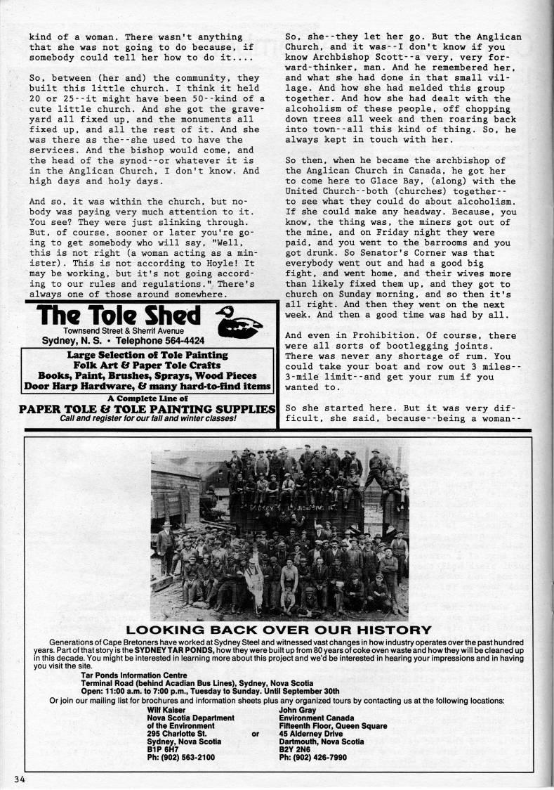 Published by Ronald Caplan on 1990/8/1 (302 reads)kind of a woman. There wasn't anything that she was not going to do because, if somebody could tell her how to do it.... So, between (her and) the community, they built this little church. I think it held 20 or 25--it might have been 50--kind of a cute little church. And she got the grave? yard all fixed up, and the monuments all fixed up, and all the rest of it. And she was there as the--she used to have the services. And the bishop would come, and the head of the synod--or whatever it is in the Anglican Church, I don't know. And high days and holy days. And so, it was within the church, but no? body was paying very much attention to it. You see? They were just slinking through. But, of course, sooner or later you're go? ing to get somebody who will say, "Well, this is not right (a woman acting as a min? ister) . This is not according to Hoyle! It may be working, but it's not going accord? ing to our rules and regulations." There's always one of those around somewhere. The Tole Shed ' Townsend Street & Sherrif Avenue Sydney, N. 8. ?? Telephone 564-4424 Large Selection of Tole Psdnting Folk Art & Paper Tole Crafts Books, Paint, Brushes, Sprays, Wood Pieces Door Harp Hardware, & many hard-to-find items A Complete Une of PAPER TOLE & TOLE PAINTING SUPPLIES Caii and register for our faii and winter classes! So, she--they let her go. But the Anglican Church, and it was--I don't know if you know Archbishop Scott--a very, very for? ward-thinker, man. And he remembered her, and what she had done in that small vil? lage. And how she had melded this group together. And how she had dealt with the alcoholism of these people, off chopping down trees all week and then roaring back into town--all this kind of thing. So, he always kept in touch with her. So then, when he became the archbishop of the Anglican Church in Canada, he got her to come here to Glace Bay, (along) with the United Church--both (churches) together-- to see what they could do about alcoholism. If she could make any headway. Because, you know, the thing was, the miners got out of the mine, and on Friday night they were paid, and you went to the barrooms and you got drunk. So Senator's Corner was that everybody went out and had a good big fight, and went home, and their wives more than likely fixed them up, and they got to church on Sunday morning, and so then it's all right. And then they went on the next week. And then a good time was had by all. And even in Prohibition. Of course, there were all sorts of bootlegging joints. There was never any shortage of rum. You could take your boat and row out 3 miles-- 3-mile limit--and get your rum if you wanted to. So she started here. But it was very dif? ficult, she said, because--being a woman-- LOOKING BACK OVER OUR HISTORY Generations of Cape Bretoners have worked at Sydney Steel and witnessed vast changes in how industry operates over the past hundred years. Part of that story is the SYDNEY TAR PONDS, how they were built up from 80 years of coke oven waste and how they will be cleaned up in this decade. You might be interested in learning more about this project and we'd be interested in hearing your impressions and in having you visit the site. Tar Ponds Information Centre Terminal Road (behind Acadian Bus Lines), Sydney, Nova Scotia Open: 11:00 a.m. to 7:00 p.m., Tuesday to Sunday. Until September 30th Or join our mailing list for brochures and information sheets plus any organized tours by contacting us at the following locations: Wilf Kaiser Nova Scotia Department of the Environment 295 Charlotte St. Sydney, Nova Scotia BIP 6H7 Ph: (902) 563-2100 John Gray Environment Canada Fifteenth Floor, Queen Square 45 Alderney Drive Dartmouth, Nova Scotia B2Y 2N6 Ph: (902) 426-7990 34