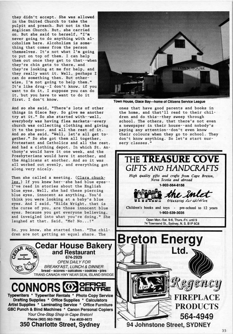 Published by Ronald Caplan on 1990/8/1 (254 reads)they didn't accept. She was allowed in the United Church to take the pulpit and preach. But not in the Anglican Church. But, she carried on. But she said to herself, "I'm never going to do anything with al? coholism here. Alcoholism is some? thing that comes from the person themselves. It's not what I'm going to put on top of them. I can help them out once they get to that--when they're chin gets to there, and they're looking at me for help, and they really want it. Well, perhaps I can do something then. But other? wise, I'm not going to help them." It's like drug--I don't know, if you want to do it, I suppose you can do it, but you have to want to do it first. I don't know. Town House, Glace Bay • home of Citizens Service League And so she said, "There's lots of other things in Glace Bay. So give me another try at it." So she started with--well, everybody was having flea markets--every church was collecting clothing and giving it to the poor, and all the rest of it. And so she said, "Well, let's all get to? gether." So she got them all together, Protestant and Catholics and all the rest. And had a clothing depot. In which St. An? thony's would have it one week, and the Presbyterians would have it another, and the Anglicans at another. And so it was all worked out evenly, and everything got along very nicely. Then she called a meeting. (Clara chuck? les .) If you knew her--she had blue eyes-- I've read in stories about the English blue eyes. Well, she had these piercing blue eyes, innocent as anything. You'd think you were looking at a baby's blue eyes. And I said, "Hilda Wright, that is the curse of you, are those innocent blue eyes. Because you get everyone believing, and inveigled into what you're doing." She laughed at that. Said, "Me? No...!" So, you know, she started then. "The chil? dren are not getting an equal share. ones that have good parents and books in the home, and that'll read to their chil? dren and do this--they sweep through school. The others, that there's not even a newspaper in their house--and nobody's paying any attention--don't even know their colours when they go to school. They don't know anything. So let's start nur? sery classes." The Cedar House Bakery and Restaurant 674-2929 OPEN DAILY FOR BREAKFAST, LUNCH & DINNER bread • scones • oatcakes • cookies • pies TRANS-CANADA HWY NEAR SEAL ISLAND BRIDGE CONNORS @??'' Typewriters * Typewriter Rentals * Photo Copy Service Drafting Supplies * Office Supplies * Calculators Artist Supplies * Laminating Service * Office Furniture GBC Punch & Bind Machines * Canon Personal Copiers Your One-Stop Shop in Cape Breton! Phone (902) 562-79(X) Fax #539-8672 350 Charlotte Street, Sydney THE TREASURE COVE GIFTS AND HANDCRAFTS High quality gifts and crafts from Cape Breton, Nova Scotia and abroad 1-902-564-8158 Children's books and toys - pre-school to 12 years 1-902-539-3035 Open Mon.-Sat. 9-6. Thurs.-Fri. until 9 74 Townsend St., Sydney, N. S. 81P 5C8 Breton Energy Ltd FIREPLACE PRODUCTS 564-4949 94 Johnstone Street, SYDNEY