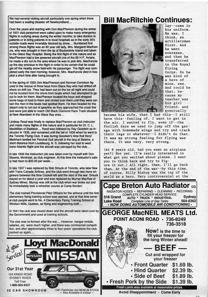 Published by Ronald Caplan on 1990/8/1 (206 reads)We had several visiting aircraft particularly one spring when there had been a sealing disaster off Newfoundland.... Over the years and starting with Don MacPherson during the winter of 1931 club personnel were called upon to make many emergency flights to outlying areas during the winter months; to take doctors to patients or to bring patients in to local hospitals as in the early 30's outside roads were invariably bkx'ked by snow.... Numbered first among these flights was an 80 year old lady, Mrs. Margaret MacKen? zie, who was brought in from the tip of Boularderie Island and taken to the Glace Bay Hospital. Being the first flight of this nature and as MacPherson had a low powered aircraft one of the 85 H.P. Avians, he made a dry am to the area where he was to pick Mrs. MacKenzie up the day previous to the flight in order to be certain that he could get off the nearby snow field with his passenger. The flight was com? pleted early the next morning; however, Mrs. MacKenzie died in hos? pital a short time after being brought in. In the spring of 1933 Don MacPherson and Norman Dennison fig? ured in the rescue of three boys from Glace Bay who had drifted off shore on drift ice. They had been out on the ice all night and could not be located from the shore from boats which had attempted to go out to look for them. MacPherson located the boys and dropped some bags of food to them and circled over them until they were cer? tain the men in the boats had spotted them. He then headed for the airport only to mn out of gasoline as they approached the coast line and were just able to reach Old Black Diamond Race Track situated at New Aberdeen in the Glace Bay area.... Lindsay Rood was finally to replace MacPherson as club instmctor and made many flights of this nature and in particular for Dr. C. L. MacMillan of Baddeck.... Rood was followed by Ray Goodwin as in? stmctor in 1935, and remained until the fall of 1936 when he went to the Toronto Flying Club. It was during Goodwin's time that Beryl Markham landed her Percival Gull aircraft in the bog at Baleine, a short distance from Louisbourg, N. S. following her east to west trans-Atlantic flight and the aircraft was salvaged by the club.... In late 1936 the instmction job was taken over by myself with Don Skeene, Montreal, as club engineer. At this time the instmctor's sala? ry had risen to $30.00 per week.... In late 1937 I was replaced by Bob Smuck of Toronto, who later flew with Trans Canada Airlines, and the club went through two more en? gineers between the time Cockell left and the start of the war. Smuck stayed on for about a year and was replaced by Murray MacRae of Sydney Mines. Murray was still at the club when war broke out and he immediately took a refresher course at Camp Borden. The club trained Provisional Pilot Officers for the airforce until the first elementary flying training school was opened, and at that time sever? al club people went to No. 4 Elementary Flying Training School at Windsor Mills, Quebec, as flying and engineering staff.... In 1941 the club was closed down and the aircraft were taken over by the Government and used at training schools. The club was re-formed after the war.... However, hangar rentals, salaries, etc. were much higher, and there was commercial competi? tion, and after approximately three to four years' operations the club packed up again Lkyyd MacDonald NISSAN rn'hl Our 31st Year 124 KINGS ROAD SYDNEY RIVER Toll Free 1-800-565-9427 20 CAR SHOWROOM Bill MacRitchie Continues: lay--came in his uniform. He was, I think, an artilleryman first. And he went overseas, and then he transferred to the Royal Flying Corps. So he was kind of a hero of mine, see. And could be that, be? cause my teacher was his girl friend, and eventually became his wife, that I had this--I still have this--feeling of, I want to get in the air. I wanted to fly, even if--the foolish days we used to jump off the gar? age with homemade wings and try and crack their legs or whatever--I didn't do that. It was my strong feeling for flying was there. It was very, very strong. (At 8 years old, had you seen an airplane yet?) Not yet. (I'm really interested in what got you excited about planes. I want you to think back and try to fig? ure it out.) All right, then, I'll go back then. At the end of the war--by this time, of course, Billy Bishop was the top of the world as a hero. Very controversial at the CO. Cape Breton Auto Radiator RADIATOR HOSES • REPAIRING • CLEANING • RECORING '-o r. ' COMPLETE CYLINDER HEAD SERVICE _ . 518 Grand auto * truck * industrial bydney Lake Road Complete Line of Gas Tanks 564-6362 • NOW DOING AUTOMOBILE AIR CONDITIONING ?? 1991 Pathfinder 4x4 NOW IN STOCK • Also Available in 4-Door • GEORGE MacNEIL MEATS Ltd. POINT ACONI ROAD ?? 736-8249 736-3518 Now! is the time to fill your freezer for the long Winter ahead! • BEEF • Cut and wrapped for your freezer Front Quarter $1.69 lb. Hind Quarter $2.39 lb. • Side of Beef $1.89 lb. Fresh Pork by the Side $1.39 lb. Fresh Lamb also available at reasonable prices. Avoid Disappointment - Come Early