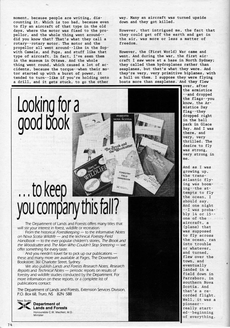 Published by Ronald Caplan on 1990/8/1 (177 reads)moment, because people are writing, dis? counting it. Which is too bad, because even to fly an aircraft of that type in the old days, where the motor was fixed to the pro? peller, and the whole thing went around-- did you know that? That's what they call a rotary--rotary motor. The motor and the propeller all went around--like in the Sop- with Camels, and Pups, and stuff like that type of aircraft. In fact, I've seen them in the museum in Ottawa. And the whole thing went round, which caused a lot of ac? cidents, because the torque--when their mo? tor started up with a burst of power, it tended to turn--like if you're holding onto a drill, and it gets stuck, to go the other ...tokeep you company thisfell? The Department of Lands and Forests offers many titles that will stir your interest in forest, wildlife or recreation. From the historical Forestkeeping • to the informative Notes on Nova Scotia Wildlife • and the technical Forestry Field Handbook • to the ever popular children's stories. The Brook and the Woodcutter and The Man Who Couldn't Stop Sneezing • we offer something for every taste. And you needn't travel far to pick up our publications • these and many more are available at Pages, The Downtown Bookstore, 361 Charlotte Street, Sydney. We also publish Lands and Forests Research Notes, Research Reports and Technical Notes • periodic reports on results of forestry and wildlife studies conducted by the Department. For more information on these reports, or a complete list of publications contact: The Department of Lands and Forests, Extension Services Division, P.O. Box 68, Truro, NS B2N 5B8 'rsi' Department of ''' Lands and Forests way. Many an aircraft was turned upside down and they got killed. However, that intrigued me, the fact that they could get off the earth and get in the air, was more or less a matter of freedom. However, the (First World) War came and went. And during the war, the first air? craft I saw were at a base in North Sydney: they called them hydroplanes rather than seaplanes, but that's what they were. And they're very, very primitive biplanes, with a hull on them. I suppose they were flying boats more than seaplanes. And they flew over, after the armistice --and dropped the flags--you know, the Ar? mistice Day flag--they dropped right in the ball park in Glace Bay. And I was there, and very, very thrilled. The desire to fly was strong, very strong in me. And as I was growing up, the trans- Atlantic fly? ing was boom? ing- -the at? tempts to fly the ocean, I should say. And one night --I was proba? bly 14 or 15-- one of the aircraft, a (plane) that was supposed to fly across the ocean, ran into trouble or whatever, and turned, flew over the town, and eventually landed in a field down in Parrsboro, in southern Nova Scotia. And that's a re? corded flight. Well, it was a pioneer-- really start? ed- -beginning of everything.