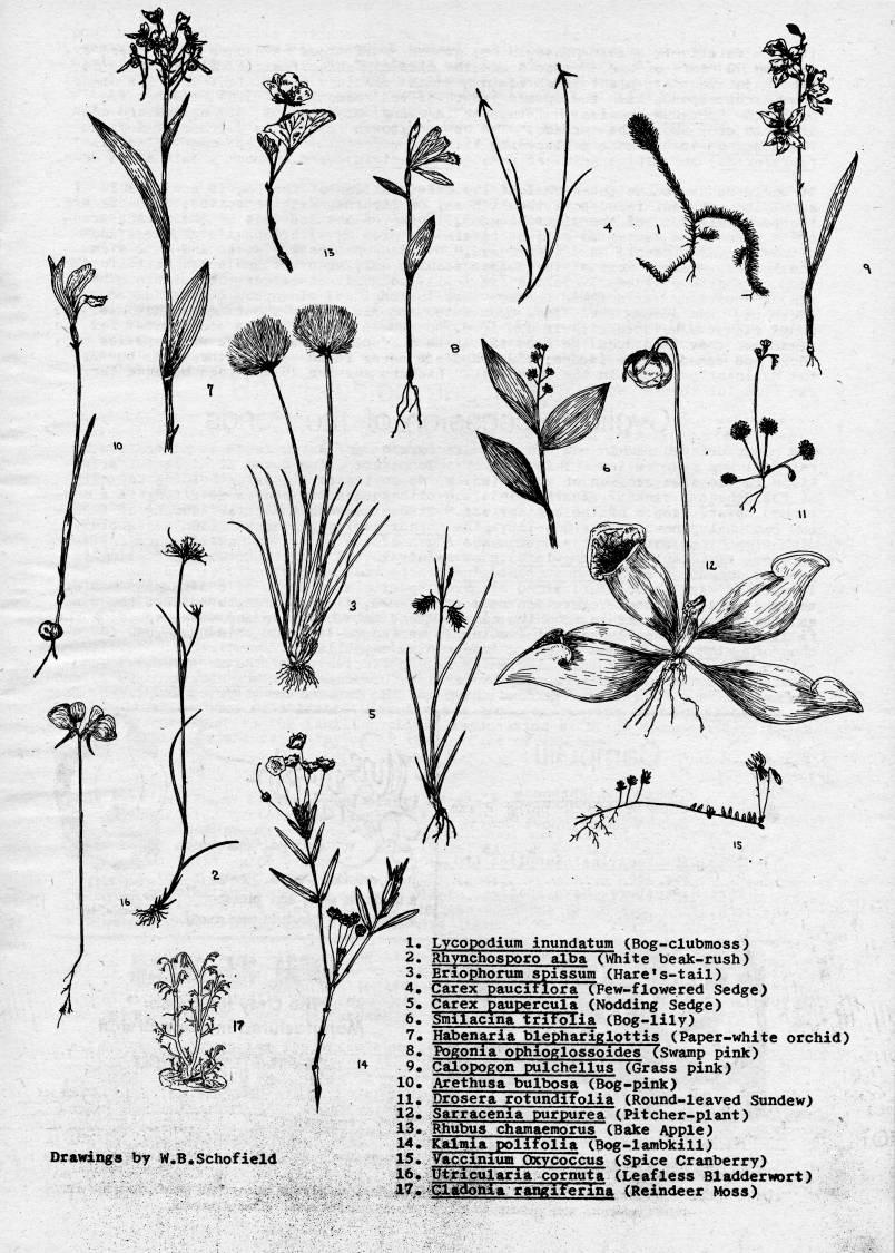 Published by Ronald Caplan on 1975/12/1 (260 reads)Drawings by W.B.Schofield 1. Lycopodium inundatum (Bog-clubmoss) 2. Rhynchosporo alba (White beak-rush) 3. Eriophortun spissum (Hare's-tail) 4* Carex paucitlora (Few-flowered Sedge) 5* Carex paupercula (Nodding Sedge) 6* <;milacina trifolia (Bog-lily) 7* Habenaria blephariglottis (Paper-white orchid) 8* Pogonia ophioglossoides Tswamp pink) 9* Calopogon pulchellus (Grass pink) 10* Arethusa bulbosa (Bog-pink) 11. Drosera rotundifolia (Round-leaved Sundew) 12* Sarracenia purpurea (Pitcher-piant) s 13. Rhubus chamaemorus (Bake Apple) 14. Kalmia polifolia (Bog-lambkill) 15. Vaccinium Oxycoc'cus (Spice Cranberry) 16. Utricularia cornuta (Leafless Bladderwort) 17* Cladonia rangiferina (Reindeer Moss)