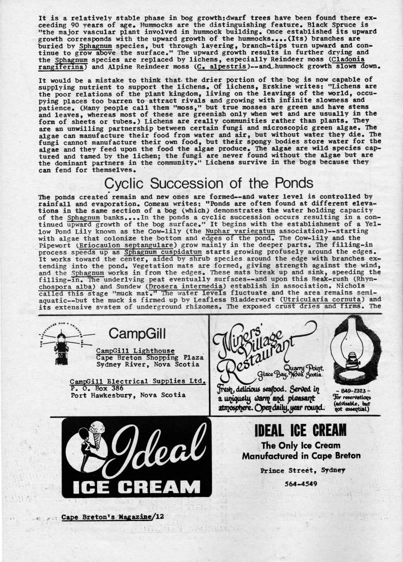 Published by Ronald Caplan on 1975/12/1 (291 reads)It is a relatively stable phase in bog growth:dwarf trees have been found there ex? ceeding 90 years of age. Hummocks are the distinguishing feature* Black Spruce is "the major vascular plant involved in hummock building* Once established its upward growth corresponds with the upward growth of the hummocks***.(Its) branches are buried by Sphagnum species, but through layering, branch-tips turn upward and con? tinue to grow above the surface." The upward growth results in further drying and the Sphagnum species are replaced by lichens, especially Reindeer moss (Cladonia rangiferina) and Alpine Reindeer moss (C* alpestris) • and, huramock growth slows down* It would be a mistake to think that, the drier portion of the bog is now capable of supplying nutrient to support the lichens* Of lichens, Erskine writes: "Lichens are the poor relations of the plant kingdom, living on the leavings of the world, occu? pying places too barren to attract rivals and growing with infinite slowness and patience* (Many people call them "moss," but true mosses are green and have stems and leaves, whereas most of these are greenish only when wet and are usually in the form of sheets or tubes*) Lichens are really communities rather than plants* They are an unwilling partnership between certain fungi and microscopic green algae* The algae can manufacture their food from water and air, but without water they die* The fungi cannot manufacture their own food, but their spongy bodies store water for the algae and they feed upon the food the algae produce* The algae are wild species cap? tured and tamed by the lichen; the fungi are never found without the algae but are the dominant partners in the community*" Lichens survive in the bogs because they can fend for themselves* Cyclic Succession of the Ponds The pohds created remain and new ones are formed • and water level is controlled by rainfall and evaporation* Comeau writes: "Ponds are often found at different eleva? tions in the same section of a bog (v'ich) demonstrates the water holding capacity of the Sphagnum banks.,..In the ponds a cyclic succession occurs resulting in a con? tinued upward growth of the bog surface." It begins with the establishment of a Yel? low Pond Lily known as the Cow-lily (the Nuphar variegatum association) • starting with algae that colonize the bottom and edges of the pond. The Cow-lily and the Pipewort (Eriocaulon septangulare) grow mainly in the deeper parts. The filling-in process speeds up as Sphagnum cuspidatum starts growing profusely around the edges. It works toward the center, aided by shrub species around the edge with branches ex? tending into the pond. Vegetation mats are formed, giving strength against the wind, and the Sphagnum works in from the edges. These mats break up and sink, speeding the filling-m. The underlying peat eventually surfaces • and upon this Beak-rush (Rhyn- chospora alba) and Sundew (Drosera intermedia) establish in association. Nichols called this stage "muck mat." The water levels fluctuate and the area remains semi- aquatic • but the muck is firmed up by Leafless Bladderwort (Utricularia cornuta) and its extensive system of underground rhizomes. The exposed crust dries and tirms. The : • CampGill CampGill Lighthouse Cape Breton Shopping Plaza Sydney River, Nova Scotia CampGill Electrical Supplies Ltd. P. 0. Box 386 Port Hawkesbury, Nova Scotia 'J''''IS' IDEAL ICE CREAM The Only Ice Cream Manufactured in Cape Breton Prince Street, Sydney 564-4549 Cape Breton's Magazine/12