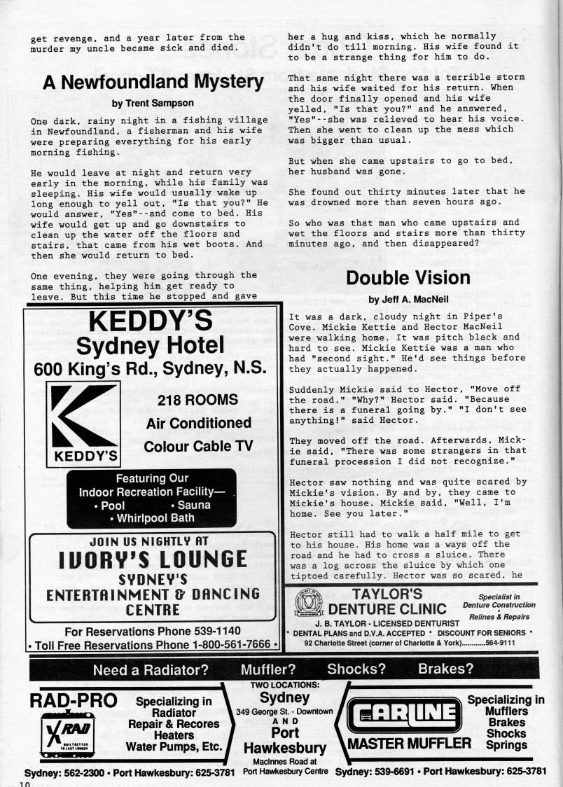 get revenge, and a year later from the murder my uncle became sick and died. A Newfoundland Mystery by Trent Sampson One dark, rainy night in a fishing village in Newfoundland, a fisherman and his wife were preparing everything for his early morning fishing. He would leave at night and return very early in the morning, while his family was sleeping. His wife would usually wake up long enough to yell out, "Is that you?" He would answer, "Yes"--and come to bed. His wife would get up and go downstairs to clean up the water off the floors and stairs, that came from his wet boots. And then she would return to bed. One evening, they were going through the same thing, helping him get ready to leave. But this time he stopped and gave KEDDY'S Sydney Hotel 600 King's Rd., Sydney, N.S. KEDDY'S 218 ROOMS Air Conditioned Colour Cable TV Featuring Our Indoor Recreation Facility • • Pool • Sauna • Whirlpool Bath JOIN US NIGHTLY AT lUORV'S LOUNGE SVDNEVS ENTERTAINMENT & DANCING CENTAE For Reservations Phone 539-1140 Toll Free Reservations Phone 1-800-561-7666 ?? her a hug and kiss, which he normally didn't do till morning. His wife found it to be a strange thing for him to do. That same night there was a terrible storm and his wife waited for his return. When the door finally opened and his wife yelled, "Is that you?" and he answered, "Yes"--she was relieved to hear his voice. Then she went to clean up the mess which was bigger than usual. But when she came upstairs to go to bed, her husband was gone. She found out thirty minutes later that he was drowned more than seven hours ago. So who was that man who came upstairs and wet the floors and stairs more than thirty minutes ago, and then disappeared? Double Vision by Jeff A. MacNeil It was a dark, cloudy night in Piper's Cove. Mickie Kettie and Hector MacNeil were walking home. It was pitch black and hard to see. Mickie Kettie was a man who had "second sight." He'd see things before they actually happened. Suddenly Mickie said to Hector, "Move off the road." "Why?" Hector said. "Because there is a funeral going by." "I don't see anything!" said Hector. They moved off the road. Afterwards, Mick? ie said, "There was some strangers in that funeral procession I did not recognize." Hector saw nothing and was quite scared by Mickie's vision. By and by, they came to Mickie's house. Mickie said, "Well, I'm home. See you later." Hector still had to walk a half mile to get to his house. His home was a ways off the road and he had to cross a sluice. There was a log across the sluice by which one tiptoed carefully. Hector was so scared, he IkS' TAYLOR'S DENTURE CLINIC J. B. TAYLOR - LICENSED DENTURIST DENTAL PLANS and D.V.A. ACCEPTED * DISCOUNT FOR SENIORS 92 Cliarlotte Street (corner of Ciiarlotte & Yorl<) 564-9111 Specialist in Denture Construction Reiines & Repairs Need a Radiator? Muffler? Shocks? Brakes? TWO LOCATIONS: RAD-PRO Sydney: 562-2300 in Sydney 349 George St. - Downtown i AND Port Hawkesbury Maclnnes Road at Port Hawkesbury: 625-3781 Port Hawkesbury Centre Sydney: 539-6691 • Port Hawkesbury: 625-3781 Specializing in Radiator Repair & Recores Heaters Water Pumps, Etc. Specializing in Mufflers Brakes Shocks MASTER MUFFLER Springs fagingii