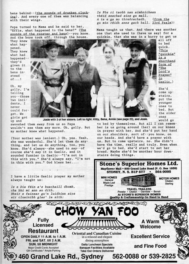 hens behind--(the sounds of drunken cluck? ing) . And every one of them was balancing with their wings. Papa turned to Mama and he said to her, "Effie, what happened to the hens?" (The sounds of the rooster and hens)--vou know. And the boys took off, through the house. They knew what hap? pened. They knew what had happened-- they'd given it to the hens in? stead of...! Oh, my golly, I'm telling you--those two inci? dents , I never could for? get . We girls got up and Is Fds ri taobh nan aimhnichean thSid seachad sios gu mall, A ta e ga mo thredrachadh, (from the gu min riidh anns gach ball. 23rd Psalm)) Mama taught us that. And there was another one that she used to (have us say) for a quickie, that she was in a hurry to get us Josie with 3 of her sisters. Left to right: swooshed them away from us so Papa wouldn't see them any more. Oh, golly. But my mother knew what happened. (Your mother was lenient.) Oh, yes. Yeah, she was wonderful. She'd let them do any? thing, and let us do anything, too, you know. She'd always--she used to say--of course she'd say it in Gaelic, and it sounded funnier in Gaelic--"I'm not in this with you." She'd always say, "I'm not in this with you." God bless her.... I have a little Gaelic prayer my mother always taught us: Is e Dia fSin a's buachaill dhomh, cha bhi mi ann an dith. Bheir e fainear gu'n luidhinn sios air cluainibh glas' le slth: She'd come up? stairs , put the younger ones to bed. But the older ones Kitty, Bena, Annie (see page 23), andJosle. would go to bed by themselves. But all I can remem? ber is us going around (her) on our knees in prayer with her. And she'd put her hand on our shoulders, sort of--you know, on our heads. And she'd have a prayer with us. But to come upstairs, no. She didn't have the time, really and truly. Even when we'd go to bed, she'd start to set her bread. Maybe she'd be another hour down? stairs doing things. Stone's Superior Homes Ltd. Mayflower Blall • 800 Grand Lake Road (P. O. Box 1659) SYDNEY, N. S. BIP 6T7 '' 564-9095 MOTOR HOMES Citation Sterling TRAVEL TRAILERS Prowler • Citation • Glendale • Bonair At STONE'S SUPERIOR HOMES Quality &: Craftsmanship Go Hand in Hand CflOW VAN f00 ' LiSS's'ed ''''''' prjr/ Restaurant ''''' OPEN DAILY 11 A.M. to 1 A.M. FRI. and SAT. till 2 A.M. SUN. till MIDNIGHT fijViNT" Major Credit Cards Accepted iy' Gift Certificates * Ample Parl