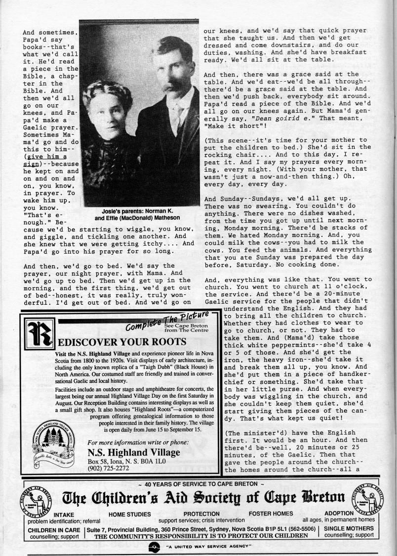 And sometimes,| Papa'd say books--that's what we'd call| it. He'd read a piece in thej Bible, a chap? ter in the Bible. And then we'd all go on our knees, and Pa? pa'd make a Gaelic prayer.| Sometimes Ma? ma'd go and doj this to him- (give him a sign)--because I he kept on and| on and on and on, you know, in prayer. To wake him up, you know. "That's e- nough." Be? cause we'd be starting to wiggle, you know, and giggle, and tickling one another. And she knew that we were getting itchy.... And Papa'd go into his prayer for so long. And then, we'd go to bed. We'd say the prayer, our night prayer, with Mama. And we'd go up to bed. Then we'd get up in the morning, and the first thing, we'd get out of bed--honest, it was really, truly won? derful. I'd get out of bed. And we'd go on Josie's parents: Norman K. and Effie (MacDonald) Matheson CoW flexure our knees, and we'd say that quick prayer that she taught us. And then we'd get dressed and come downstairs, and do our duties, washing. And she'd have breakfast ready. We'd all sit at the table. And then, there was a grace said at the table. And we'd eat--we'd be all through-- there'd be a grace said at the table. And then we'd push back, everybody sit around. Papa'd read a piece of the Bible. And we'd all go on our knees again. But Mama'd gen? erally say, "Dean goirid e." That meant, "Make it short"! (This scene--it's time for your mother to put the children to bed.) She'd sit in the rocking chair.... And to this day, I re? peat it. And I say my prayers every morn? ing, every night. (With your mother, that wasn't just a now-and-then thing.) Oh, every day, every day. And Sunday--Sundays, we'd all get up. There was no swearing. You couldn't do anything. There were no dishes washed, from the time you got up until next morn? ing, Monday morning. There'd be stacks of them. We hated Monday morning. And, you could milk the cows--you had to milk the cows. You feed the animals. And everything that you ate Sunday was prepared the day before, Saturday. No cooking done. And, everything was like that. You went to church. You went to church at 11 o'clock, the service. And there'd be a 20-minute Gaelic service for the people that didn't understand the English. And they had -ape t from Tlie Centre EDISCOVER YOUR ROOTS Visit the N.S. Highland Village and experience pioneer life in Nova Scotia from 1800 to the 1920s. Visit displays of early architecture, in? cluding the only known replica of a "Taigh Dubh" (Black House) in North America. Our costumed staff are friendly and trained in conver? sational Gaelic and local history. Facilities include an outdoor stage and amphitheatre for concerts, the largest being our annual Highland Village Day on the first Saturday in August. Our Reception Building contains interesting displays as well as a small gift shop. It also houses "Highland Roots" • a computerized program offering genealogical information to those people interested in their family history. The village is open daily from June 15 to September 15. For more information write or phone: N.S. Highland Village Box 58, lona, N. S. BOA ILO (902) 725-2272 to bring all the children to church. Whether they had clothes to wear to go to church, or not. They had to take them. And (Mama'd) take those thick white peppermints--she'd take 4 or 5 of those. And sh''d get the iron, the heavy iron--she'd take it and break them all up, you know. And she'd put them in a piece of handker? chief or something. She'd take that in her little purse. And when every? body was wiggling in the church, and she couldn't keep them quiet, she'd start giving them pieces of the can? dy. That's what kept us quiet! (The minister'd) have the English first. It would be an hour. And then there'd be--well, 20 minutes or 25 minutes, of the Gaelic. Then that gave the people around the church-- the homes around the church--all a ~ 40 YEARS OF SERVICE TO CAPE BRETON ~ QHfc CHlftlbrcn'H Atir 'ocietg of (Hape IBreton r' INTAKE HOME STUDIES PROTECTION FOSTER HOMES ADOPTION problem identification; referral support services; crisis intervention all ages, in permanent homes CHILDREN IN CARE I Suite 7, Provincial Building, 360 Prince Street, Sydney, Nova Scotia BIP 5L1 (562-5506) I SINGLE MOTHERS counselling; support I THE COMMUNITY'S RESPONSIBILITY IS TO PROTECT OUR CHILDREN I counselling; support 9 "A UNITED WAY SERVICE AGENCY"