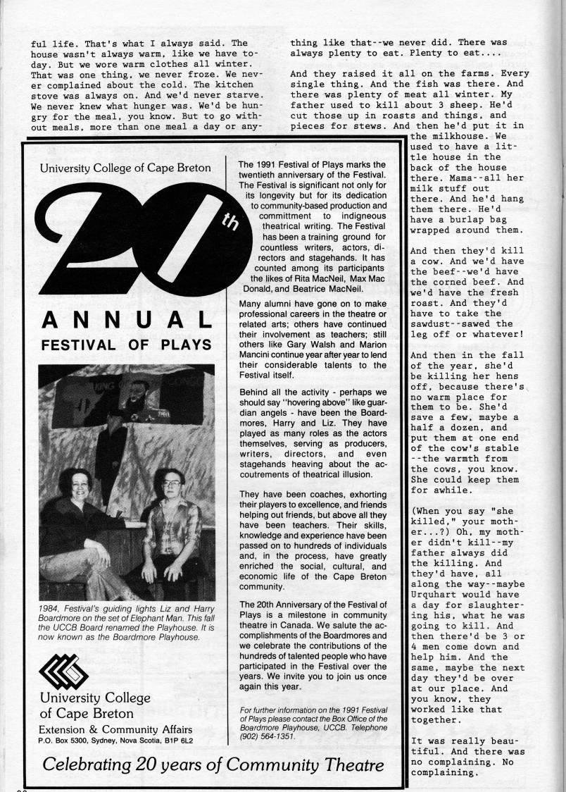 ful life. That's what I always said. The house wasn't always warm, like we have to? day. But we wore warm clothes all winter. That was one thing, we never froze. We nev? er complained about the cold. The kitchen stove was always on. And we'd never starve. We never knew what hunger was. We'd be hun? gry for the meal, you know. But to go with? out meals, more than one meal a day or any- University College of Cape Breton ANNUAL FESTIVAL OF PLAYS 1984, Festival's guiding lights Liz and Harry Boardmore on the set of Elephant Man. This fall the UCCB Board renamed the Playhouse. It is now known as the Boardmore Playhouse. University College of Cape Breton Extension & Community Affairs P.O. Box 5300, Sydney, Nova Scotia, BIP 6L2 Celebrating 20 years of Communify Theatre thing like that--we never did. There was always plenty to eat. Plenty to eat.... And they raised it all on the farms. Every single thing. And the fish was there. And there was plenty of meat all winter. My father used to kill about 3 sheep. He'd cut those up in roasts and things, and pieces for stews. And then he'd put it in I the milkhouse. We used to have a lit? tle house in the back of the house there. Mama--all her milk stuff out there. And he'd hang them there. He'd have a burlap bag wrapped around them. And then they'd kill a cow. And we'd have the beef--we'd have the corned beef. And we'd have the fresh roast. And they'd have to take the sawdust--sawed the leg off or whatever! And then in the fall of the year, she'd be killing her hens off, because there's no warm place for them to be. She'd save a few, maybe a half a dozen, and put them at one end of the cow's stable --the warmth from the cows, you know. She could keep them for awhile. (When you say "she killed," your moth? er...?) Oh, my moth? er didn't kill--my father always did the killing. And they'd have, all along the way--maybe Urquhart would have a day for slaughter? ing his, what he was going to kill. And then there'd be 3 or 4 men come down and help him. And the same, maybe the next day they'd be over at our place. And you know, they worked like that together. It was really beau? tiful. And there was no complaining. No complaining. The 1991 Festival of Plays marks the twentieth anniversary of the Festival. The Festival is significant not only for its longevity but for its dedication to community-based production and committment to indigneous theatrical writing. The Festival has been a training ground for countless writers, actors, di? rectors and stagehands. It has counted among its participants the likes of Rita MacNeil, Max Mac Donald, and Beatrice MacNeil. Many alumni have gone on to make professional careers in the theatre or related arts; others have continued their involvement as teachers; still others like Gary Walsh and Marion Mancini continue year after year to lend their considerable talents to the Festival itself. Behind all the activity - perhaps we should say "hovering above" like guar? dian angels - have been the Board- mores, Harry and Liz. They have played as many roles as the actors themselves, serving as producers, writers, directors, and even stagehands heaving about the ac? coutrements of theatrical illusion. They have been coaches, exhorting their players to excellence, and friends helping out friends, but above all they have been teachers. Their skills, knowledge and experience have been passed on to hundreds of individuals and, in the process, have greatly enriched the social, cultural, and economic life of the Cape Breton community. The 20th Anniversary of the Festival of Plays is a milestone in community theatre in Canada. We salute the ac? complishments of the Boardmores and we celebrate the contributions of the hundreds of talented people who have participated in the Festival over the years. We invite you to join us once again this year. For further information on the 1991 Festival of Plays please contact the Box Office of the Boardmore Playhouse, UCCB. Telephone (902) 564-1351.
